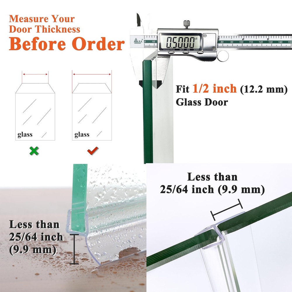 Frameless shower door seal strip is shower door water stopper, water sealer, swing shower door sealers for door frame, bottom door seal, door seals for exterior doors, door corner seals, door bottom seal strip stopper, glass door seal strip, overhead door bottom seal, shower sealer, sliding frameless shower door frame seal strip, butecare frameless shower door bottom seal, glass shower door side seal strip 1/2 inch, shower door bottom seal strip, shower rubber seal strip, glass shower door seal strip 1/4 inch, glass shower door bottom seal strip, bottom seal for glass shower door, sliding shower door 3/8 inch glass, frameless shower door swing, shower squeeze for glass door and tile, shower leak seal strip, adhesive shower door seal 1/2 inch. Open seals new magnetic glue-free single front drip rail rail kit glue buttom frame dishwasher combo curved bathroom bath screen. PROFESSIONAL COMMERCIAL GRADE: 4 PCS x 78 inch H-type glass shower door seal strip designed for 1/2" Glass. It can be used as shower door side seal or as bottom seal. Perfectly fill the gap between the door bottom threshold to effectively prevent water overflow ULTRA CLEAR POLYCARBONATE MATERIAL: Shower seal strip for glass door is Made of ultra clear polycarbonate. Compared to silicone or vinyl shower strips, our polycarbonate shower door gasket are super aging resistance and do not change color after long-term use EASY INSTALLATION: No tools and adhesives required! Using hard PC material, it can firmly grip the glass door. Simply cut the shower door seal to the right length, place it under the shower door and push upwards to snap it into place CREATE GREAT WATER BARRIER: Effectively prevent water from overflowing and keep the bathroom clean. Compared with others, our frameless shower door side seal are not spliced. Better water resistance, no water leakage at all! Create a great water barrier on your door and get a dry shower floor MORE FUNCTIONS: Fins of shower glass door seal strip is soft material, which has shock absorption on glass door to prevent sudden collision and damage, and it has good performance in waterproof, dustproof, windproof, soundproof etc. Not just shower door leak guard and shower door bottom sweep H-TYPE SHOWER WATER DAM: When used as a frameless glass shower door bottom seal, it has the function of shower door sweep and shower water guard. Its fins are made of soft PC material and are 25/64 inch long. Can effectively return water to the shower. A powerful shower dam ADD TO CART WITH CONFIDENCE: We offer free replacement warranty services for shower door seal strip. If you have any questions, please feel free to contact us, we are online 7×24 hours 1/2 SHOWER DOOR SIDE SEAL 1/2 INCH GLASS: Swinging shower door side seal strip is shower door seal strip bottom shower door seal strip, shower sweep for glass door, shower door sweep 1/2 inch glass, 1/2 shower door bottom seal 1/2 inch glass, shower door water guard, shower door seal 1/2 inch glass bathroom glass door seal strip