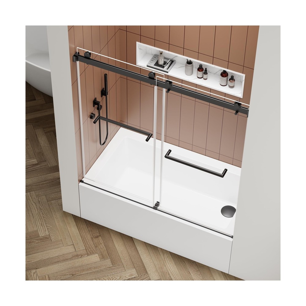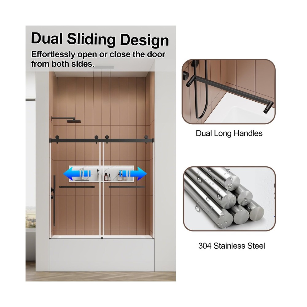 Double Sliding Frameless Bathtub Shower Door, 56-60 in. W x 60 in. H Glass Door, 5/16" (8mm) Tempered Glass with Double Nano Coating, Easy-to-Clean (Black Product Details Size: 60x60 Color: Matte Black Brand: JONIVRAT MPN: JVR-A01 UPC: Does not apply EAN: Does not apply Brand: JONIVRAT Color: Matte Black Material: Stainless Steel Style: Minimalist Assembly Required: Yes Brand: JONIVRAT Color: Matte Black Material: Stainless Steel Style: Minimalist Assembly Required: Yes Manufacturer: JONIVRAT Part Number: JVR-A01 Item Weight: 124.8 pounds Product Dimensions: 0.31 x 60 x 60 inches Country of Origin: China Item model number: JVR-A01-6060 Size: 60x60 Batteries Included?: No Batteries Required?: No Date First Available: June 23, 2025 Sleek Frameless Design: The JONIVRAT JVR-A01 features a clean, frameless design with a matte black stainless steel frame, perfect for modern bathroom styles. The semi-frame design creates an elegant, open appearance, contributing to a stylish and expansive bathroom look. High-Safety Tempered Glass: Built with 5/16" (8mm) tempered glass, the JVR-A01 ensures superior impact resistance and heat durability. The tempered glass provides additional safety, reducing the risk of breakage and offering peace of mind for daily use. Innovative Nano Coating: The glass is coated with a dual-sided nano coating that effectively prevents water stains and soap scum, making maintenance hassle-free. The coating ensures the glass stays spotless with minimal effort, maintaining a fresh and clean look over time. Flexible Installation and Width Adjustment: The JVR-A01 tub shower door fits openings between 56" and 60" wide, offering flexibility for different bathroom layouts. The reversible handle placement provides additional installation versatility, maximizing space and convenience. Premium Hardware & Durability: Equipped with 304 stainless steel hardware and a matte black finish, the JVR-A01 bathtub shower door is resistant to corrosion and rust. The high-quality materials guarantee smooth operation and long-lasting durability, providing a reliable and quiet sliding experience for years to come. Payment Back to Top We accept Paypal and All Major Credit Cards. Shipping & Handling Back to Top Item will be shipped FREE standard shipping in 1 business day after payment is received. Express Shipping services are available. Tracking number will be provided. Return Policy Back to Top Items can be returned for exchange or full refund within 30 days from the date you receive your merchandise. Please contact us before starting a return request, so we can resolve any issues and provide free returns if needed. Return shipping is the responsibility of buyer unless the return is a result of our mistake (i.e., your receive the wrong item). Contact Us Back to Top If you have any questions please contact us. We will respond within 1 business day or less.