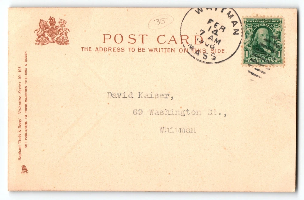 Unsigned artist Frances Brundage. Great series 107 by Raphael Tuck & Sons. Posted with 1906 cancel and stamp. Antique original vintage post card. Very clean with light age wear. Stock #VAL194. Additional postcards are in our store. All post cards are old originals and may or may not have writing on back. Bundle and save by using cart and making single payment.