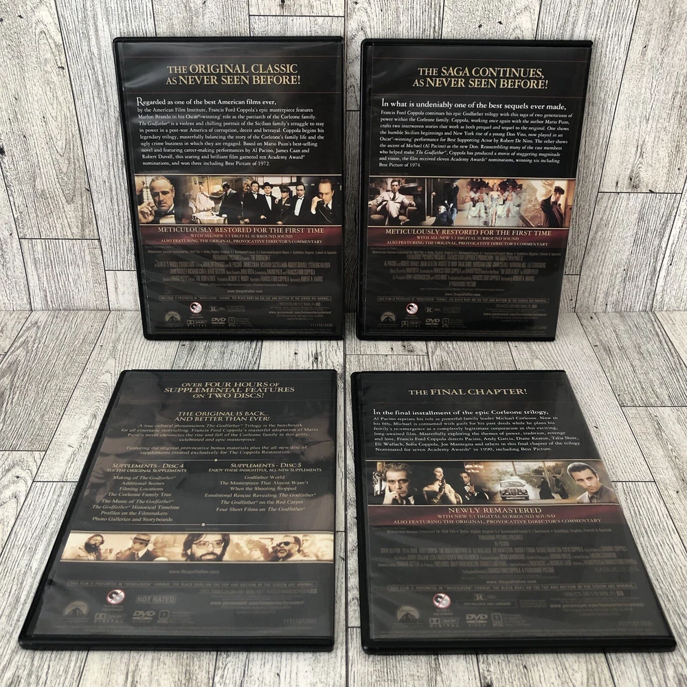 Experience the epic story of the Corleone family with this 5-disc DVD collection of The Godfather I, II, III, and more. This box set includes commentary, behind-the-scenes featurettes, documentaries, and additional scenes, all in NTSC video format with a run time of 549 minutes. The Godfather Collection is rated R and features the legendary Al Pacino as Tony Corleone. This complete series box set is presented in English language with a BOX SET case type and is the perfect addition to any movie lover's collection. The Godfather Collection is a drama genre movie with an action/adventure sub-genre and was released in 2001 by Paramount Studios. Don't miss out on this opportunity to own a piece of cinematic history. Conditions: This 5-disc DVD set is in excellent used condition. However, since DVD’s are pre-owned they could have some little scuff marks on them from usage so please look carefully at all pictures and item description before making your purchase. This item is sold as is, item in photos is the exact item you are purchasing. Comes from a smoke-free and pet-free home. Always ship fast! Offers Welcome! Check my other listings for more great deals! Thank you for stopping by and happy shopping!