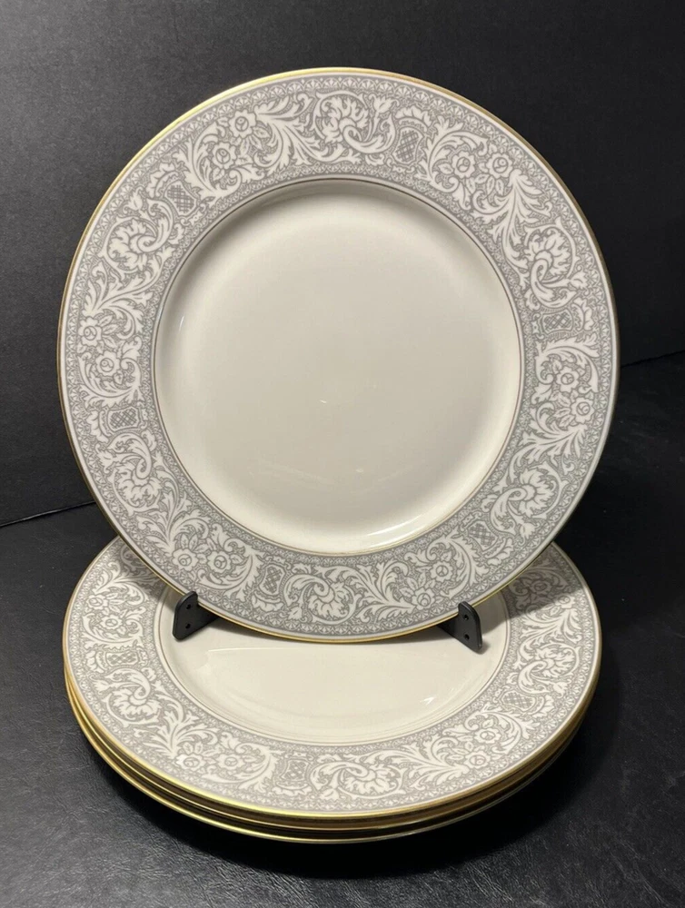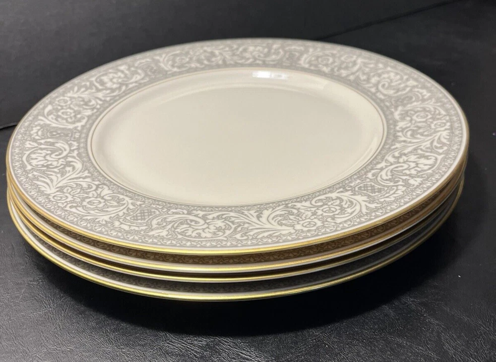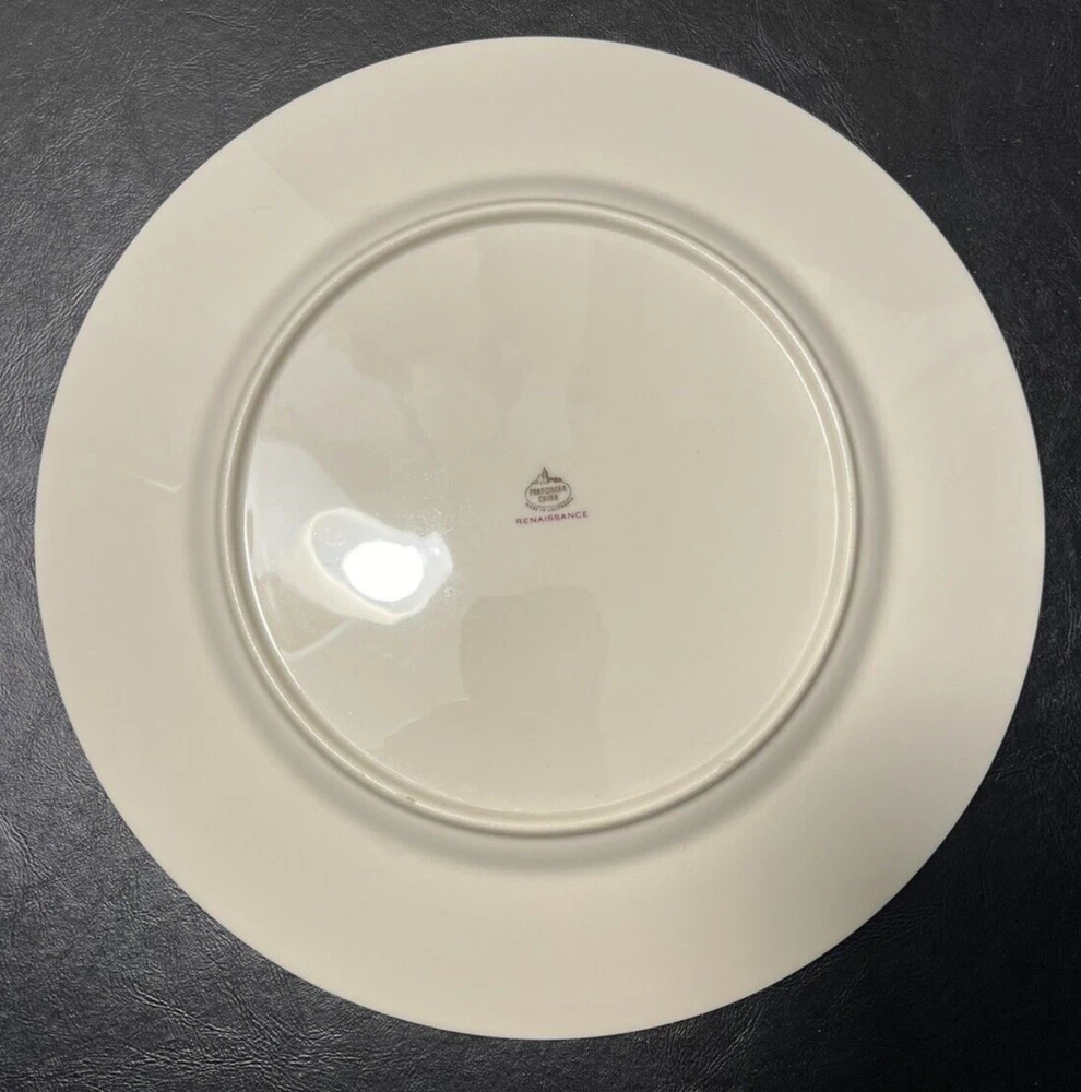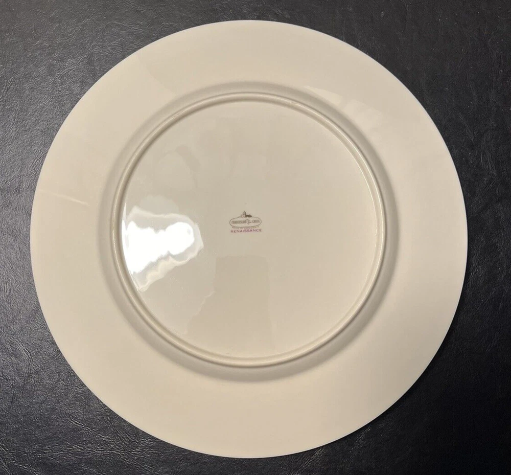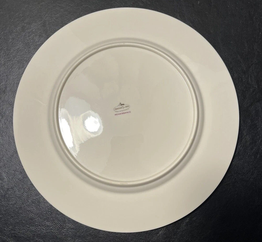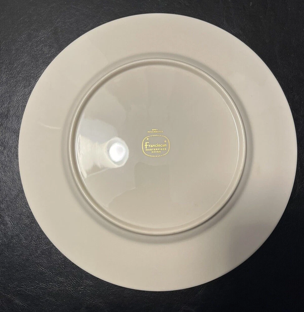 Add a touch of classic elegance to your dining table with this set of four Franciscan Masterpiece China Platinum Renaissance dinner plates. These dinner plates feature a beautiful gray floral scroll band and ivory color in a stunning Renaissance pattern that is perfect for any occasion. Crafted in California, these dinner plates are a vintage addition to your collection. The set includes 4 dinner plates, 10 5/8” across.