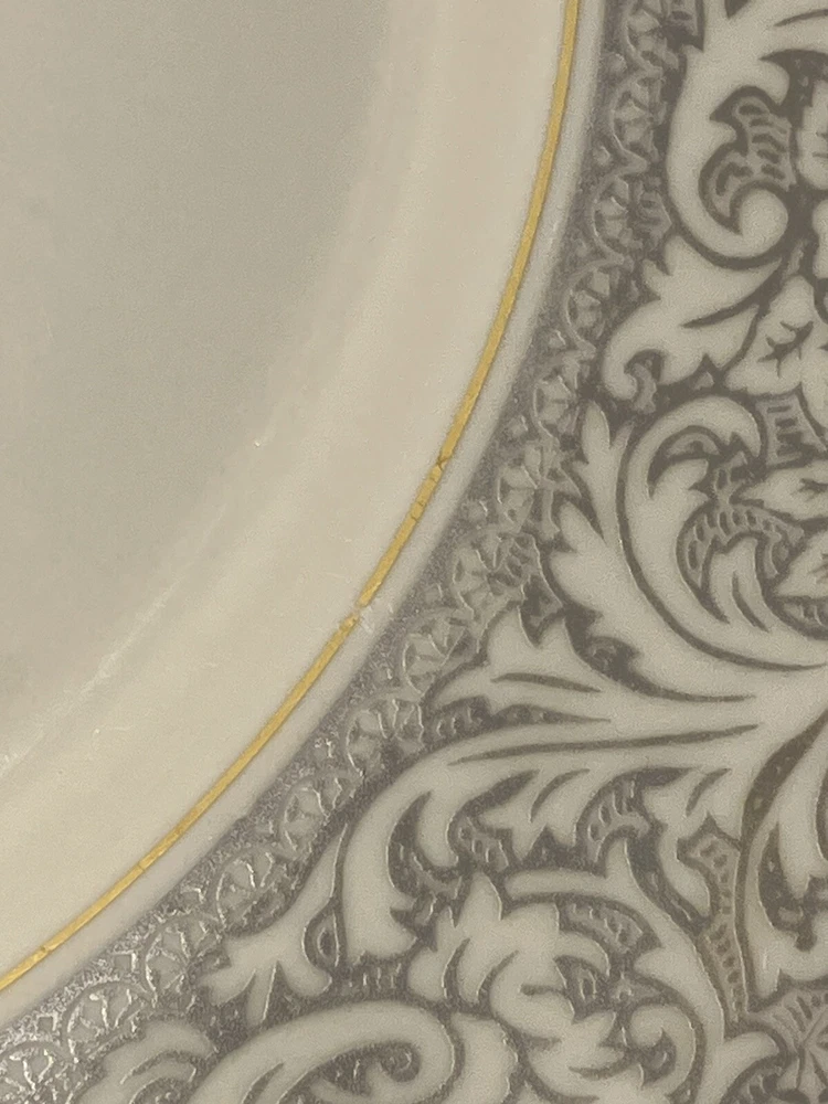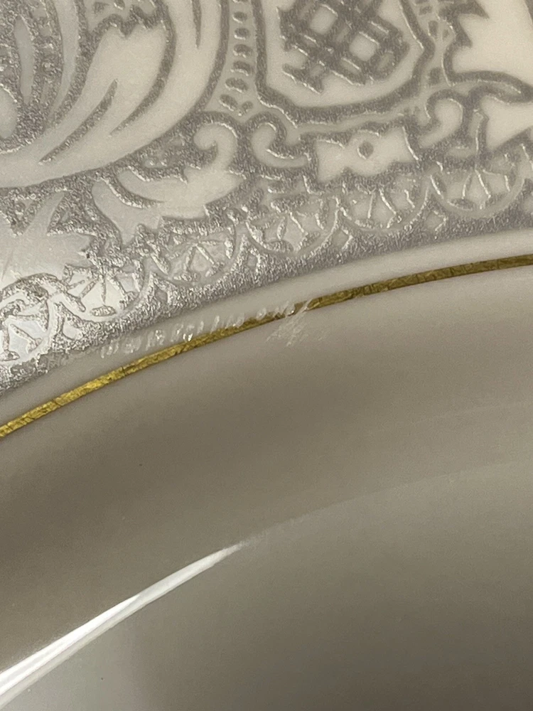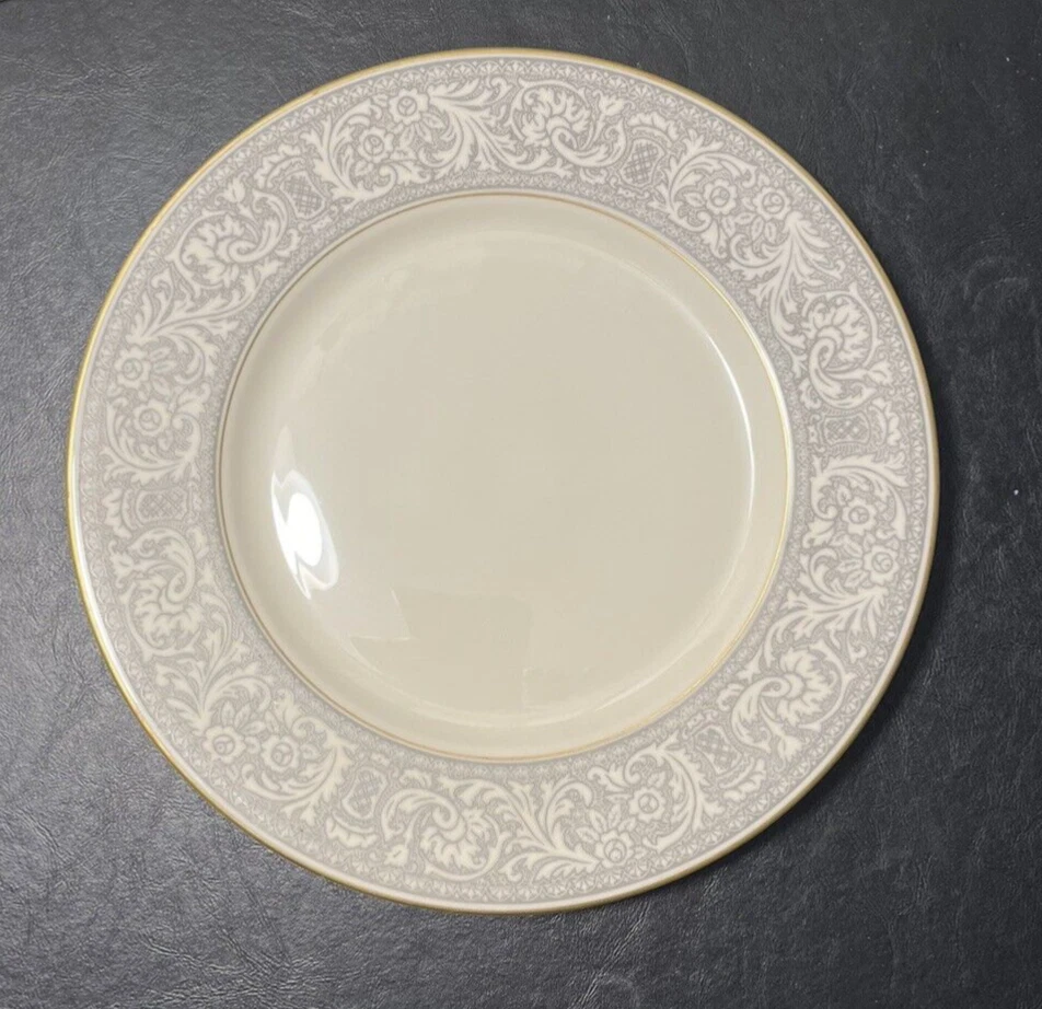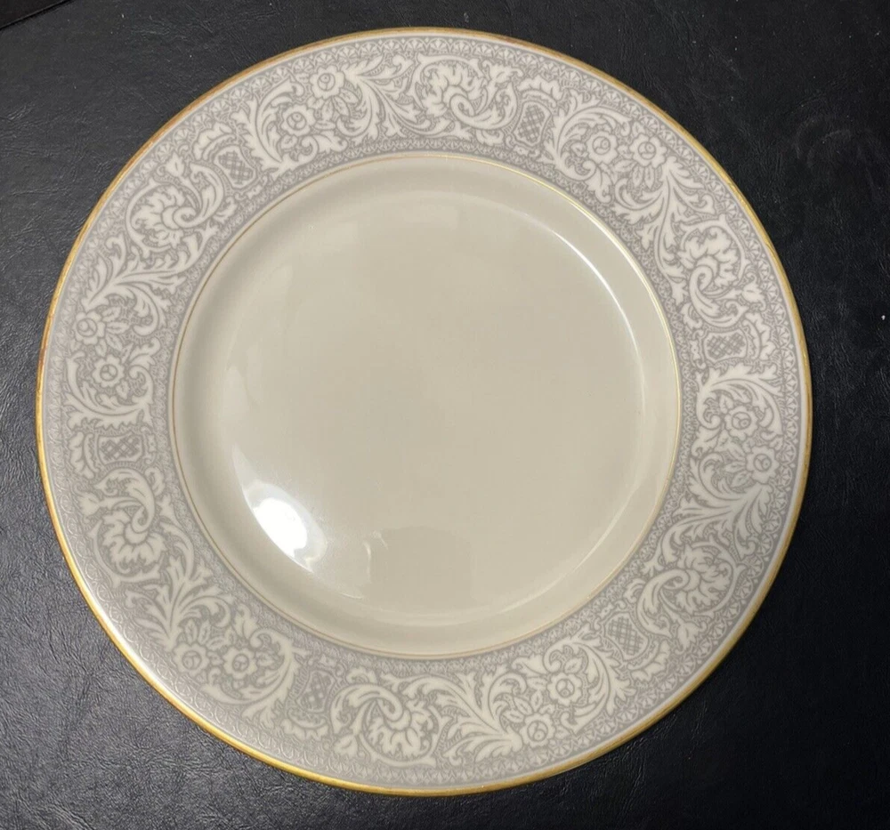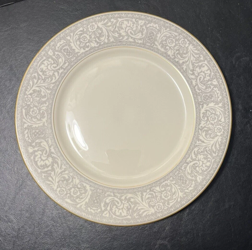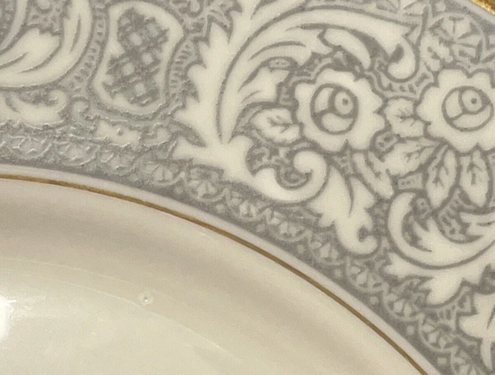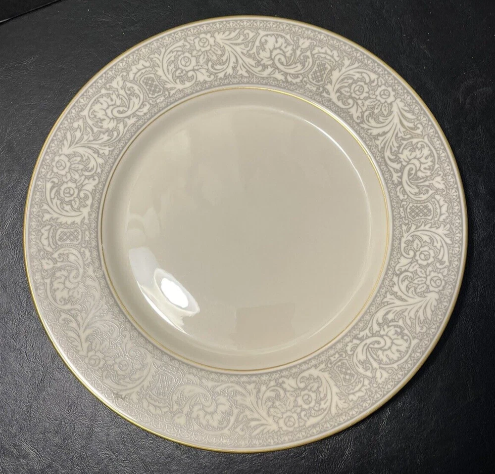 Add a touch of classic elegance to your dining table with this set of four Franciscan Masterpiece China Platinum Renaissance dinner plates. These dinner plates feature a beautiful gray floral scroll band and ivory color in a stunning Renaissance pattern that is perfect for any occasion. Crafted in California, these dinner plates are a vintage addition to your collection. The set includes 4 dinner plates, 10 5/8” across.