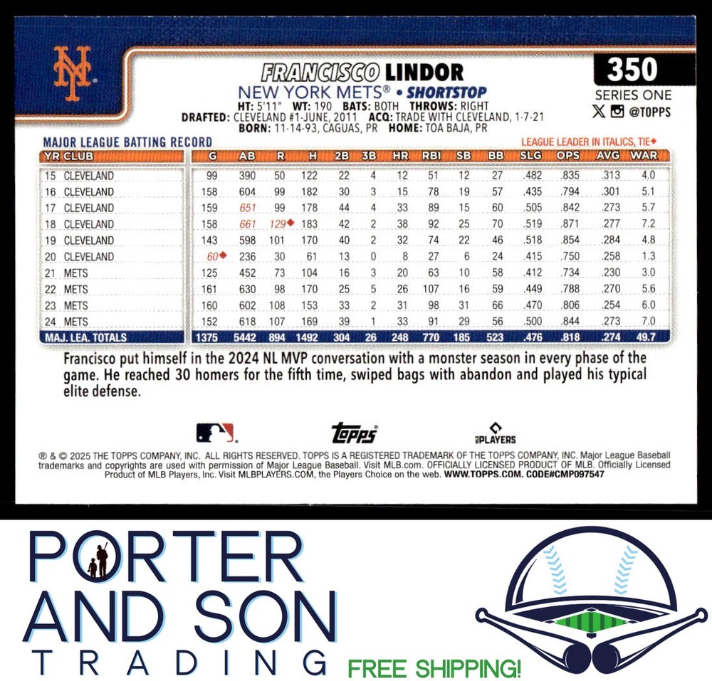 This Francisco Lindor card is a must-have for Mets fans! The card arrives well-protected with a penny sleeve and top loader, ensuring it stays in great condition. Shipping is fast and secure, making it a smooth purchase. The quality matches the photos perfectly—highly recommend for any collector!
