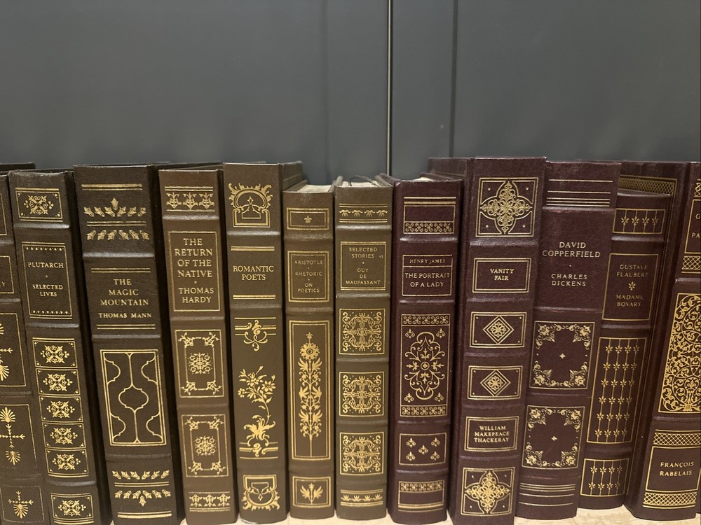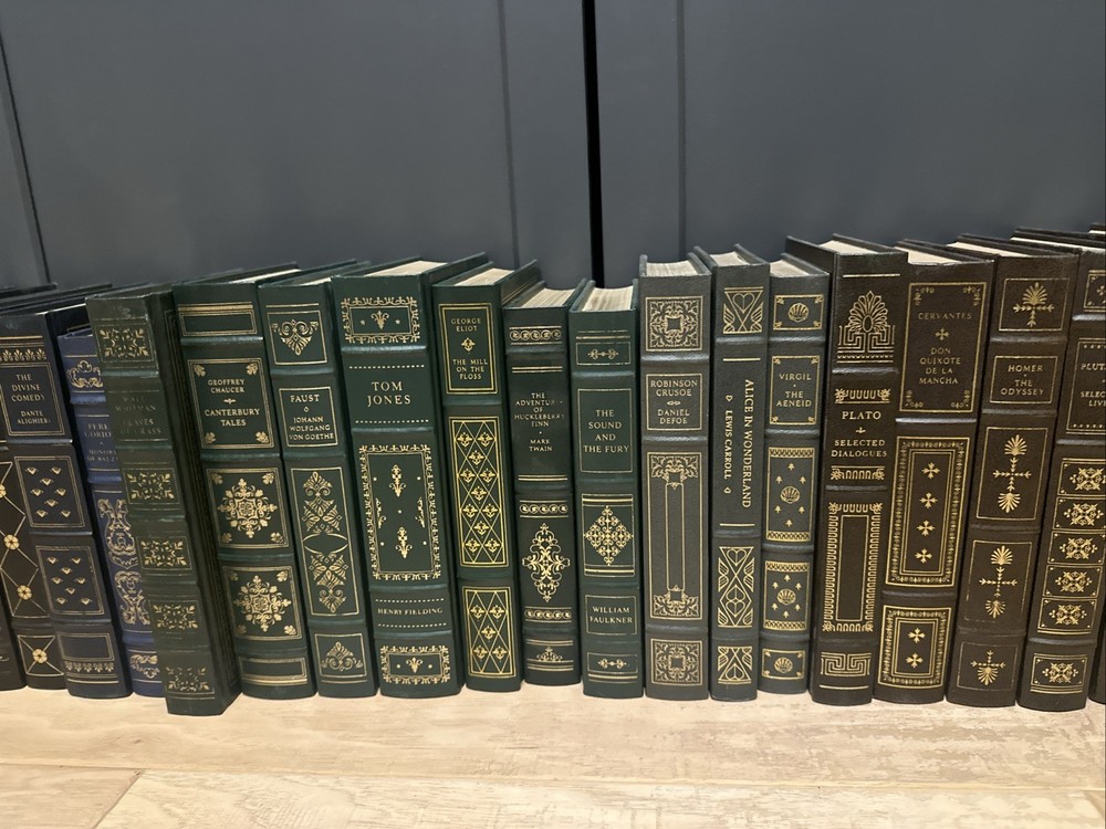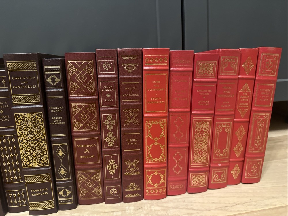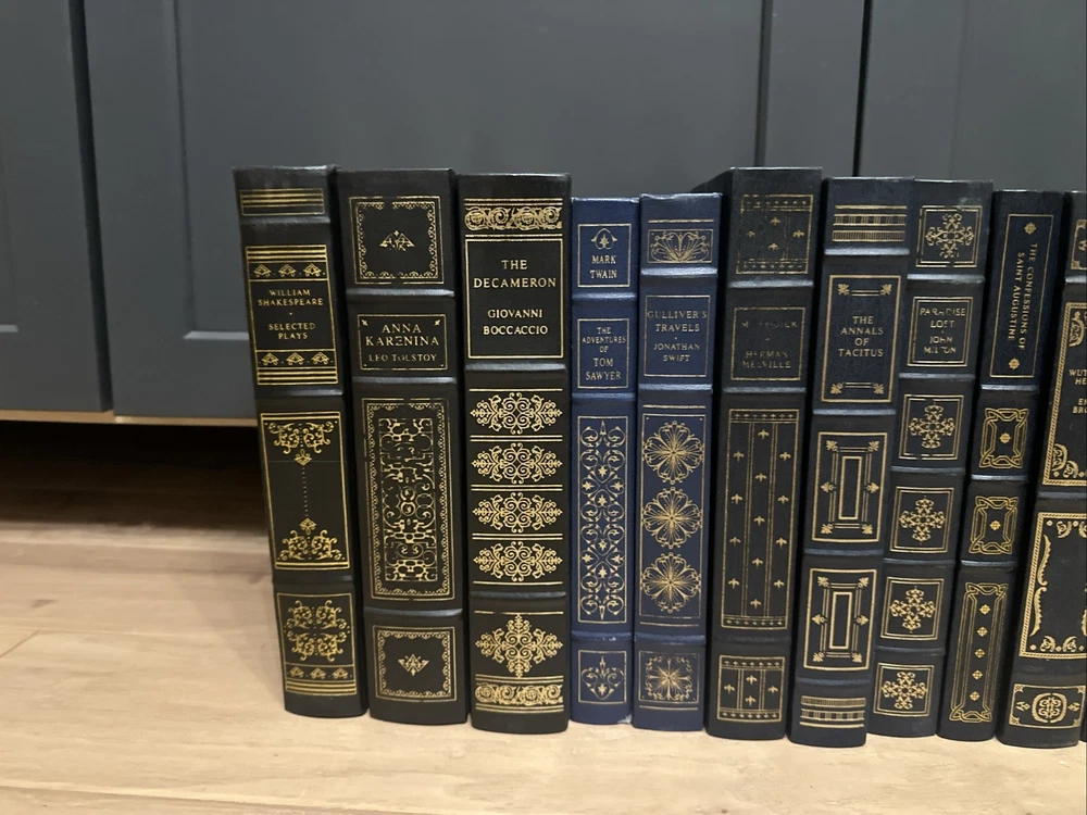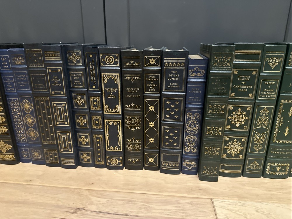 The product is a lot of 48, first edition leather bound books from the Franklin Library, featuring a classic assortment of titles. Each book is elegantly gilded and bound in leather, making them a valuable addition to any collector's library. These books are in good condition and offer a pristine reading experience for any book enthusiast. From a private smoke free estate. Authors include: Twain Dickens Eliot Cervantes Faulkner Carroll Moliere Dostoevsky Chaucer Brontë Swift Austen