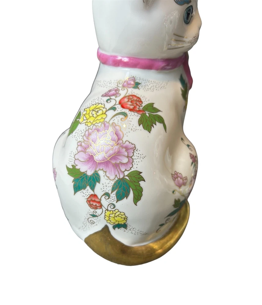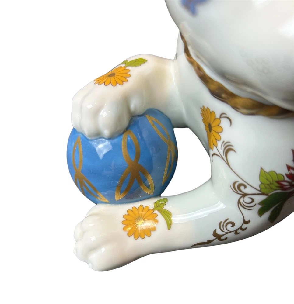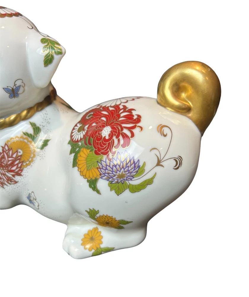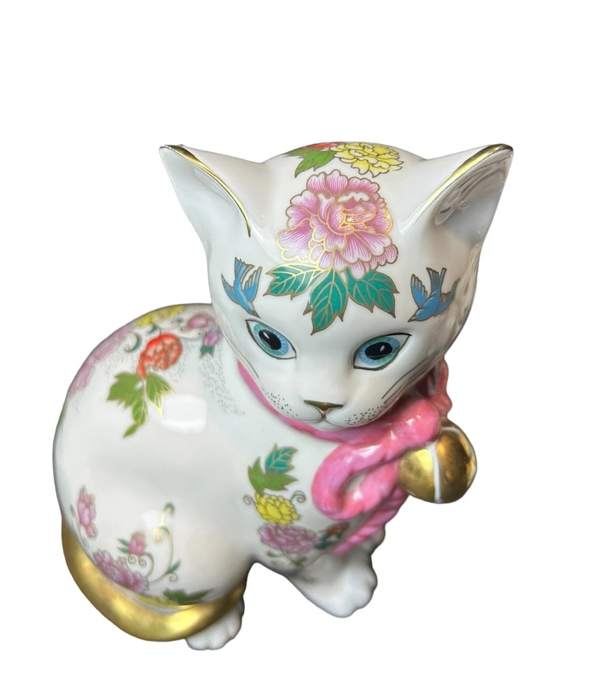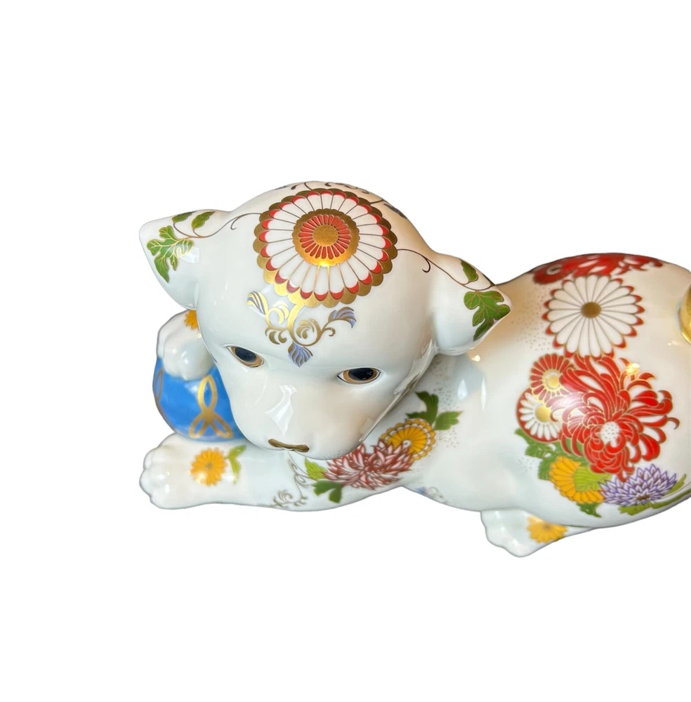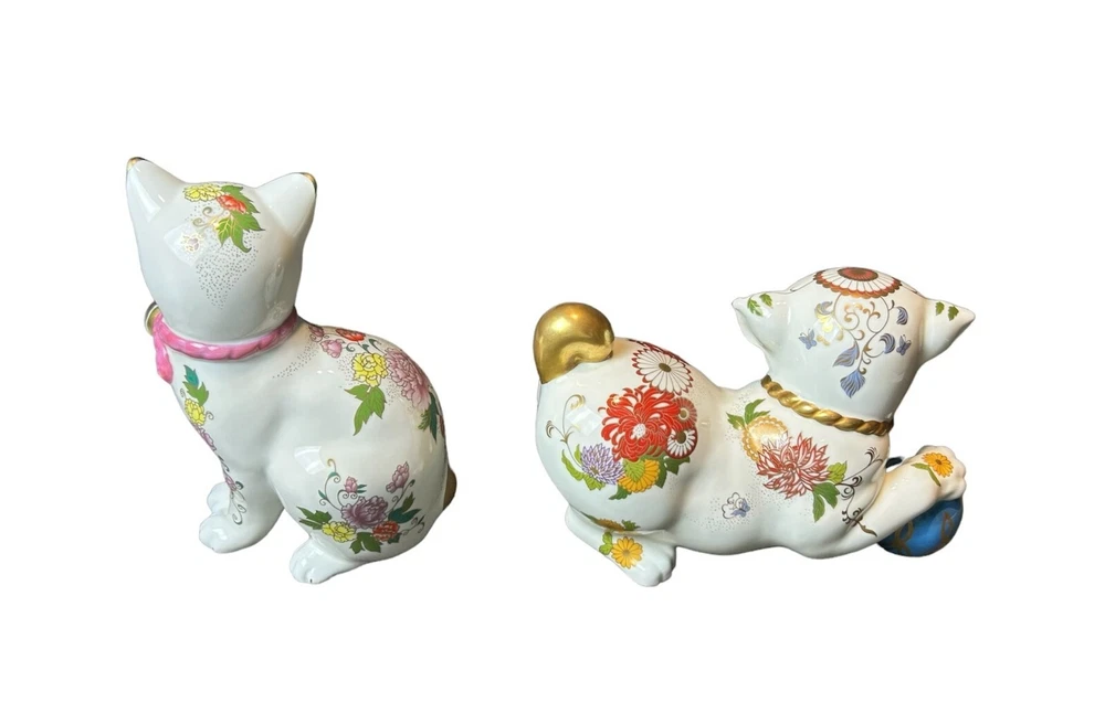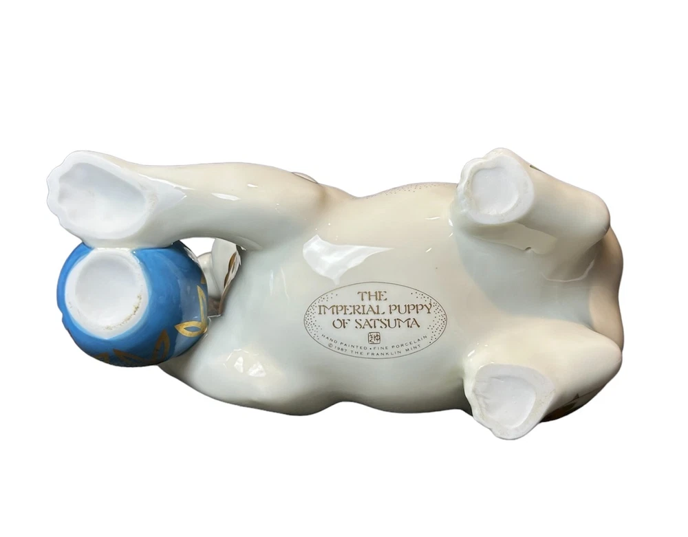 Adorable "Imperial Puppy of Satsuma" and " Royal Kitten of Prosperity" were designed by renowned artist Yuki Morioka for Franklin Mint in 1987 and 1988 respectively. They are made of fine porcelain and are hand decorated with 24K gold. The puppy is approximately 6" tall and 8" long. The kitten measures approximately 7 5/8" in height and is 5 1/4" wide. Free of chips or cracks. Some minor age related wear to gilt (please refer to photos).
