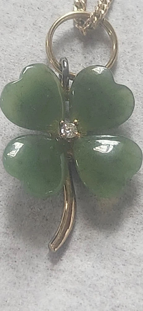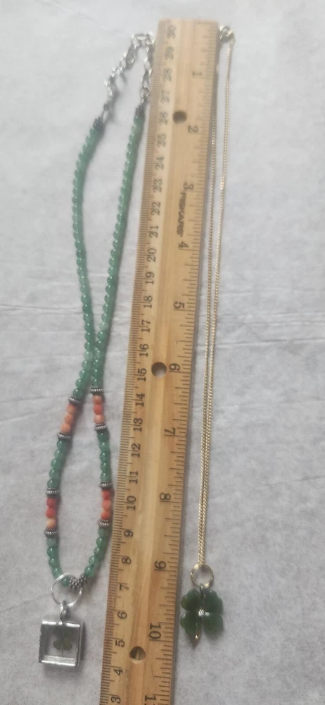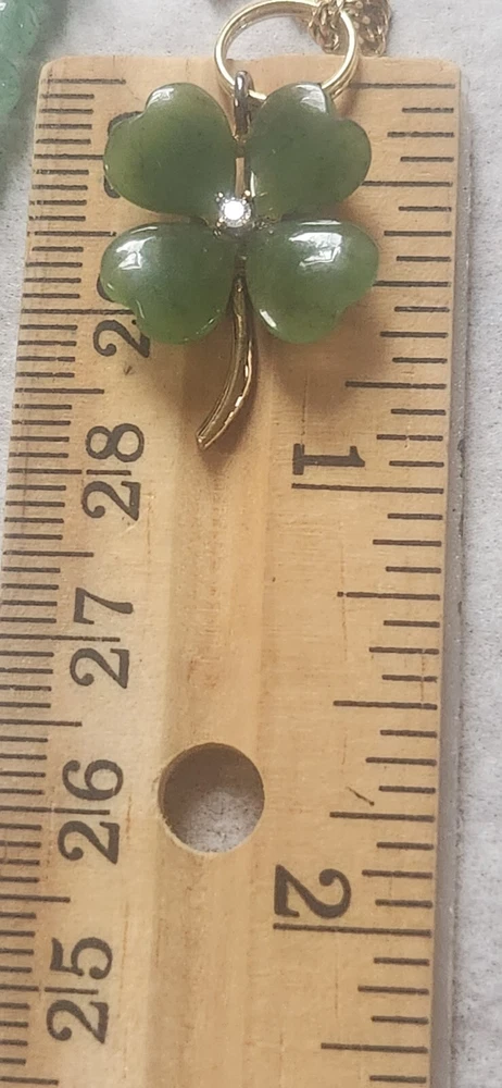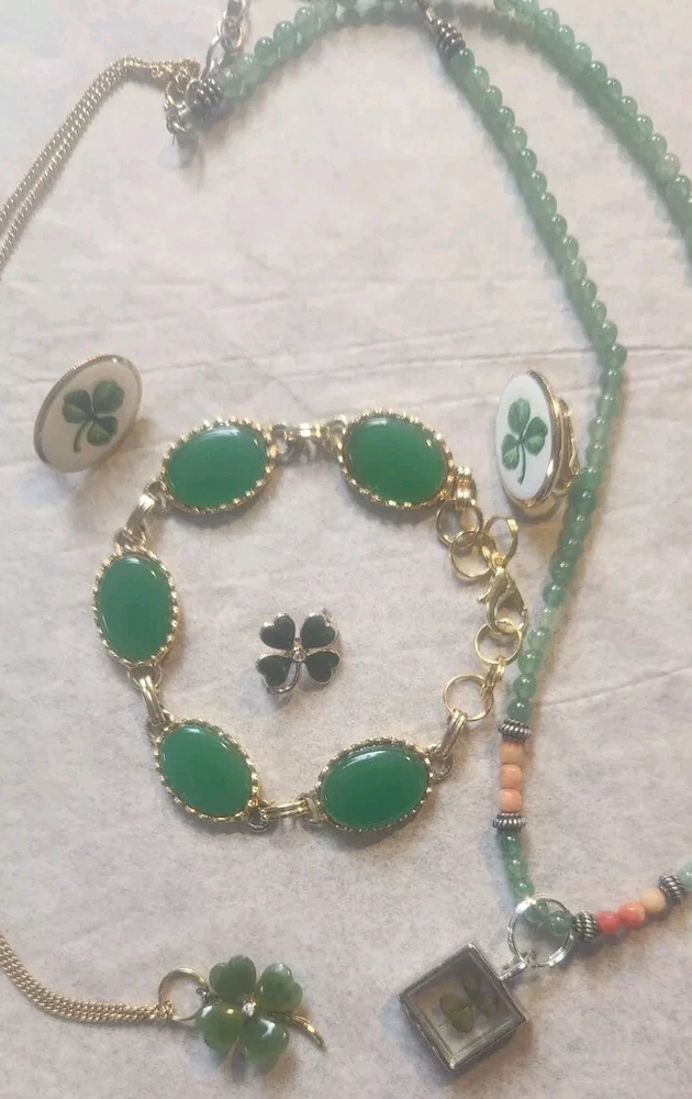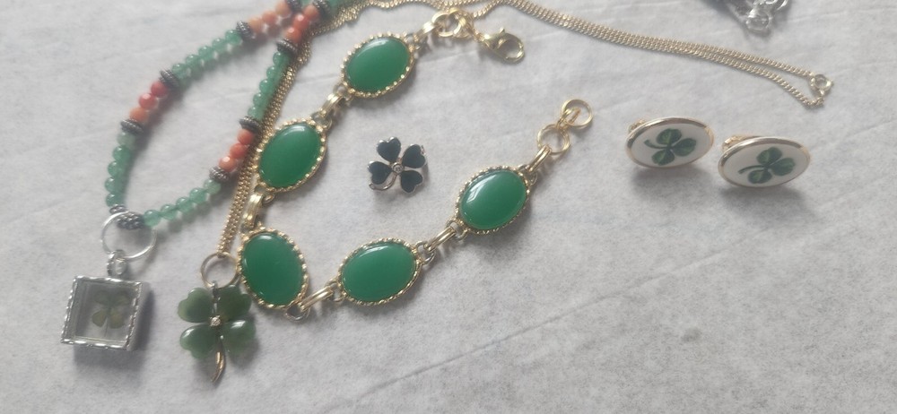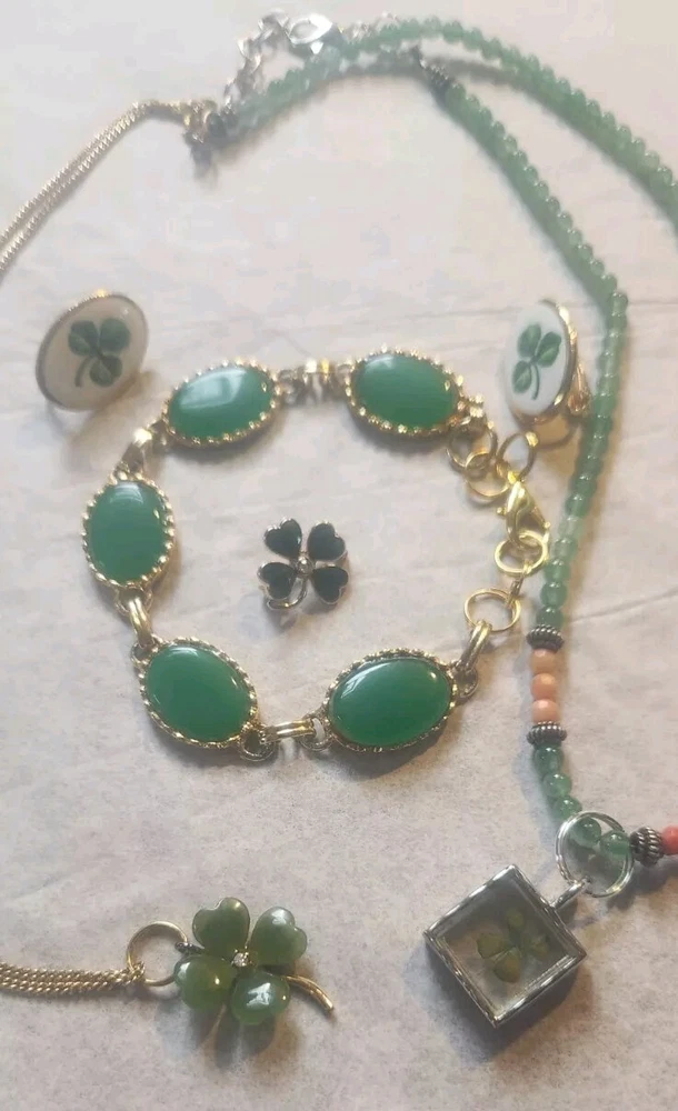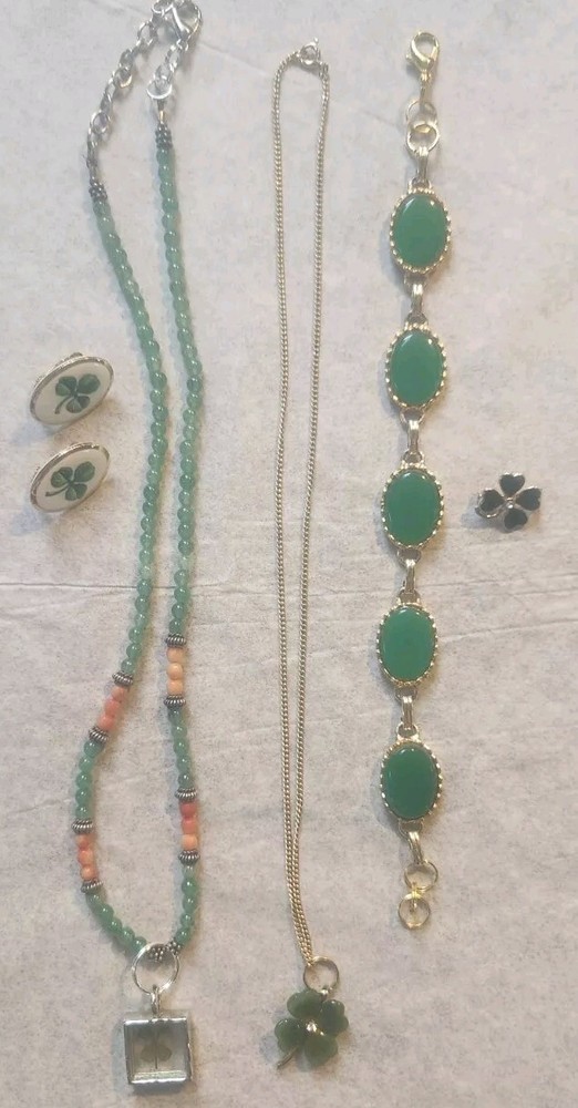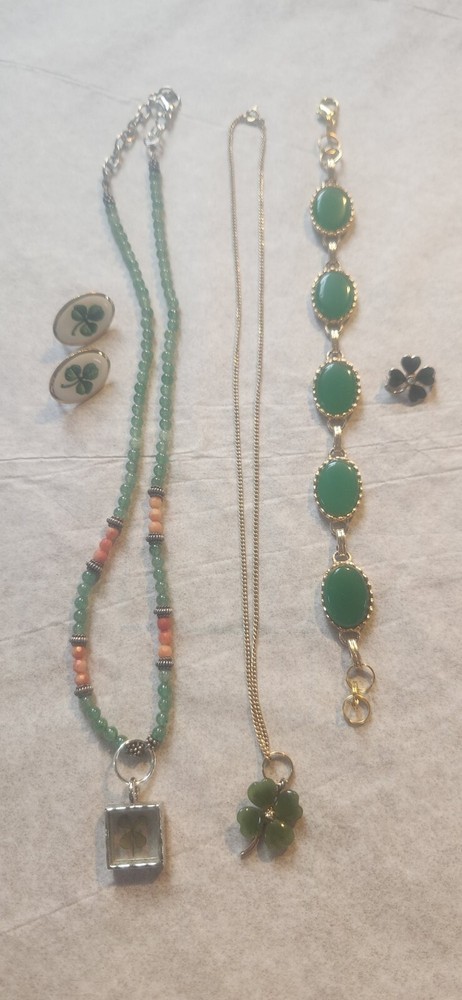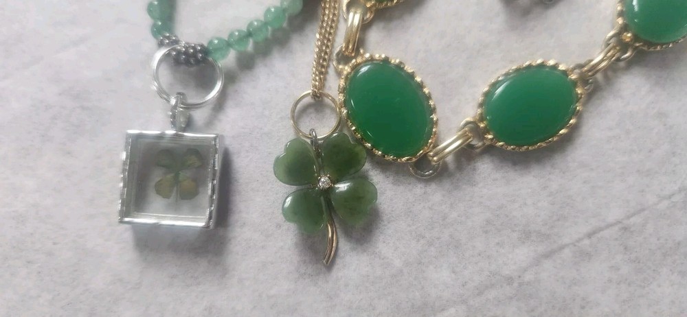 Franklin MINT GOLD FILLED CHAIN NOT ORIGINAL TO PENDENT HAS GOLD TONE JUMP RING THAT CAN BE REMOVED BEADED GREEN NECKLACE HAS A REAL 4 LEAF CLOVER HAS BEEN REPAIRED WITH SILVERTONE JUMP RING PLASTIC GREEN BRACELET HAS BEEN REPAIRED WITH GOLD TONE JUMP RINGS AND LOBSTER CLASP JEWLERY IS PHOTOGRAPHED NEXT RULER FOR MEASUREMENT