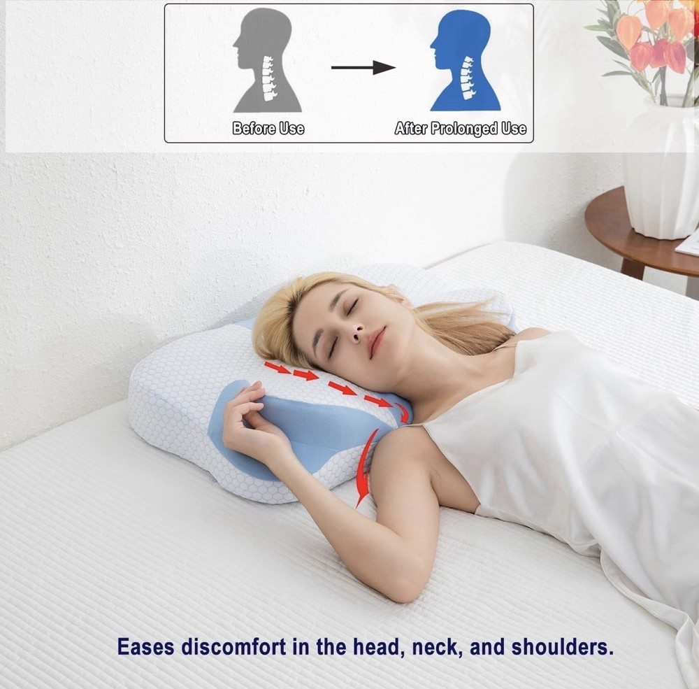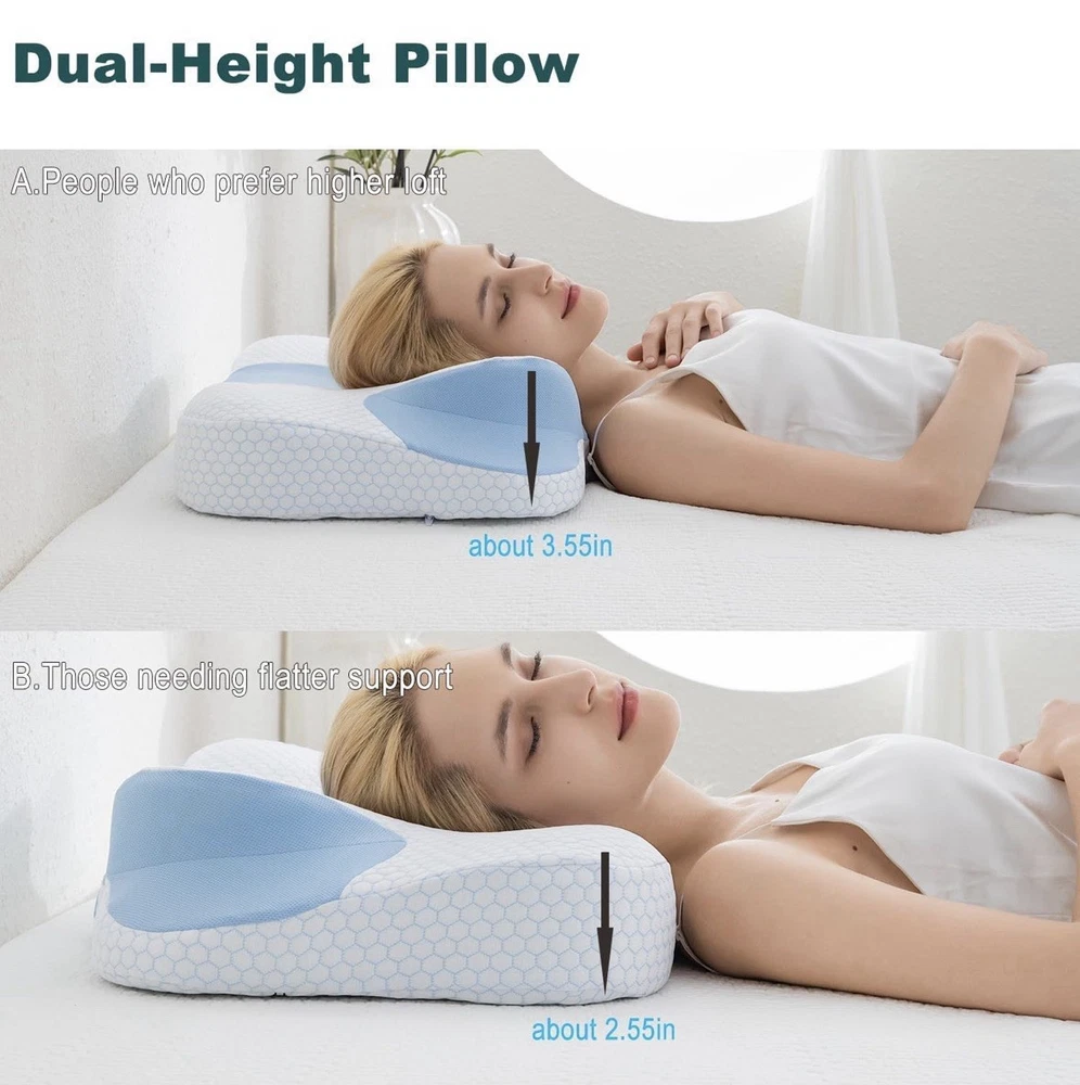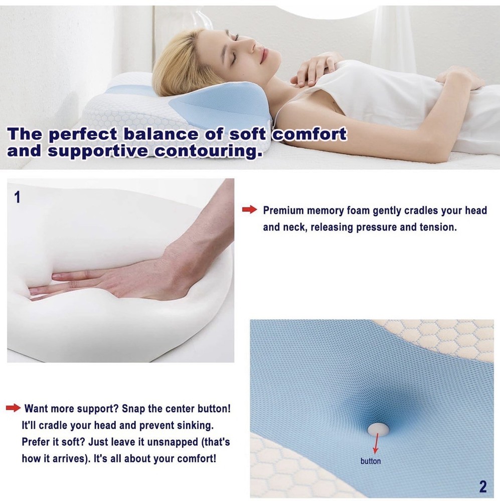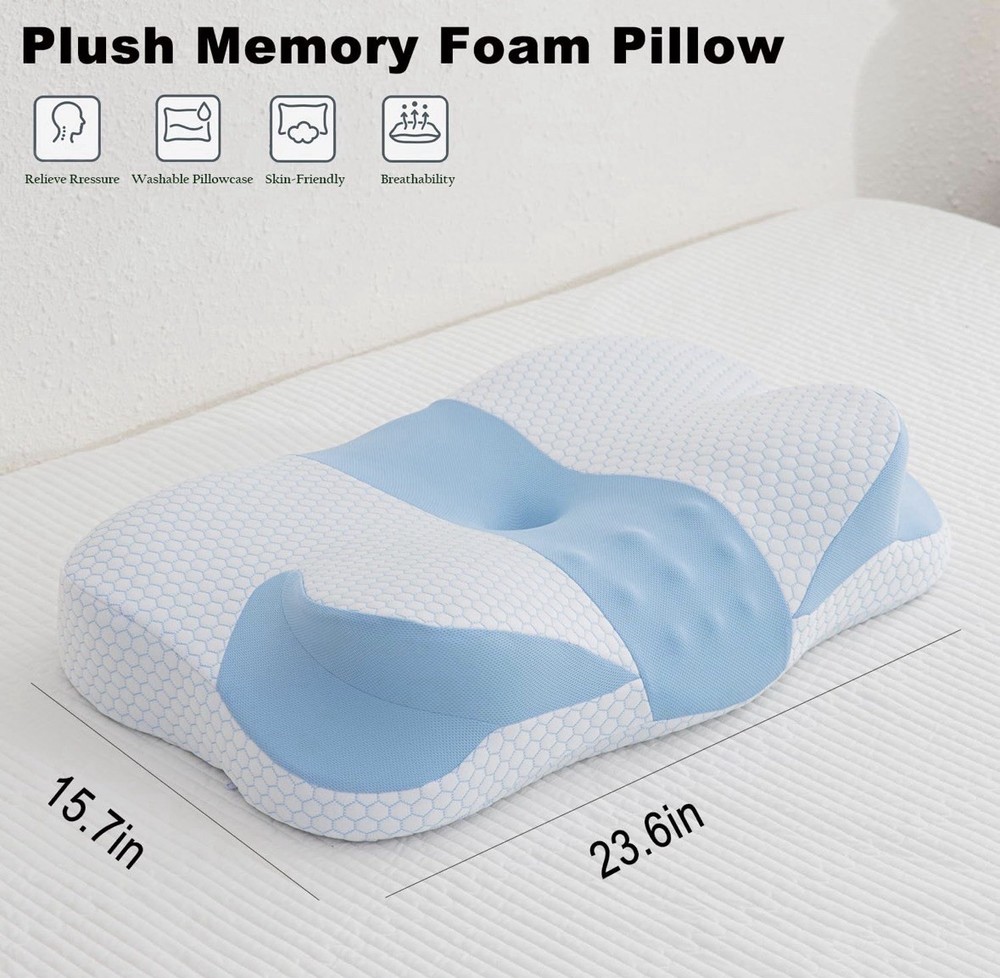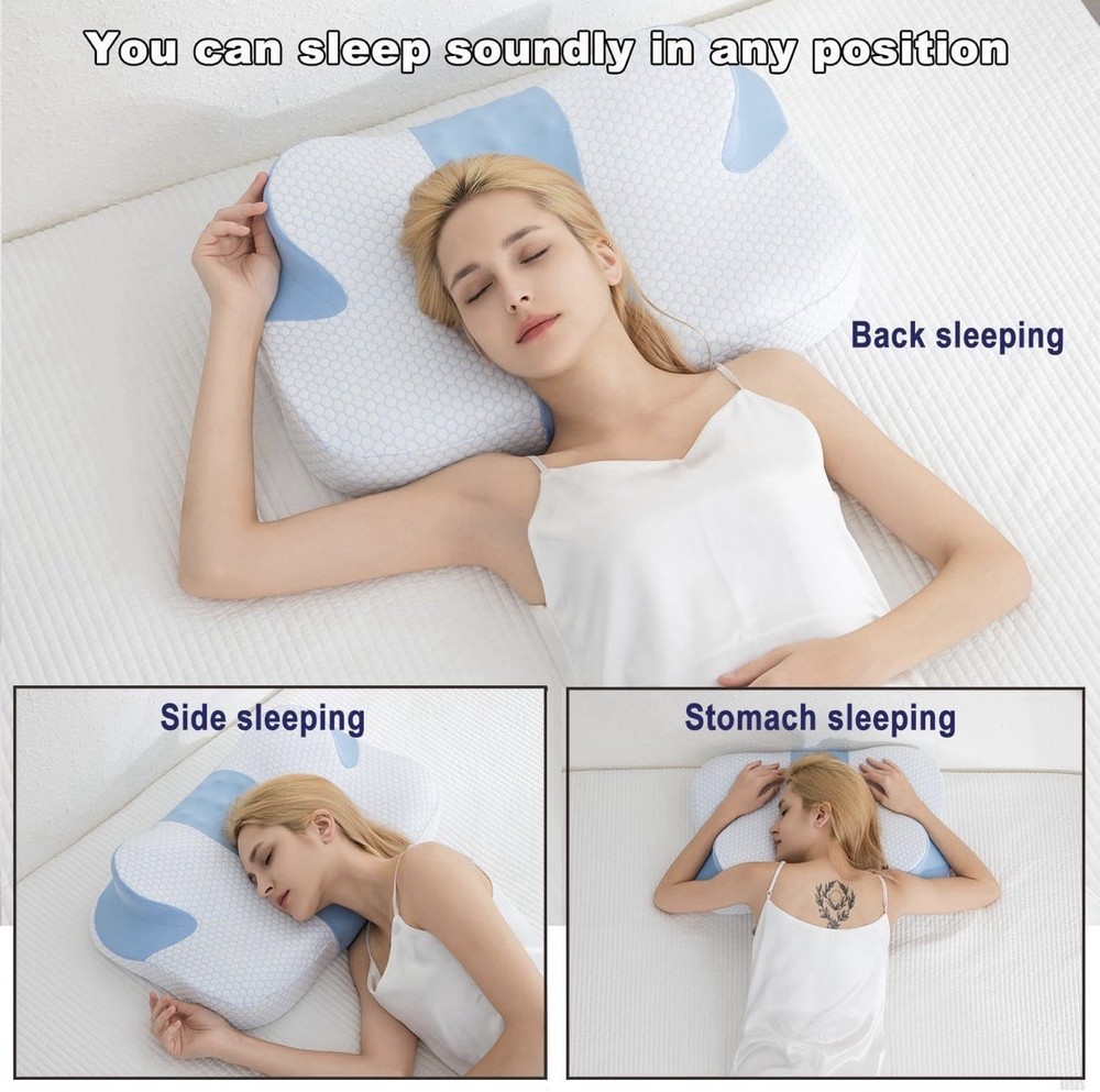 Product details Top highlights Brand Frebrez Special Feature Removable Cover Color Blue Fill Material Memory Foam Shape Butterfly Age Range (Description) Adult [Soothe Your Neck & Align Your Spine] Experience cloud-like comfort with our memory foam pillow, featuring gentle massage nodules that target neck tension. The responsive foam cradles your cervical spine, promoting natural alignment whether you're a side or stomach sleeper. Wake up refreshed, not stiff! [Dual-Height Design: Your Perfect Fit, Guaranteed] One side offers 3.5" plush support for those who love higher pillows, while the 2.5" lower side suits minimalists. Easily flip to find your ideal height and enjoy customized comfort all night long. [Stay Cool All Night with Breathtaking Fabric] Our stretchy pillow cover blends nylon and spandex for exceptional airflow. The moisture-wicking surface keeps heat at bay, so you stay comfortably cool even during warm nights. [Effortless Care, Lasting Freshness] Zip off the silky-smooth cover in seconds for machine washing. The high-resilience foam core maintains perfect shape wash after wash, making maintenance a breeze. [Patent-Pledged Comfort You Can Trust] Crafted with premium memory foam and backed by a US design patent, every detail delivers scientifically-proven support for truly restorative sleep.Contact us directly if any product concerns arise. We'll respond within 24 hours with personalized solutions.