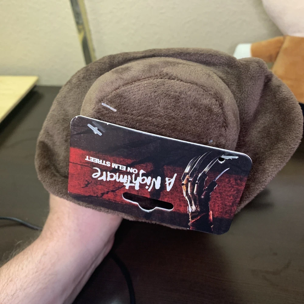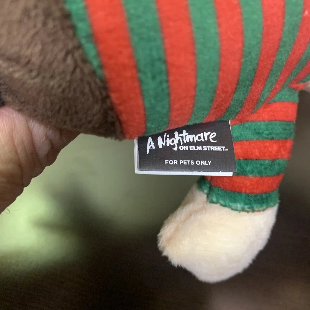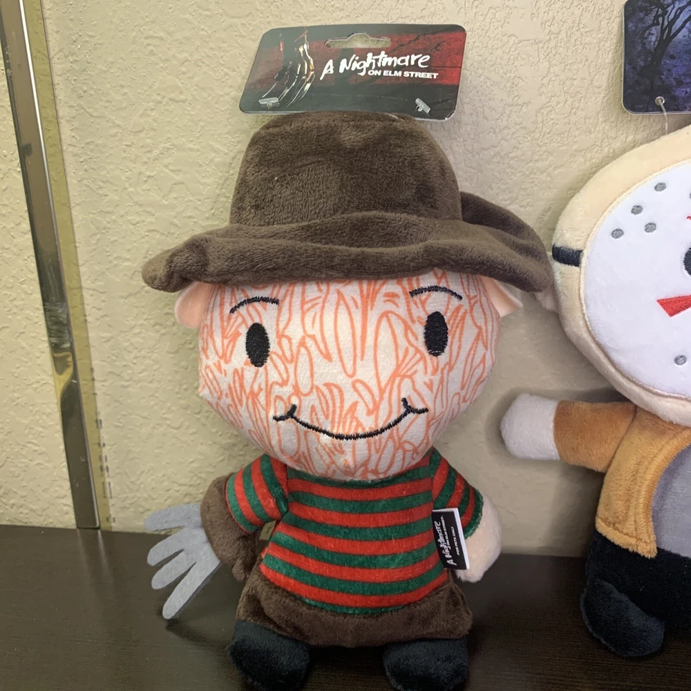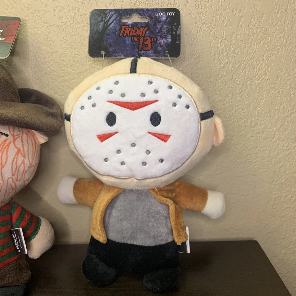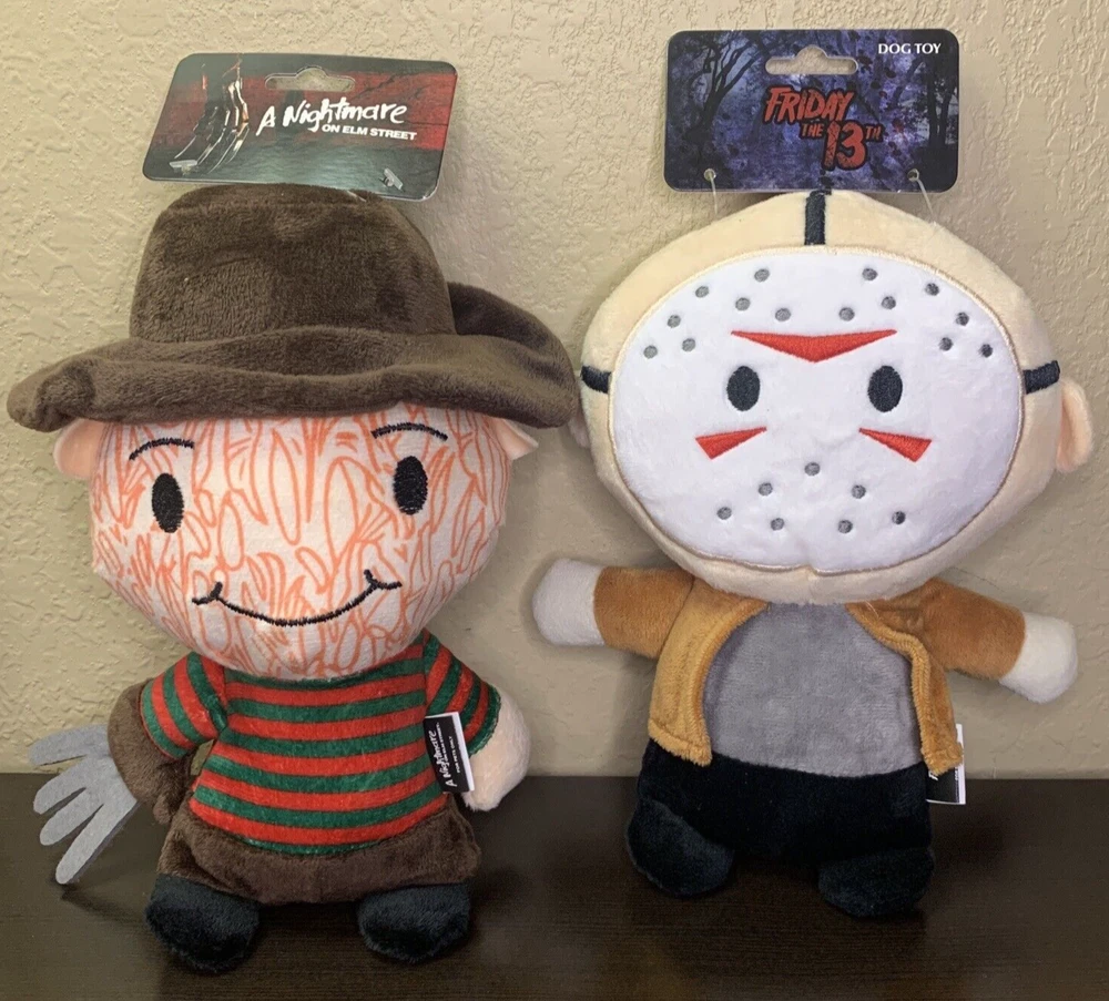 Freddy Krueger & Jason Vorhees 9" plush pet toys, new with tags, Fetch for Pets Not sure what the thinking is behind these, but to make these as pet toys and not as plush for humans is just insane to me. Jason is the only one that squeaks when you press his belly. Would have been better if Jason was carrying a machete, but they are adorable nonetheless. They are approximately 9" long, 6" wide, and 3.5" thick. Slight damage to the back of the Freddy doll's tag, but nothing major. Find it hilarious that they are labeled as 17+ as a pet toy. Please make sure your pet is age 17 or older before purchasing.