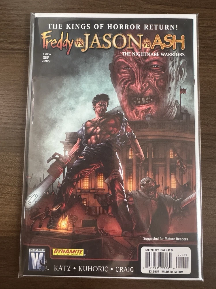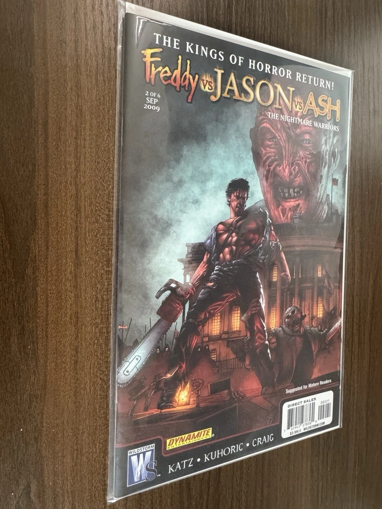 Dive into the thrilling world of horror with "Freddy Vs Jason Vs Ash: The Nightmare Warriors #2," featuring a rare cover by the talented Jason Craig. This 2009 release from Dynamite / Wildstorm publishers brings together the iconic characters Jason Voorhees, Freddy Kreuger, and Ash in a gripping narrative penned by James Kuhoric and Jeff Katz, ensuring a high-adrenaline experience for fans and collectors alike. The comic book, written in English and part of the US Comics tradition, falls under the Horror genre, making it a must-have for enthusiasts of the genre. With its pristine near-mint (NM) grading, this issue promises a superb addition to any collection, inviting you to explore the chilling battles that unfold in the realm of these legendary terrorizers. In a smoke and pet free home.