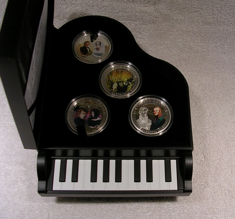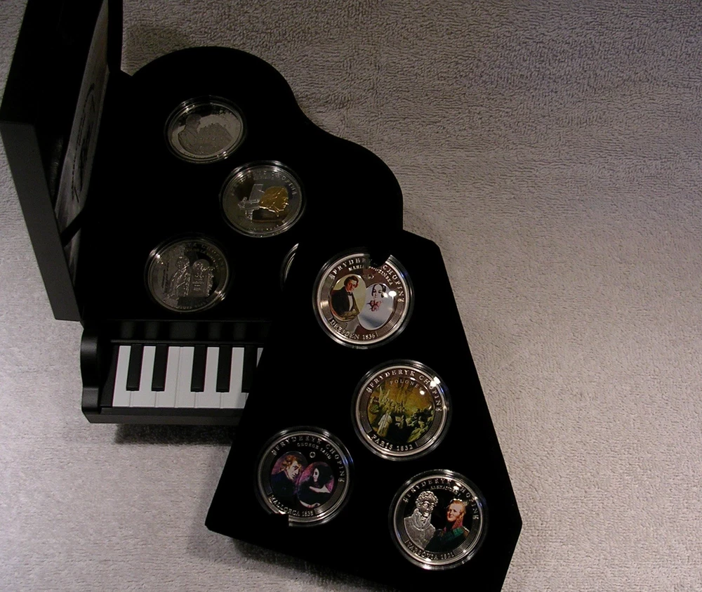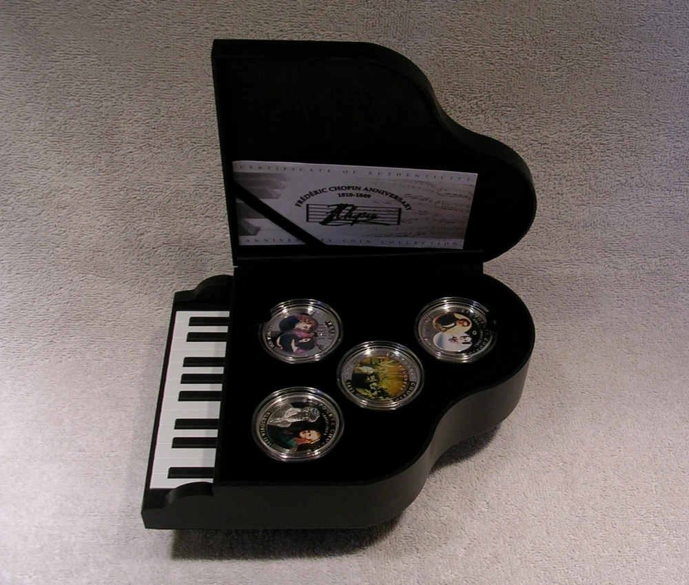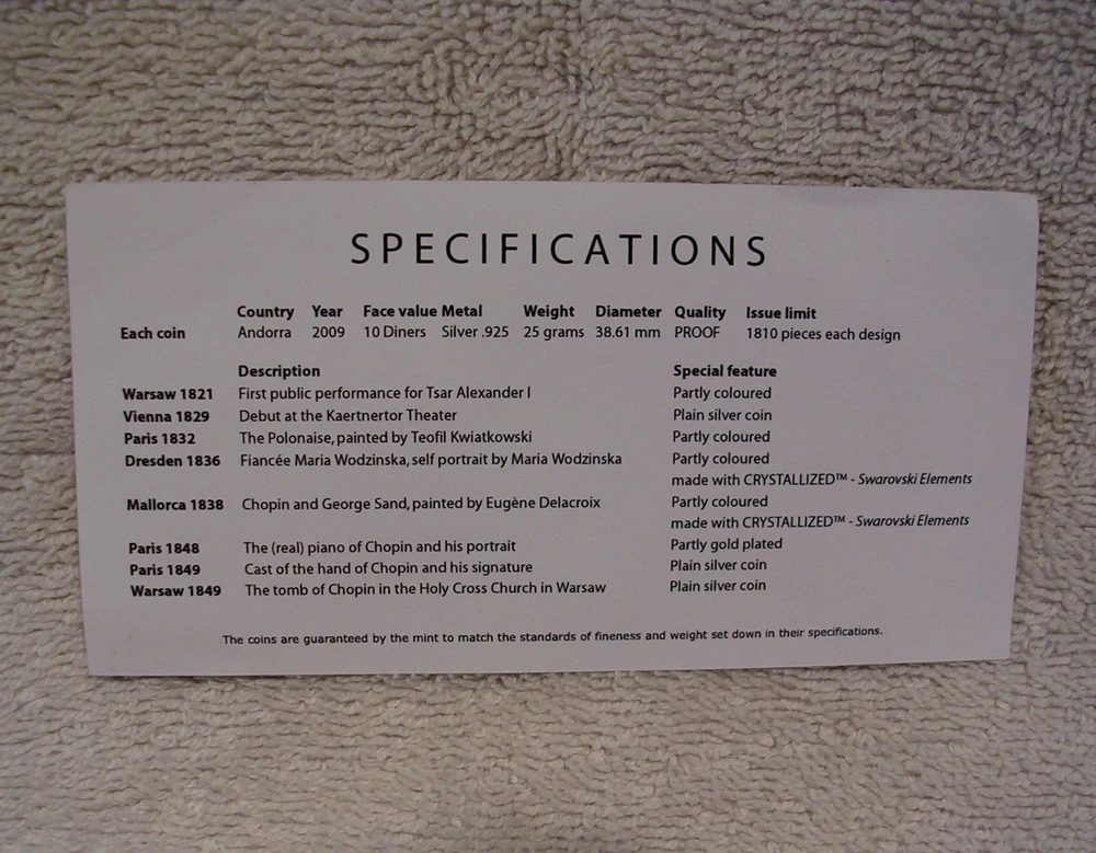 Life of Frederic Chopin Andorra 2009 10 Diners 8 Coin Set 8 x 25g .925 Silver With COA and Piano Case C o l o r i z e d Low mintage limit, only 1,810 pcs! Frederic Chopin, (1 March 1810 ñ 17 October 1849), was a Polish-French composer and virtuoso pianist. He is considered one of the great masters of Romantic music. He was born in the village of Zelazowa Wola, in the Duchy of Warsaw, to a French-expatriate father and Polish mother. He was considered a child-prodigy pianist. At the age of 20, on November 2nd, 1830, he left Warsaw for Austria, intending to go on to Italy. The outbreak of the Polish November Uprising 27 days later, and its subsequent suppression by the Russian Empire, led to his becoming one of many expatriates of the Polish Great Emigration. In Paris, Chopin made a comfortable living as a composer and piano teacher, while giving few public performances. Though an ardent Polish patriot, in France he used the French versions of his given names and traveled on a French passport, possibly to avoid having to rely on Imperial Russian documents. After ill-fated romantic involvements with Polish women, from 1837 to 1847 he had a turbulent relationship with the French novelist Aurore Dupin, better known by her pseudonym, George Sand. For the greater part of his life Chopin suffered from poor health; he died in Paris in 1849, aged thirty-nine, of pulmonary tuberculosis. The great majority of Chopin's compositions were written for the piano as solo instrument; all of his extant works feature the piano in one way or another. Though technically demanding, they emphasize nuance and expressive depth rather than sheer virtuosity. Chopin invented musical forms such as the instrumental ballade and was responsible for major innovations in the piano sonata, mazurka, waltz, nocturne, polonaise, Ètude, impromptu and prelude. Eight coins depict: Chopin's first public performance for Alexander I in Warsaw in 1821, his debut at the Kaertnetor Theater in Vienna in 1829, the Polonaise, painted by Teofil Kwiatkowski in Paris in 1832, his fiancÈe Maria Wodzinskaís self portrait in Dresden in 1836, Chopin and George Sand (Aurore Dupin ) in Mallorca in 1838, the real piano of Chopin and his portrait in Paris in 1848, a cast of his hand and signature in Paris in 1849 and finally, the tomb of Chopin in the Holy Cross Church in Warsaw in 1849. Country Andorra Year 2009 Face Value 8x 10Diner Metal Silver Fineness 925/1000 Weight 8x 25g Diameter 38,61 mm Mintage 1,810pcs Quality Proof Certificate COA Yes Presentation Case Yes Used. Previously owned with scratches and wear. Many plastic coin capsules are chipped on the edge. **************************** IMPORTANT INFORMATION Payment due within 5 days. Orders ship in 1-2 business days after payment is received. Save on shipping. We only ship to the United States. 30 day - Money Back Guarantee. If there is a problem, please e-mail Before leaving feedback. Gladly work with you to remedy all situations.