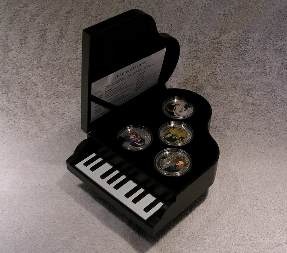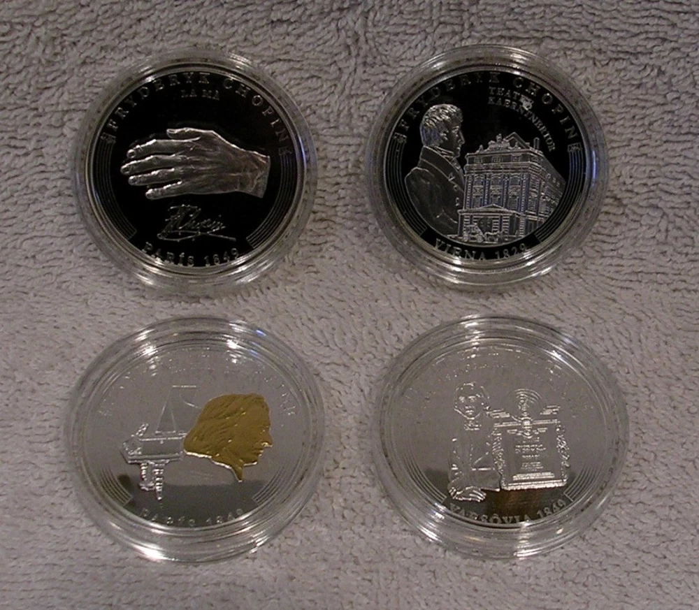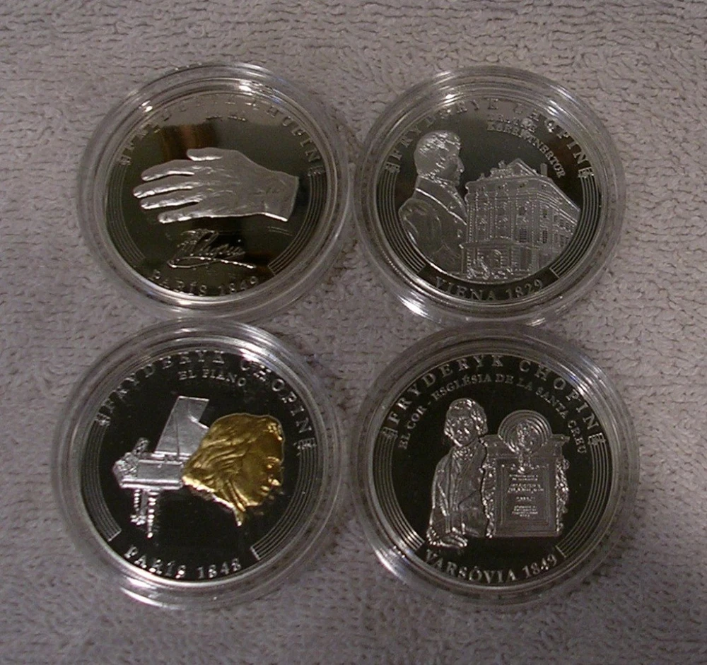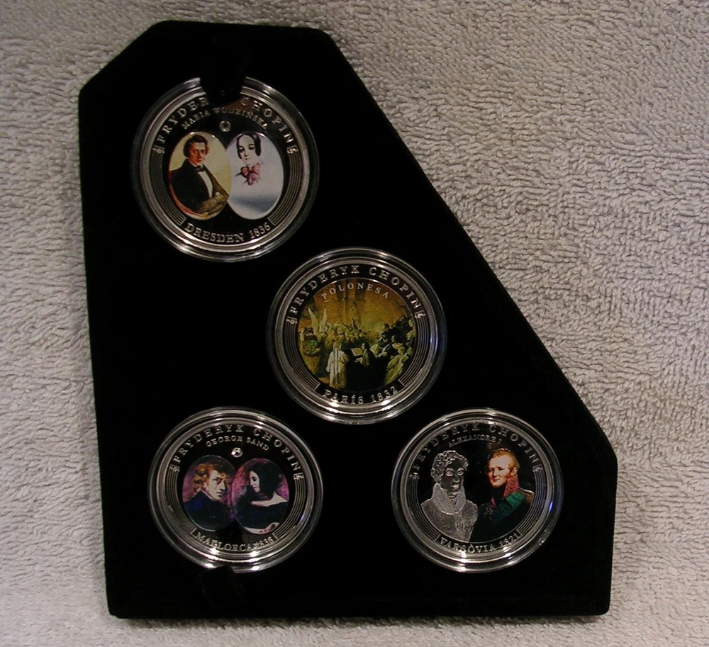 Life of Frederic Chopin Andorra 2009 10 Diners 8 Coin Set 8 x 25g .925 Silver With COA and Piano Case C o l o r i z e d Low mintage limit, only 1,810 pcs! Frederic Chopin, (1 March 1810 ñ 17 October 1849), was a Polish-French composer and virtuoso pianist. He is considered one of the great masters of Romantic music. He was born in the village of Zelazowa Wola, in the Duchy of Warsaw, to a French-expatriate father and Polish mother. He was considered a child-prodigy pianist. At the age of 20, on November 2nd, 1830, he left Warsaw for Austria, intending to go on to Italy. The outbreak of the Polish November Uprising 27 days later, and its subsequent suppression by the Russian Empire, led to his becoming one of many expatriates of the Polish Great Emigration. In Paris, Chopin made a comfortable living as a composer and piano teacher, while giving few public performances. Though an ardent Polish patriot, in France he used the French versions of his given names and traveled on a French passport, possibly to avoid having to rely on Imperial Russian documents. After ill-fated romantic involvements with Polish women, from 1837 to 1847 he had a turbulent relationship with the French novelist Aurore Dupin, better known by her pseudonym, George Sand. For the greater part of his life Chopin suffered from poor health; he died in Paris in 1849, aged thirty-nine, of pulmonary tuberculosis. The great majority of Chopin's compositions were written for the piano as solo instrument; all of his extant works feature the piano in one way or another. Though technically demanding, they emphasize nuance and expressive depth rather than sheer virtuosity. Chopin invented musical forms such as the instrumental ballade and was responsible for major innovations in the piano sonata, mazurka, waltz, nocturne, polonaise, Ètude, impromptu and prelude. Eight coins depict: Chopin's first public performance for Alexander I in Warsaw in 1821, his debut at the Kaertnetor Theater in Vienna in 1829, the Polonaise, painted by Teofil Kwiatkowski in Paris in 1832, his fiancÈe Maria Wodzinskaís self portrait in Dresden in 1836, Chopin and George Sand (Aurore Dupin ) in Mallorca in 1838, the real piano of Chopin and his portrait in Paris in 1848, a cast of his hand and signature in Paris in 1849 and finally, the tomb of Chopin in the Holy Cross Church in Warsaw in 1849. Country Andorra Year 2009 Face Value 8x 10Diner Metal Silver Fineness 925/1000 Weight 8x 25g Diameter 38,61 mm Mintage 1,810pcs Quality Proof Certificate COA Yes Presentation Case Yes Used. Previously owned with scratches and wear. Many plastic coin capsules are chipped on the edge. **************************** IMPORTANT INFORMATION Payment due within 5 days. Orders ship in 1-2 business days after payment is received. Save on shipping. We only ship to the United States. 30 day - Money Back Guarantee. If there is a problem, please e-mail Before leaving feedback. Gladly work with you to remedy all situations.