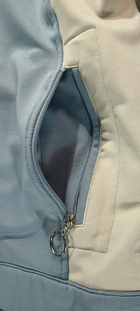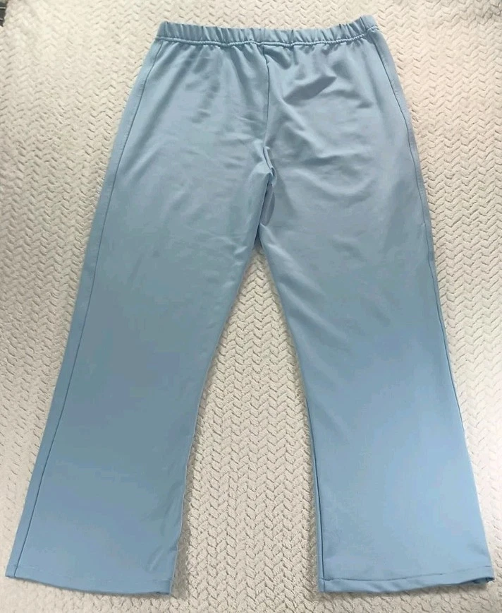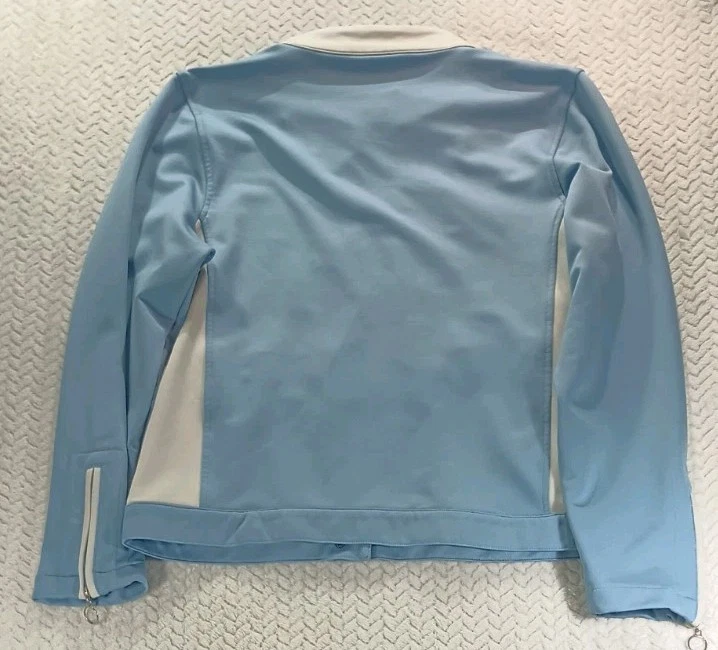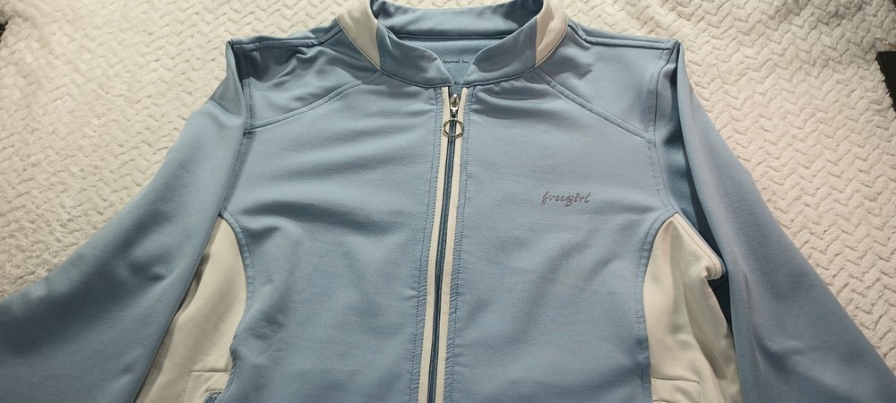 The product is a Free Girl Apparel Inc brand woman's XL jacket and medium pants in a baby or Carolina blue color, designed for activewear. The set includes a jacket and pants, perfect for a comfortable and stylish workout look. The tracksuit is ideal for women looking for a regular fit and a trendy style suitable for various occasions.