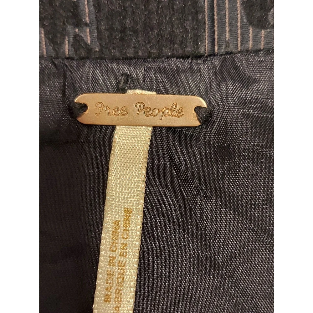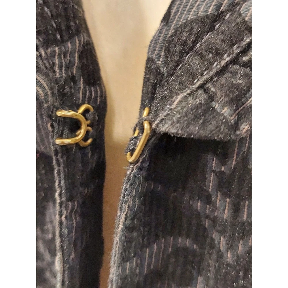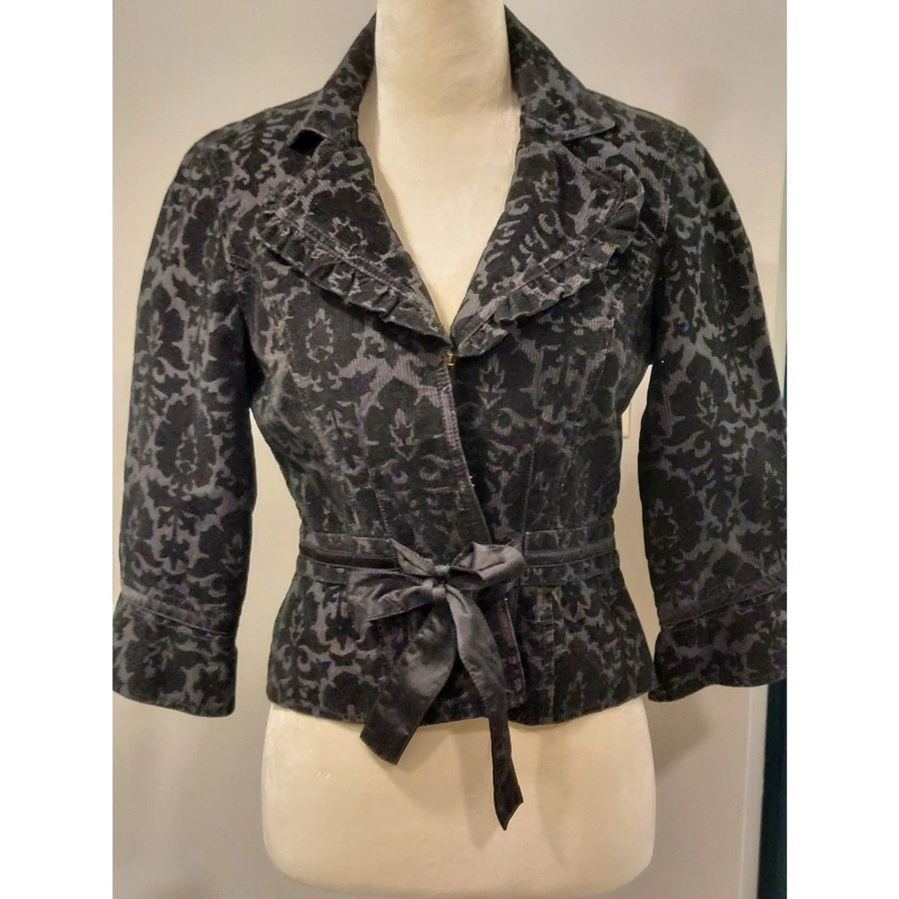 Black corduroy, brocade, cropped blazer Ruffled lapel Cinched at waist with a satin ribbon Three hook closures in front