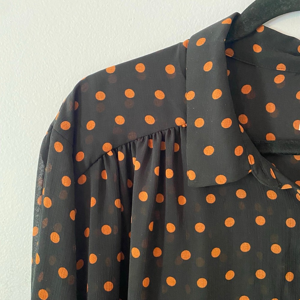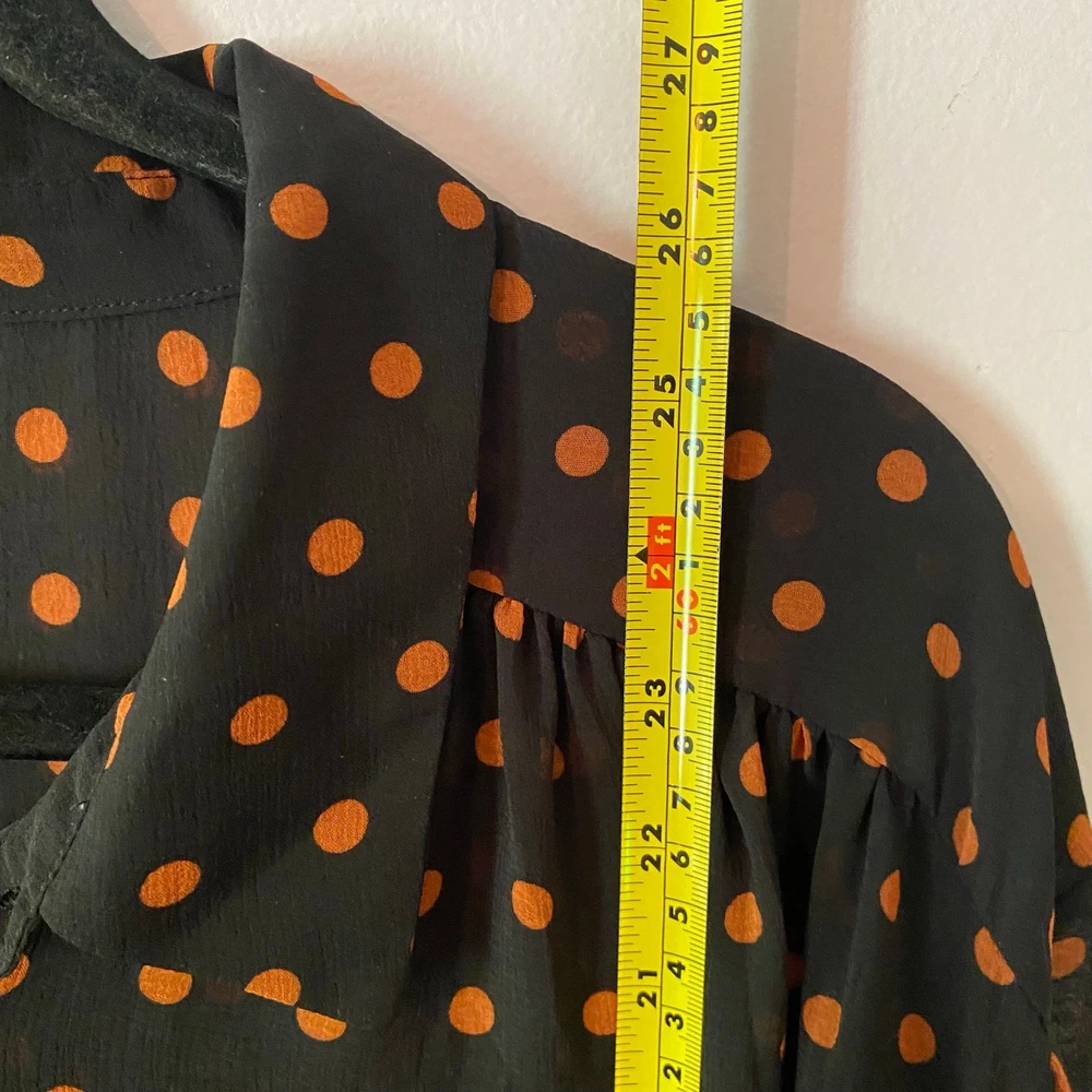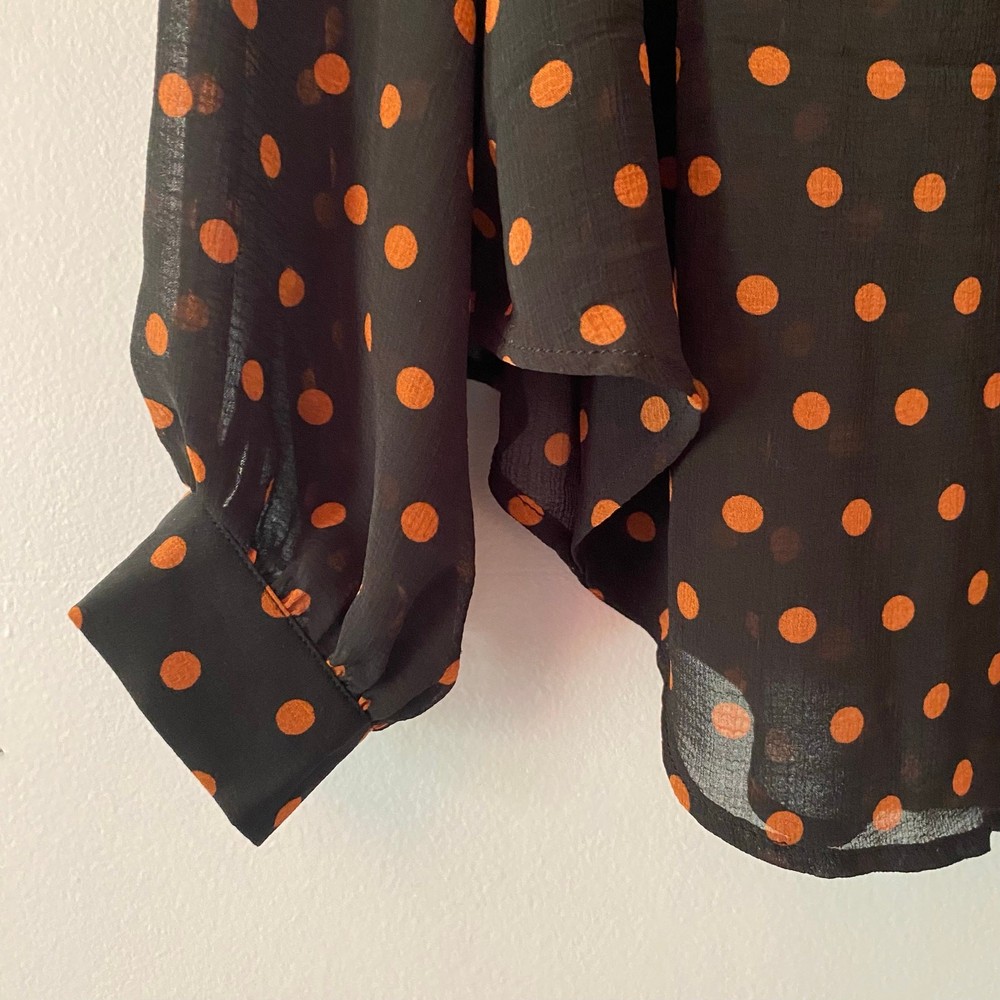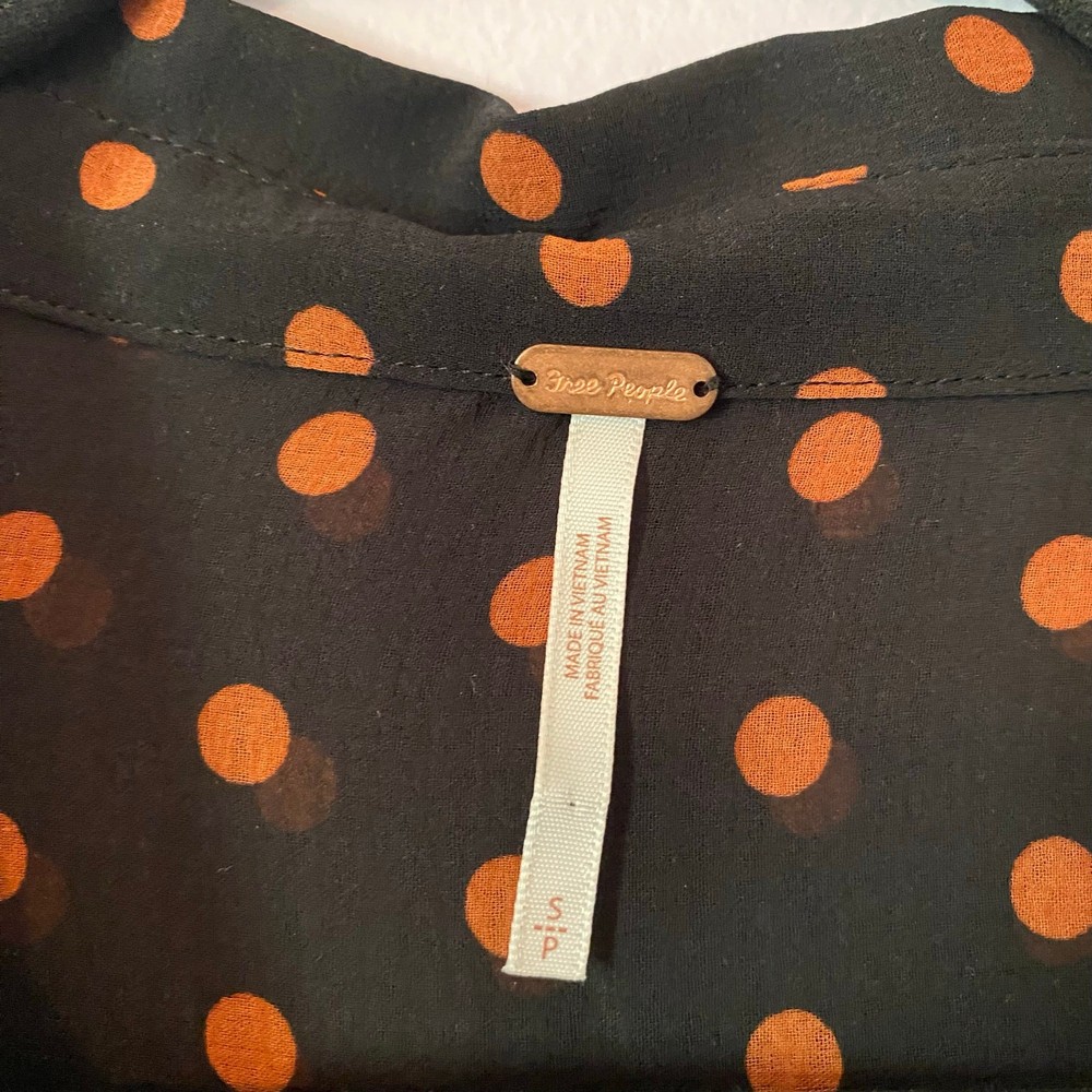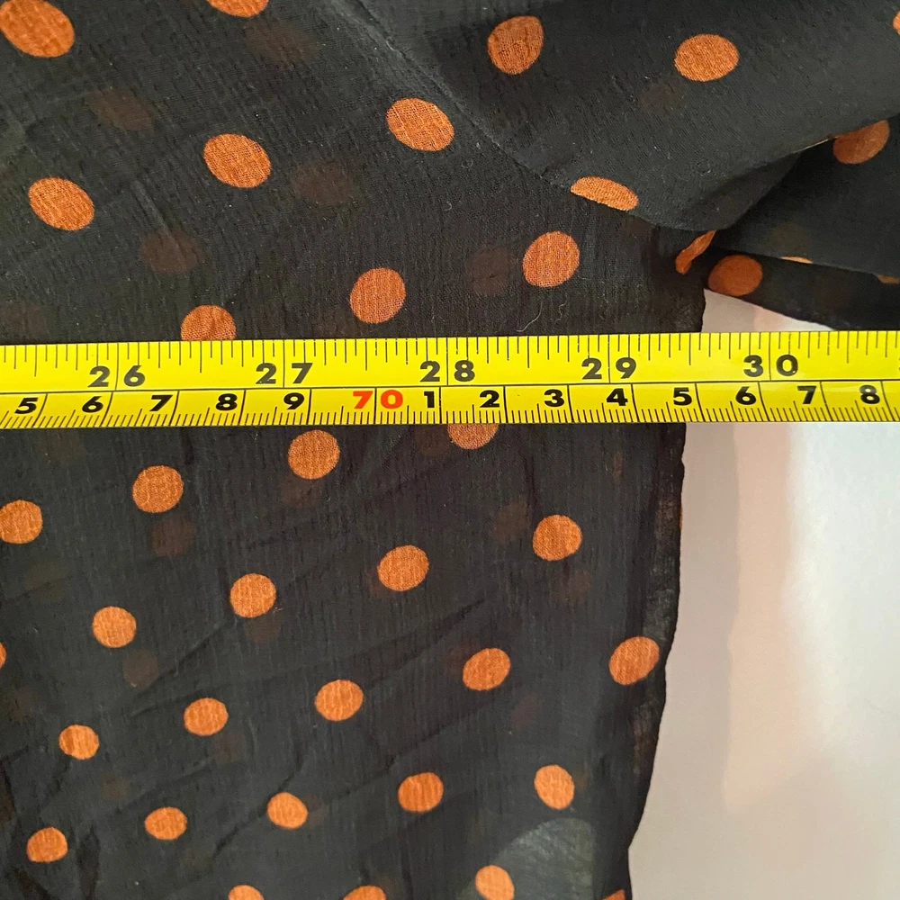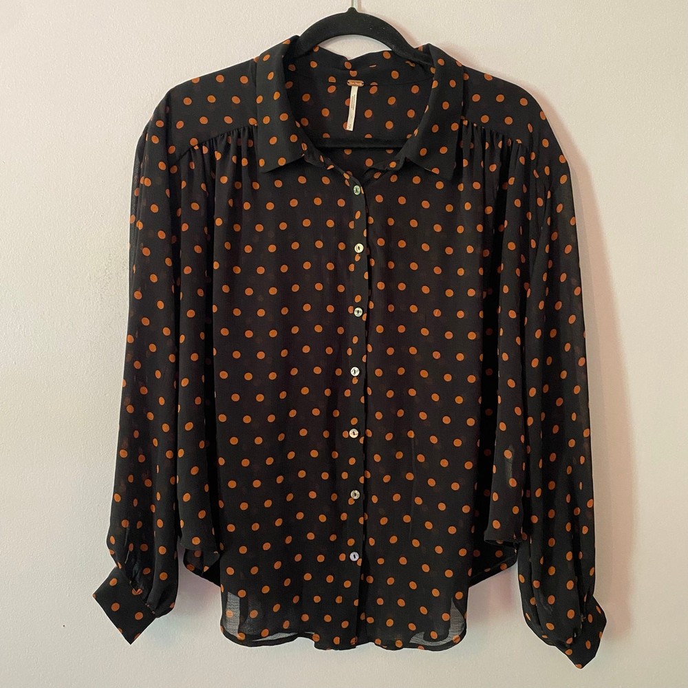 Free People Women's size Small Ciara Black Orange Polka Dot Blouse Lightweight Transparent. Free People brand women's blouse in a size small. Black colorway with orange polka dots. Flowy, lightweight material. Measurements as pictured. In great pre-owned condition, see photos for more details. Always feel free to ask any questions you may have! Reasonable offers accepted.