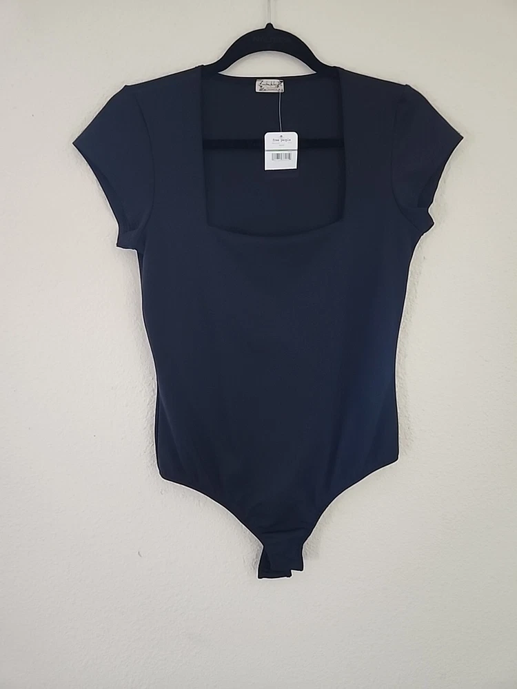 Elevate your wardrobe with this contemporary black body suit from Free People. The slim-fit and classic/fitted sleeve design make it a versatile piece that can be dressed up or down. The square neckline adds a touch of elegance, while the solid pattern and large size make it a statement piece. Perfect for any occasion, this T-shirt is a must-have for any woman's wardrobe.