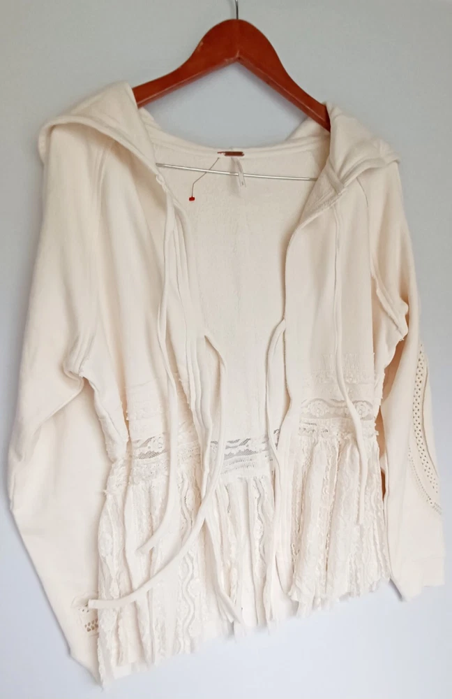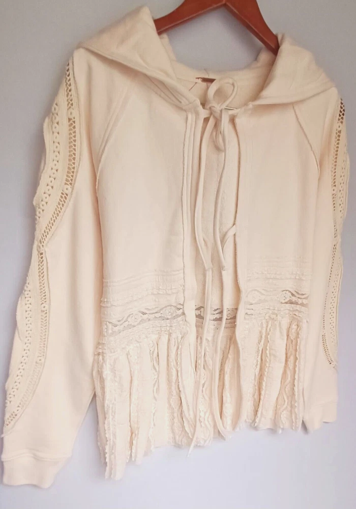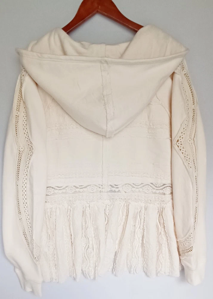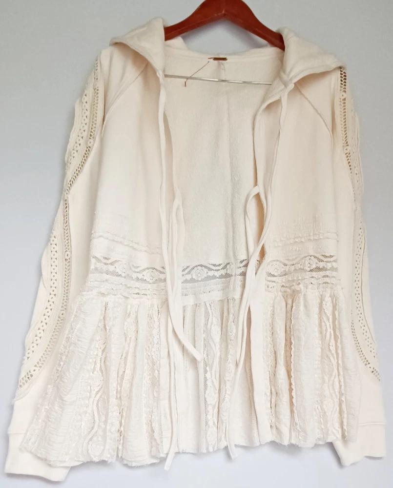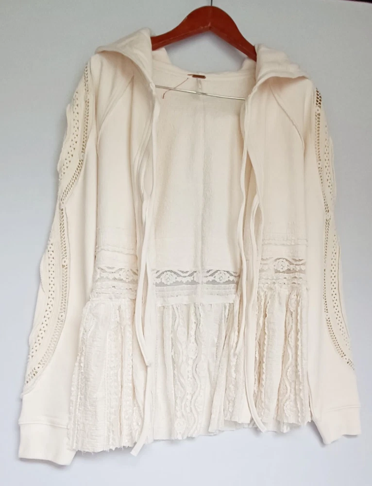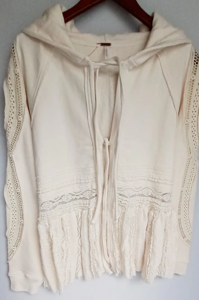 Free People Lace Tiered Hoodie Slouchy Tie Front Ivory Lace Cardigan Bohemian chest 42" size Sp (FITS STANDARD SIZE 8 COMFORTABLY) - MSRP $198.00 FEATURES Soft Cotton fabrication Hooded neckline adjustable tie front closures Long sleeves - elasticated cuffs Sheer Lace trim Exposed seams throughout Gathered to add dimension Excellent layering piece Item ships in protective tissue and sealed non PET poly pouch from pet/smoke free home for your peace of mind. No Flaws - CLEAN - In ready to wear Condition. Review Photos/desc. for size, care & condition SIZING Length: 28.25 in Shoulder to shoulder: 17 in pit to pit: 21 in Bust : 42 in Sleeve Length: 26 in CARE INSTRUCTION Machine wash cold gentle cycle tumble dry low low iron if needed may be dry cleaned