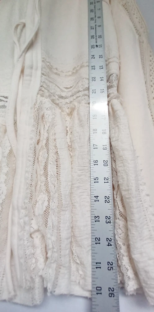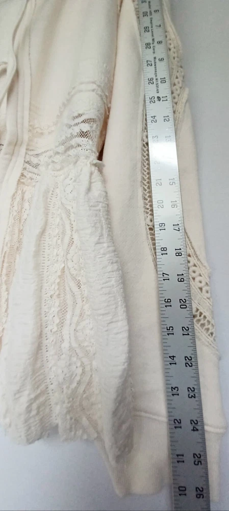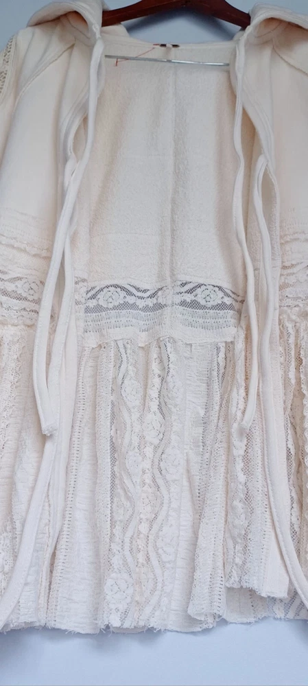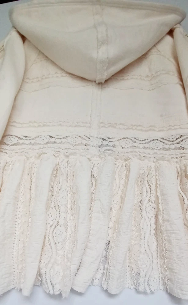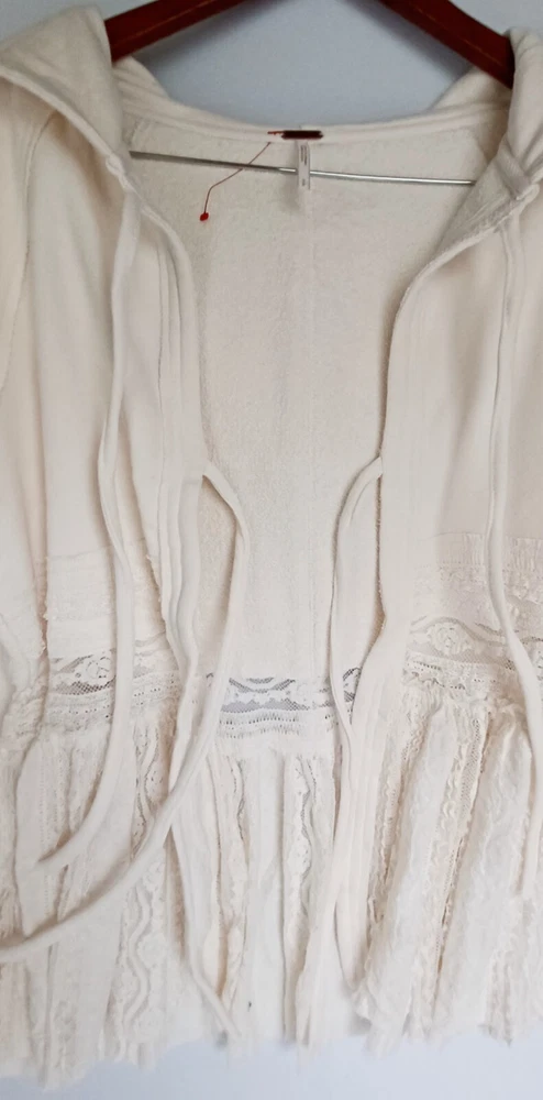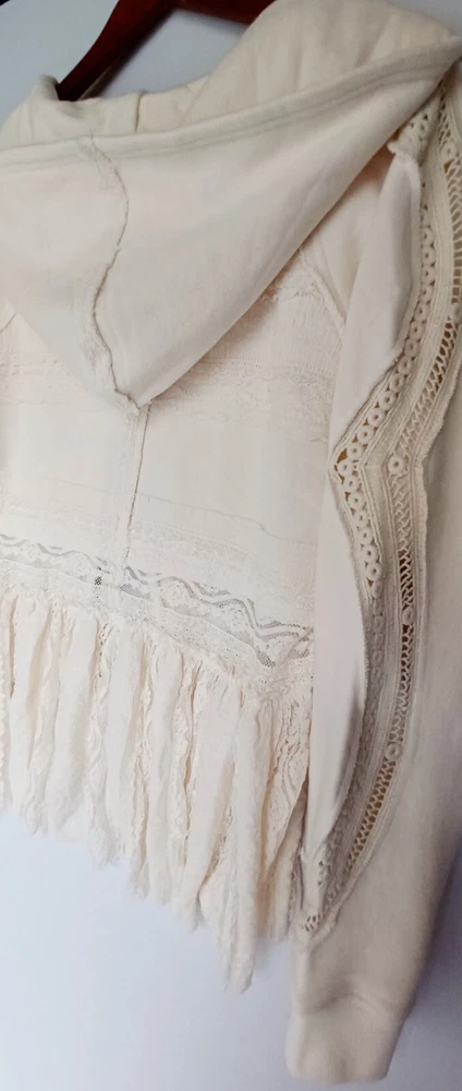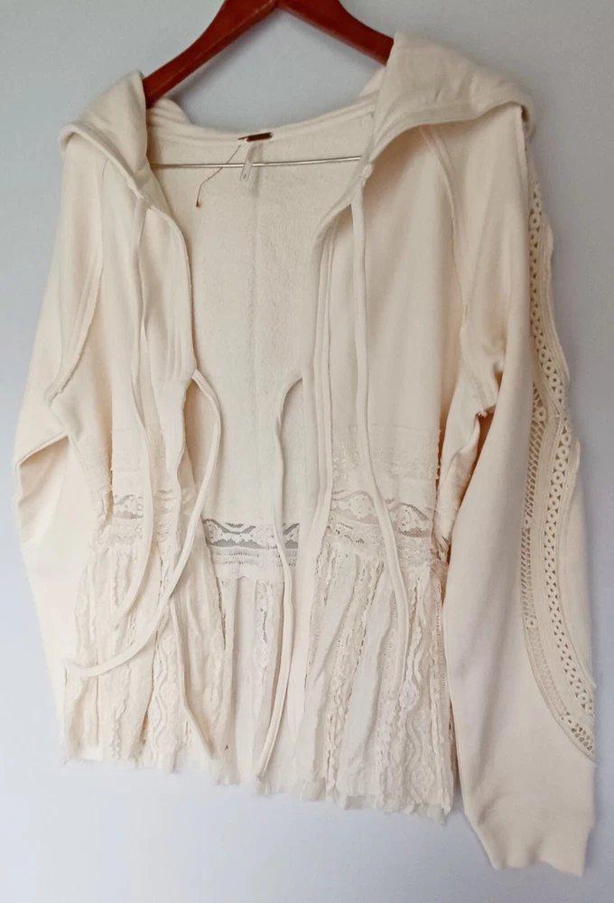 Free People Lace Tiered Hoodie Slouchy Tie Front Ivory Lace Cardigan Bohemian chest 42" size Sp (FITS STANDARD SIZE 8 COMFORTABLY) - MSRP $198.00 FEATURES Soft Cotton fabrication Hooded neckline adjustable tie front closures Long sleeves - elasticated cuffs Sheer Lace trim Exposed seams throughout Gathered to add dimension Excellent layering piece Item ships in protective tissue and sealed non PET poly pouch from pet/smoke free home for your peace of mind. No Flaws - CLEAN - In ready to wear Condition. Review Photos/desc. for size, care & condition SIZING Length: 28.25 in Shoulder to shoulder: 17 in pit to pit: 21 in Bust : 42 in Sleeve Length: 26 in CARE INSTRUCTION Machine wash cold gentle cycle tumble dry low low iron if needed may be dry cleaned