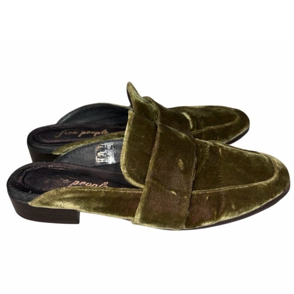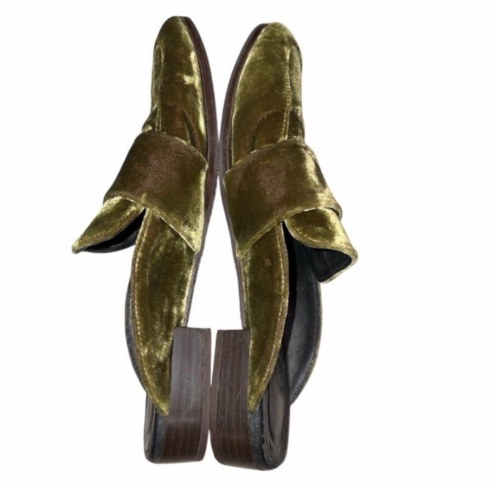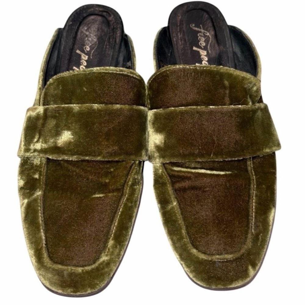 Free People Olive Green Crushed Velvet At Ease Loafers Mules Slides size 38 Excellent condition Women’s, ladies, shoes, slides, slip on, velvet, green, boho, bohemian, classic, fall, winter, preppy, at ease loafer, loafers, mules, flats, free people