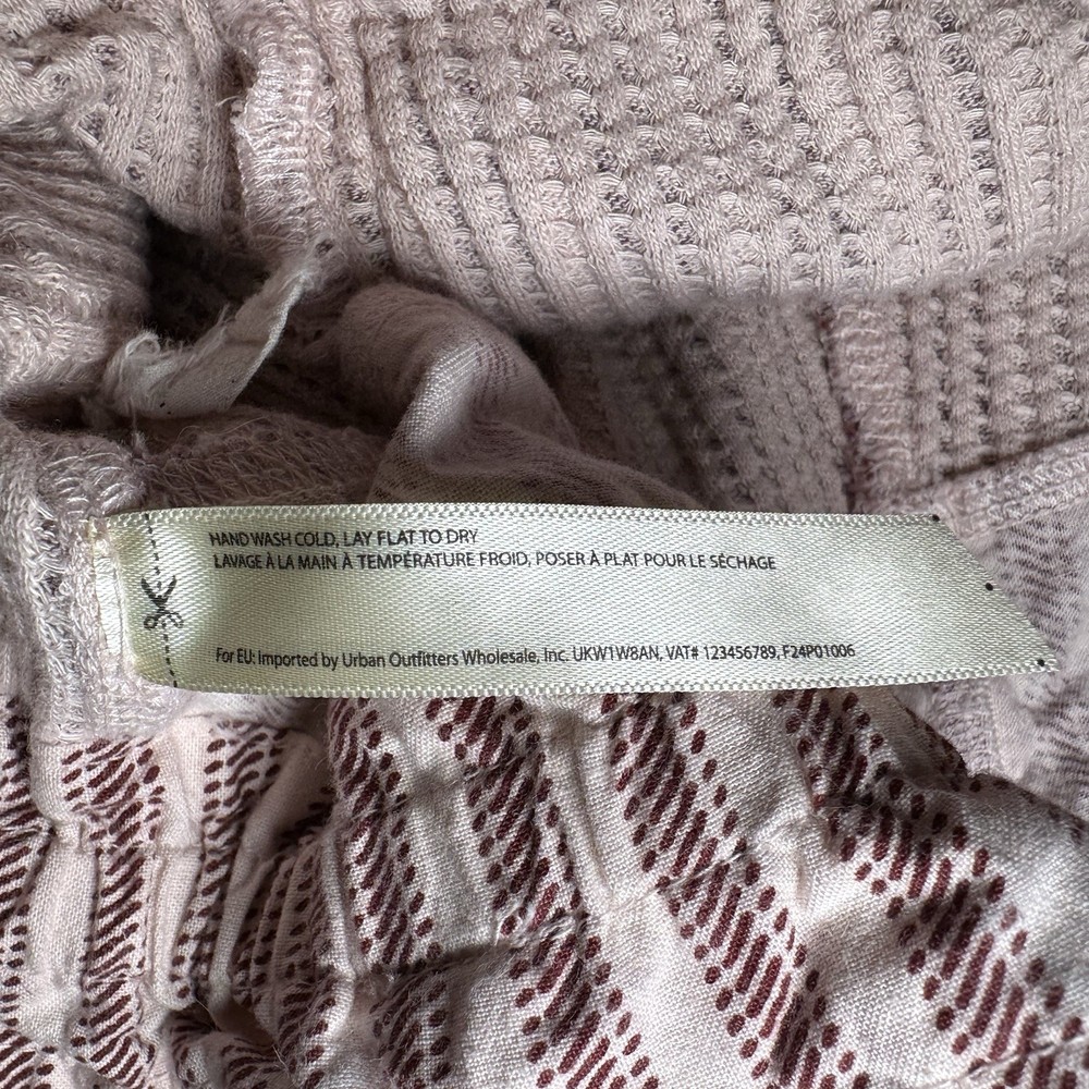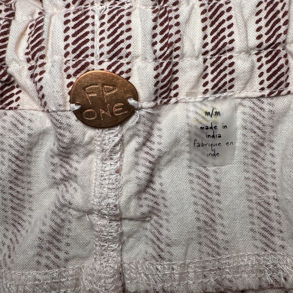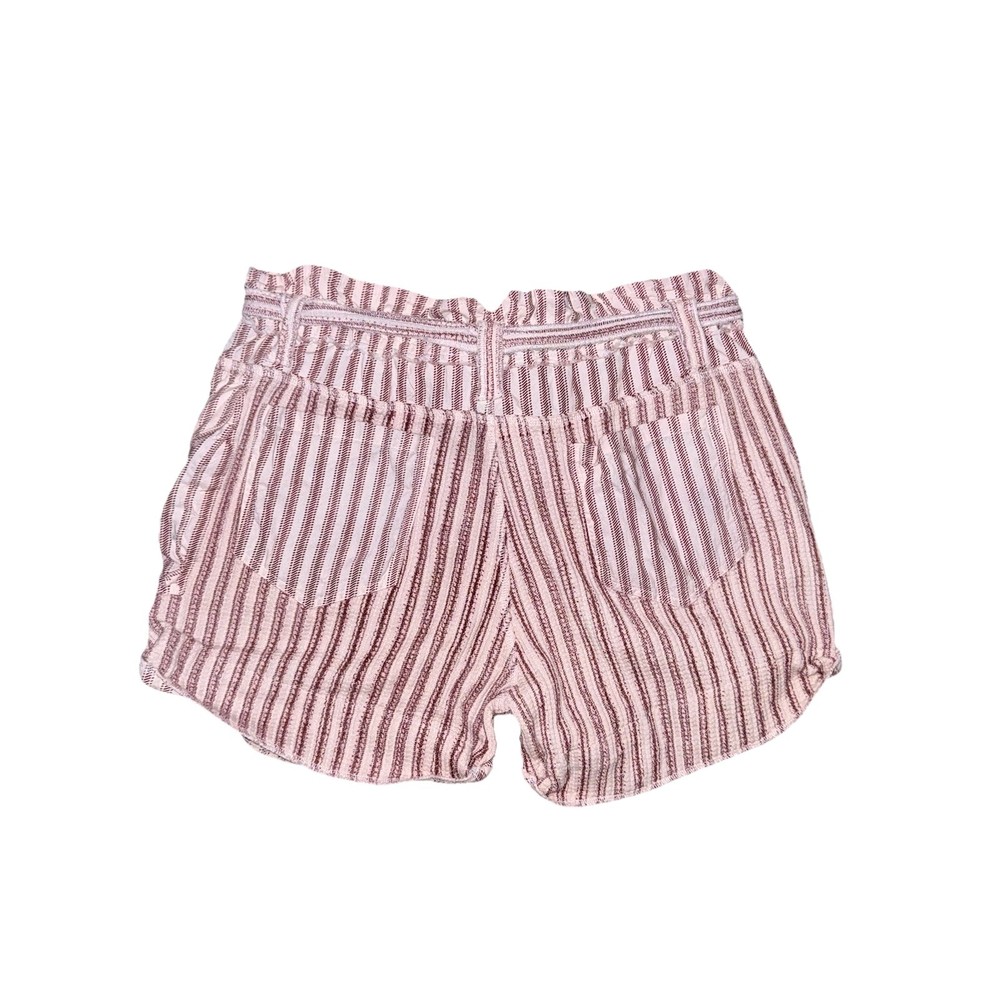 Features: paper-bag style shorts with waist tie and rolled cuff, mauve/ purple stripes and ivory color. One slash pocket and one buttoned pocket on the front, two back pockets. Relaxed fit. Front button is not functional (just for design). 32” waist, 3” inseam, 12” rise 100% cotton Made in India