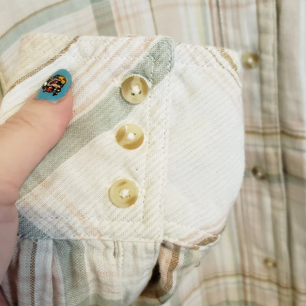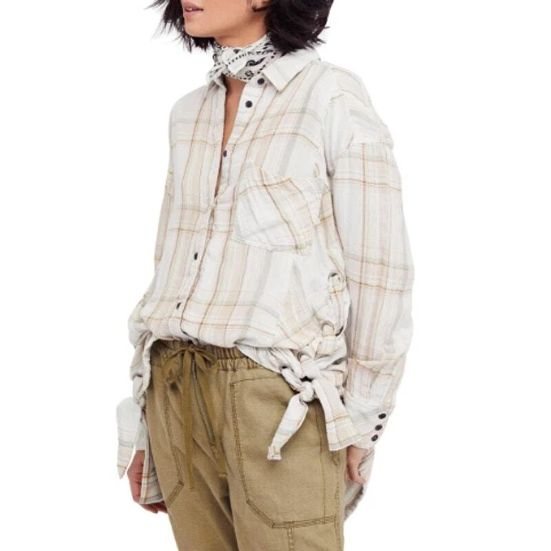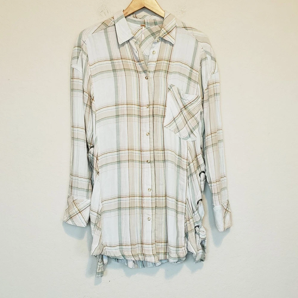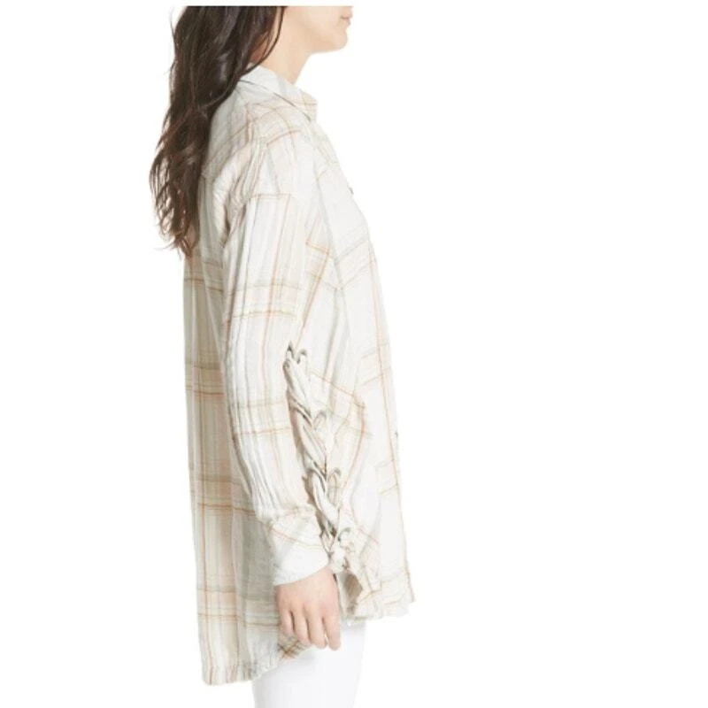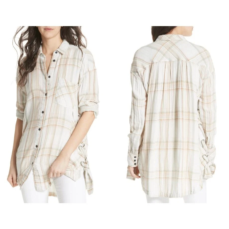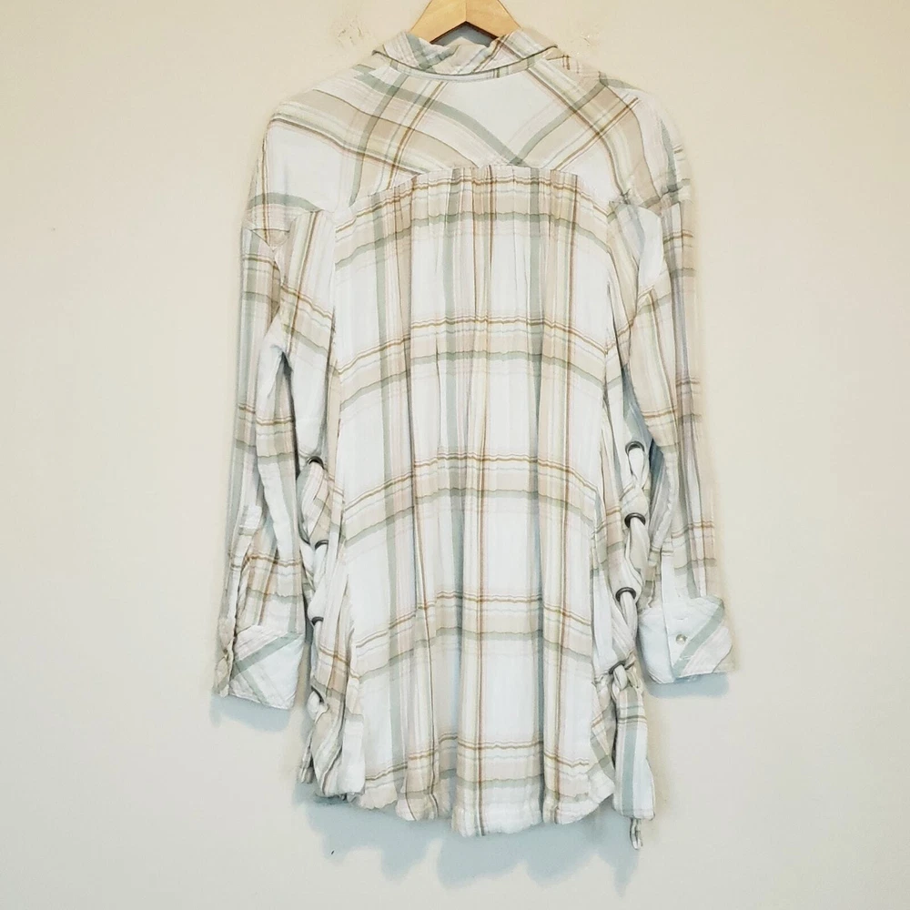 Free People Pastel Plaid Nordic Day Button Front Tunic Top Not your average plaid button-down, this one is styled with a high/low hem and trendy lace-up sides that add fun detail without losing the laid-back feel. Front button closure Point collar Long sleeves with button cuffs Back yoke Lined 51% viscose, 49% cotton Machine wash, line dry Size S Small Approximate Measurements: pit to pit - 22" across length - 31" Excellent pre-owned condition, no rips, tears or stains. Smoke free, dog friendly home. casual everyday comfort plaid flowy soft girl aesthetic pastels fall autumn spring transitional