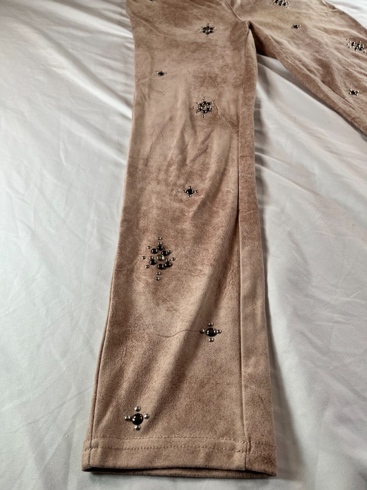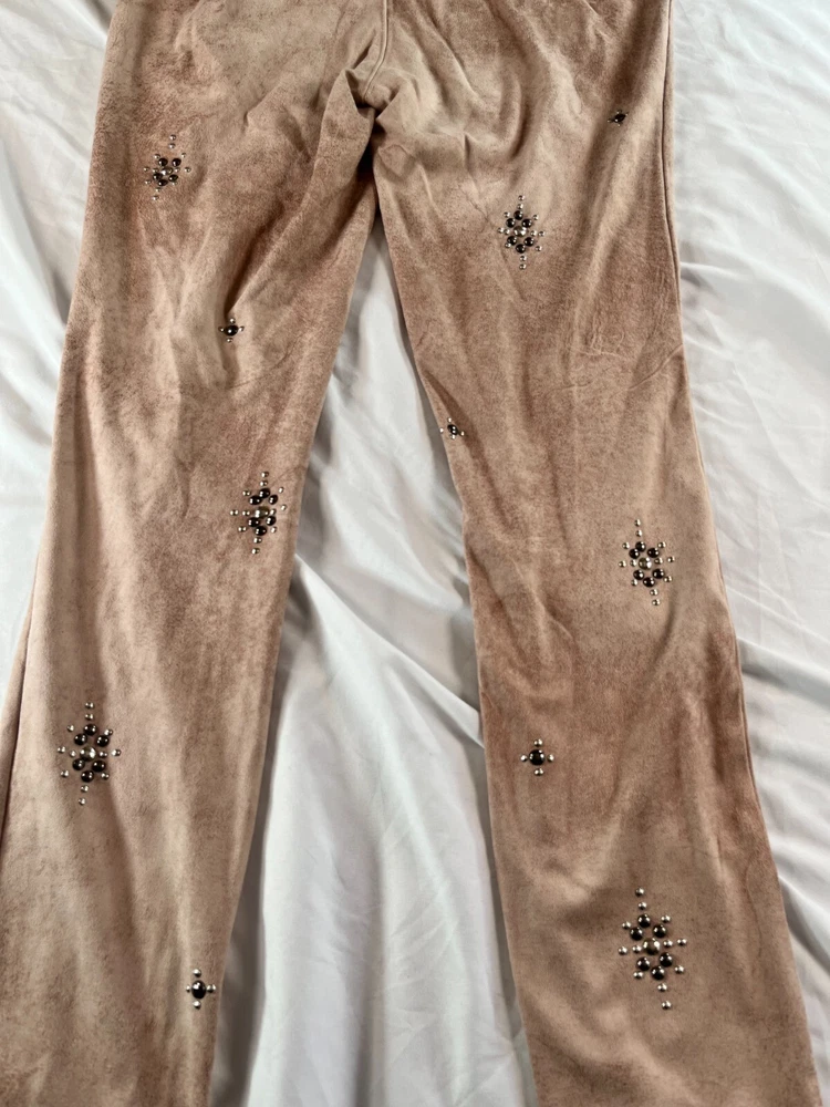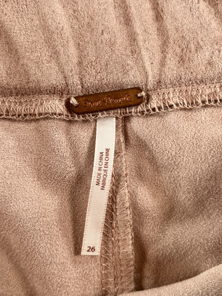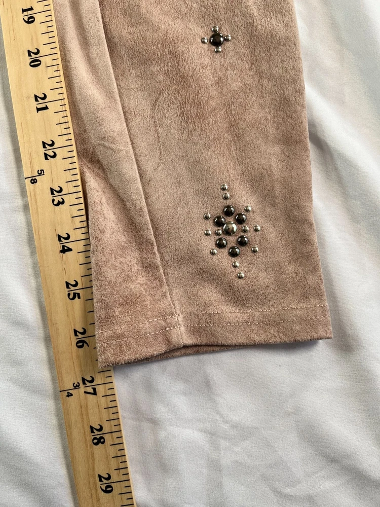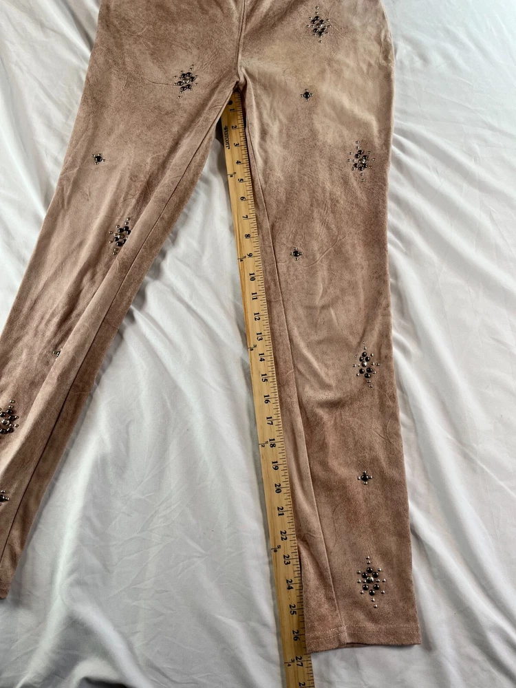 Elevate your style game with these Free People Vegan Cropped Pants in size 26. The beige color and faux suede fabric type make these pants perfect for any occasion, whether it's a party or a casual day out. The high rise waist and pull-on style add comfort and convenience, while the studded accents give them a trendy edge. These pants are made of a polyester blend and have a 27-inch inseam, making them a great choice for any season. Great condition. No rips, tears, stains or smell. **MEASUREMENTS IN PHOTOS** **FAST FLAT RATE SHIPPING**
