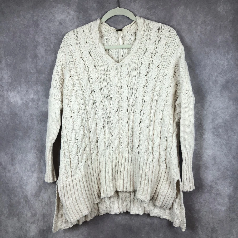 Pattern: Solid Sleeve Length: Long Sleeve Knit Style: Cable-Knit Size: XS Size Type: Regular Garment Care: Hand Wash Only Seller Notes: “Very good pre-owned condition. Light discoloration in the back of the neck. See last picture.” Type: Sweater Material: 100% Cotton, Cotton Color: Ivory Neckline: V-Neck Theme: Beach, Bohemian, Classic, Outdoor, Coastal, normcore Season: Fall, Spring, Summer, Winter Features: All Seasons, Breathable, Oversized Department: Women Style: Tunic Brand: Free People Fit: Relaxed Fabric Type: Knit