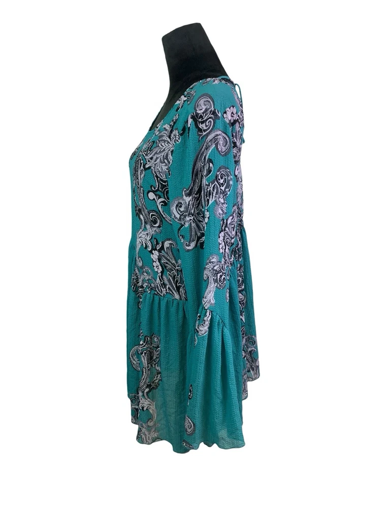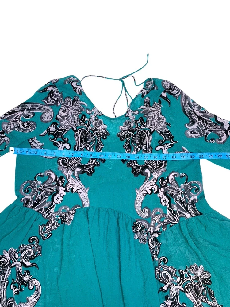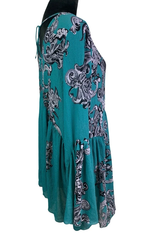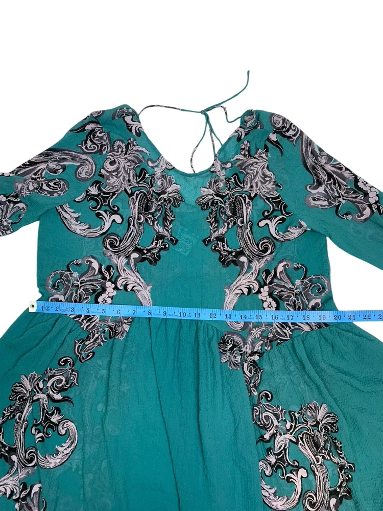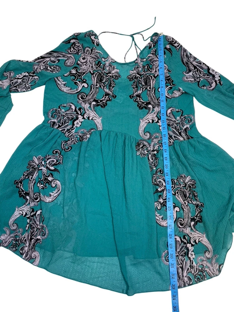 Color: Green Material: Polyester Vintage: No Size Type: Regular Accents: Ruffle, Pleated, Strap, Bow Style: Mini, Shirt Dress Fabric Type: Chiffon Character: Jade Season: Fall, Spring, Summer Pattern: Paisley Occasion: Casual, Party/Cocktail, Travel Department: Women Brand: Free People Features: Sheer, Lightweight Sleeve Length: Long Sleeve Sleeve Type: Bell Sleeve Dress Length: Short Closure: Tie Neckline: Scoop Neck Size: M Theme: Bohemian