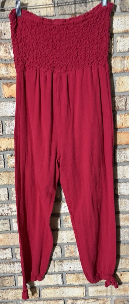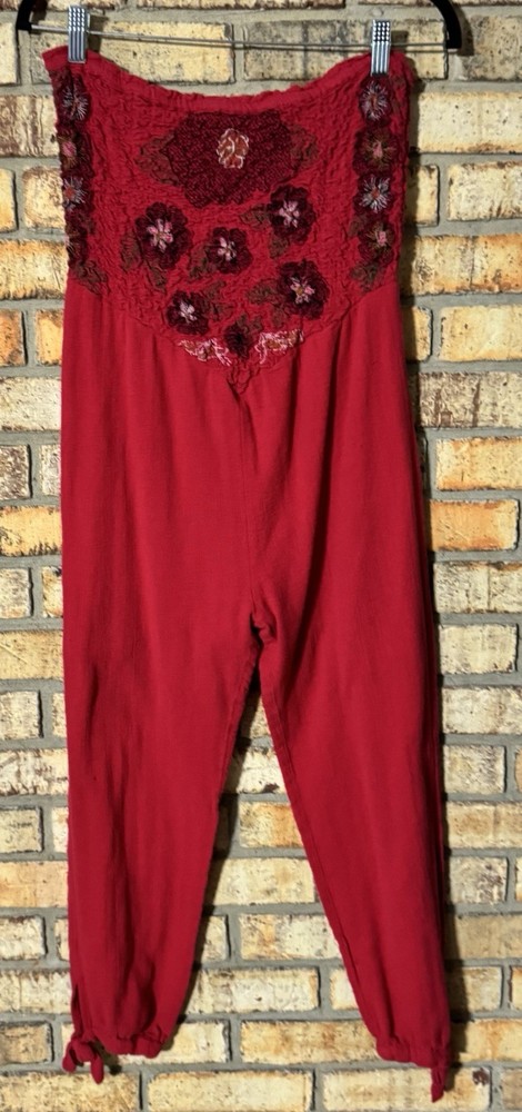 Leg Style:TaperedSize:MNeckline:StraplessSleeve Length:SleevelessStyle:JumpsuitClosure:PulloverFeatures:SmockedOccasion:CasualColor:RedType:One-PieceTheme:BohemianBrand:Free PeopleFit:RegularNumber of Pieces:1 PieceDepartment:WomenInseam:25Size Type:RegularPattern:FloralSeason:Summer, SpringAccents:Embroidered, Smocked