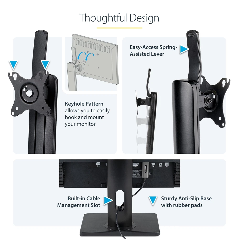 FREE-STANDING SINGLE MONITOR MOUNT SUPPORTS A DISPLAY UP TO 32 INCH (15LB); VESA FREE-STANDING SINGLE MONITOR MOUNT : This monitor stand supports a VESA display up to 32" (15.4lb / 7kg); VESA 75x75/100x100mm; Solid rotating base (+/-40°); coated semi-gloss black finish offers a professional and modern look RANGE OF MOTION: Ergonomic monitor mount increases comfort & productivity with +/-15° tilt, +/-180° screen rotation (portrait/landscape); Entire column swivels +/-40° -TOUCH ADJUSTMENT: Universal monitor stand with height adjustable range of 10.4" to 16.3" (265mm to 415mm) from the desk; The spring-assisted LCD monitor stand offers height adjustments by hand using the easy-access lever at the top of the stand STABLE & NON-SLIP: Freestanding computer monitor mount w/ sturdy anti-slip base (7.8"x9.4" / 200mm x 240mm) and small footprint for maximum stability & flexible placement; Also ideal for glass top desks or surfaces where monitor mounts cannot be installed EASY INSTALL: Keyhole pattern allows you to easily hook and mount your desktop/PC monitor for a faster install; Built-in cable management slot in the lower portion of the column for a tidy workspace; Anti-slip rubber pads prevent scratches on desk surface