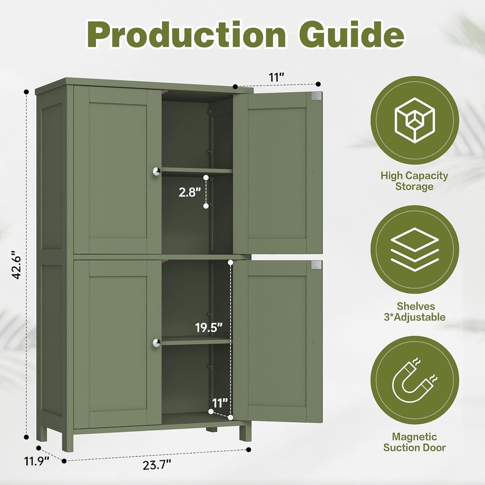 Product Description About this item [Ample Storage Capacity] The bathroom cabinet comes with an upper and a lower compartment, offering abundant room for your hairdryer, towels, makeup, bath products, and other essentials. [Tailored Storage Solution] Effortlessly modify the shelf inside each storage cabinet to five distinct positions, enabling you to conveniently store items of different heights with ease with this pantry cabinet. [Quality Meets Elegance] Constructed from top-grade MDF and fitted with an anti-tipping mechanism, this bathroom storage piece is robust and steadfast. Its attractive decorative panels add a touch of charm to your bathroom. [Safety Assured] The smooth rounded corners reduce the risk of accidental knocks, while the included anti-tip kit allows you to firmly attach the bathroom cabinet to the wall. These features work together to ensure a secure living space. [Easy to Assemble] With labeled components and clear instructions, putting together this freestanding cabinet is a breeze. On Aug 12, 2025 at 18:35:59 PDT, seller added the following information: