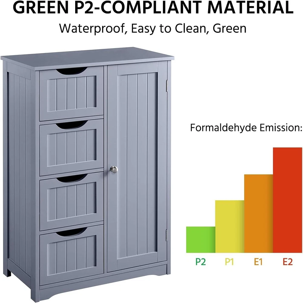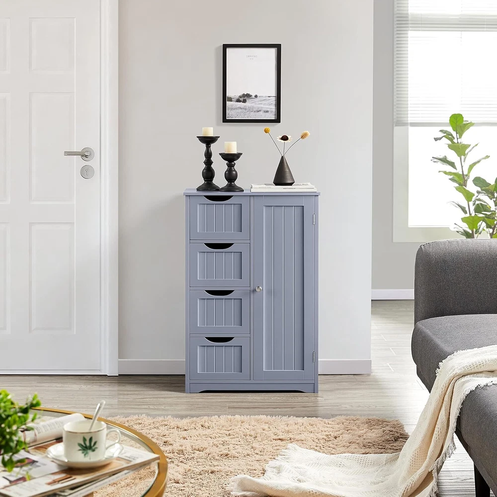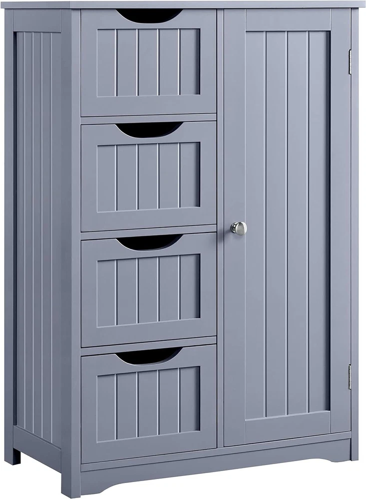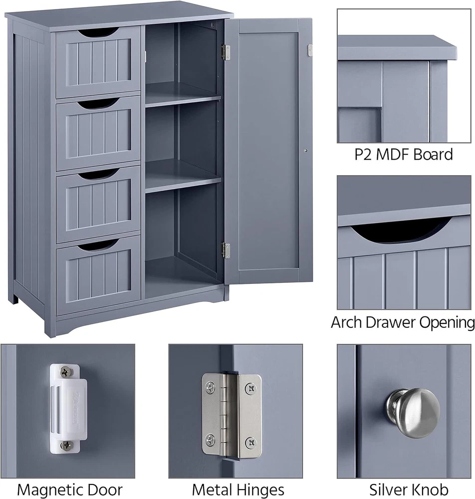 Product Description Wooden Bathroom Cabinet 4 Drawers & Cupboard Bathroom Storage Unit Hallway/Floor Cabinet Gray If extra toiletries and spare towels are piled up in your bathroom ensemble, having a spacious storage cabinet can help you hide all the clutter behind the door and out of sight. This 22” L x 12” W x 32’’ H cabinet has 4 no-handle sliding drawers and 1 roomy cupboard with an adjustable shelf. Once you have it, the storage space in your bathroom, sitting room will be instantly expanded. Its clean-lined design with slatted paneling works well in a variety of aesthetics. Specifications: Material: P2 MDF Overall dimension: 22 x 12 x 32.5'' (LxWxH) Drawer interior size:8.8 x 9.6 x 3.9'' (LxWxH) Shelf size: 10 x 10.1'' (WxL) Adjustable distance between shelves: 6.3''; 8.9''; 11.3'' G.W.: 40.8 lb Color: Gray Bullet Point Sturdy construction Ideal space saver Adjustable shelf height Waterproof surface Safety is priority All-matching design Easy to assemble Product Details Adjustable shelf height Three easy-to-set shelf heights for your different storage needs. Heavy-duty Metal Knobs Vintage metal knobs for good durability and texture. Added Safety Anti-toppling fitting can secure the cabinet to the wall for dual safety. P2 MDF High quality material for you and long-term use. Multi-scenario application Storage Cabinet Bathroom Floor Cabinet Hallway Floor Cabinet Bathroom Floor Cabinet with 2 Doors and 2 Shelves Bathroom Floor Cabinet with 4 Drawers and 1 Cupboard Bathrroom Floor Cabinet with 4 Drawers Bathroom Floor Cabinet with Multiple Tiers Shelves 2-Tier Console Table Add to Cart Add to Cart Add to Cart Add to Cart Add to Cart Customer Reviews 4.5 out of 5 stars 1,312 4.4 out of 5 stars 7,699 4.5 out of 5 stars 2,203 4.6 out of 5 stars 2,911 4.7 out of 5 stars 3,951 Price $69.99 $ 69 . 99 $94.99 $ 94 . 99 $69.59 $ 69 . 59 $76.99 $ 76 . 99 $52.79 $ 52 . 79 Color Grey Grey Grey Grey Grey Materials MDF MDF MDF MDF MDF Overall Dimensions 24 × 12 × 32 inch 26 × 14 × 35.5 inch 12 × 12 × 32.5 inch 22 × 12 × 34 inch 40 x 11.8 x 32 inch Max Weight Capacity Tabletop: 33 lb Each Shelf: 26.5 lb Bottom Board: 26.5 lb Tabletop: 7.2 lb Drawer: 8.8 lb Shelf: 22 lb Tabletop: 19.8 lb Each Drawer: 7.7 lb Tabletop: 51 lb Open Shelf: 22 lb Drawer: 6 lb Movable Shelf: 18 lb Tabletop: 79.4 Pound Shelf:57.3lb s