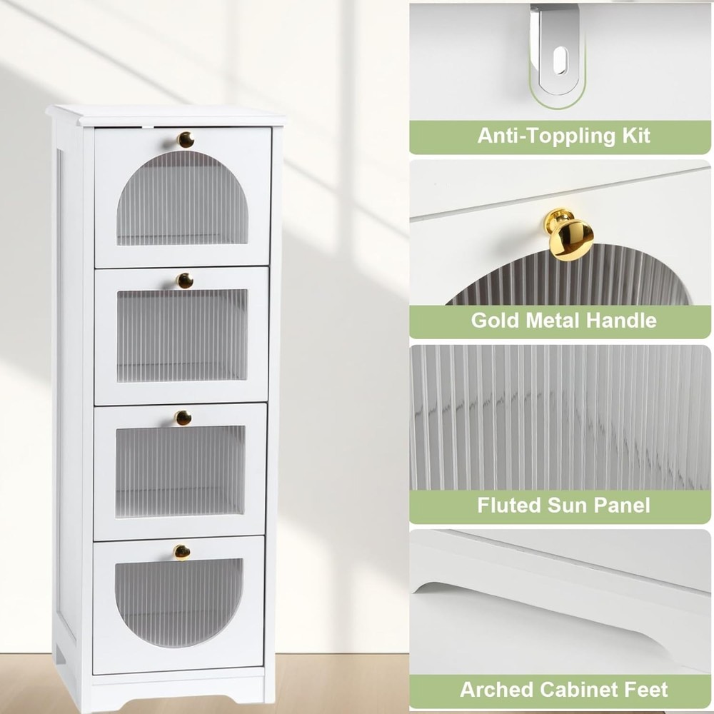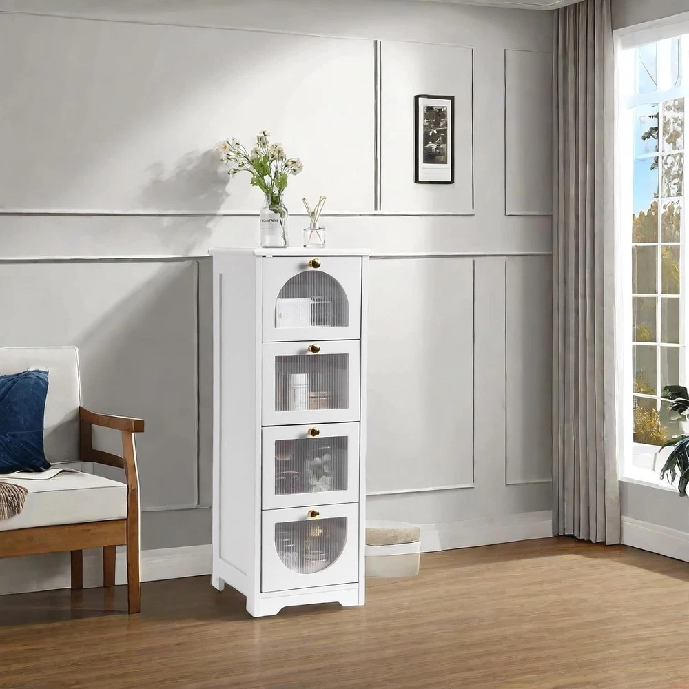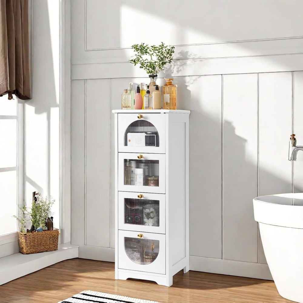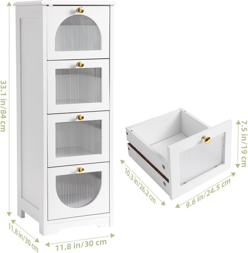 Product Description Elevate your decor with our bathroom floor cabinet featuring semi-transparent panel fronts on drawers, adding a touch of sophistication to your space. The sleek white finish and modern design complement various decorating styles effortlessly. About this item Unique Design: Elevate your decor with our bathroom floor cabinet featuring semi-transparent panel fronts on drawers, adding a touch of sophistication to your space. The sleek white finish and modern design complement various decorating styles effortlessly. Space-Saving Functionality: Measuring 11.8" W x 11.8" D x 33.1" H, this slim cabinet fits seamlessly in any room. The chic white finish and clean lines make it ideal for bathrooms, bedrooms, or living rooms, offering a stylish storage solution without taking up much space. Ample Storage: With 4 spacious drawers, this cabinet provides ample space for towels, toilet paper, cosmetics, toiletries, and essentials. Innovative drawer design and unique gold handles enhance functionality and style, creating a cozy bathroom ambiance. Waterproof Surface: The painted surface is completely waterproof, ensuring durability and easy maintenance to keep your cabinet looking pristine for longer. It's the perfect storage solution for organizing your bathroom essentials in style. Easy Assembly: Each part is numbered for quick, hassle-free assembly, allowing you to enjoy your new storage solution instantly. Ideal for stylishly organizing your bathroom essentials! On Aug 7, 2025 at 03:07:03 PDT, seller added the following information: