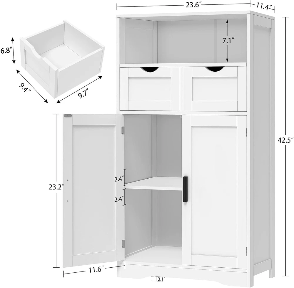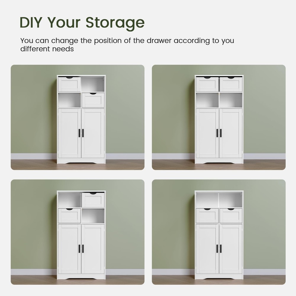 ⭐[Ample Storage for Various Needs] A tabletop, 2 drawers, an open shelf and a small 2-tier cabinet make this storage cabinet for different storage needs. Most decorations, books, and kitchen items can be packed away in an orderly manner, and make space always keep tidy and clean. It is perfect if you need to have more shelves or cupboard to keep extra supplies. ⭐[Customize Storage Space] Our bathroom cabinet features an adjustable internal shelf that can be set to 3 different positions for a cabinet space customized to your needs, providing the flexibility to accommodate items of various heights. ⭐[Where Do You Put It?] In the bathroom for towels? In the kitchen for utensils? Or maybe in the living room for books? This storage cabinet fits effortlessly into any room in your home and adapts to your needs with flair. ⭐[Water-Proof Structure] Constructed of superior P2 MDF board, the storage cabinet can withstand the humidity and prevent moisture, perfect storage for bathroom and kitchen. Environmentally friendly surface ensures no harm and odorless, protecting you and your family from potential dangers ⭐[Assembly Is a Breeze] We updated the instruction to make it more clearly. The instruction is very detailed and easy to read, and even inexperienced people can quickly complete the installation. Feel free to email us if kitchen cabinet has any quality problems, we will send you a new one or give you 100% refund.