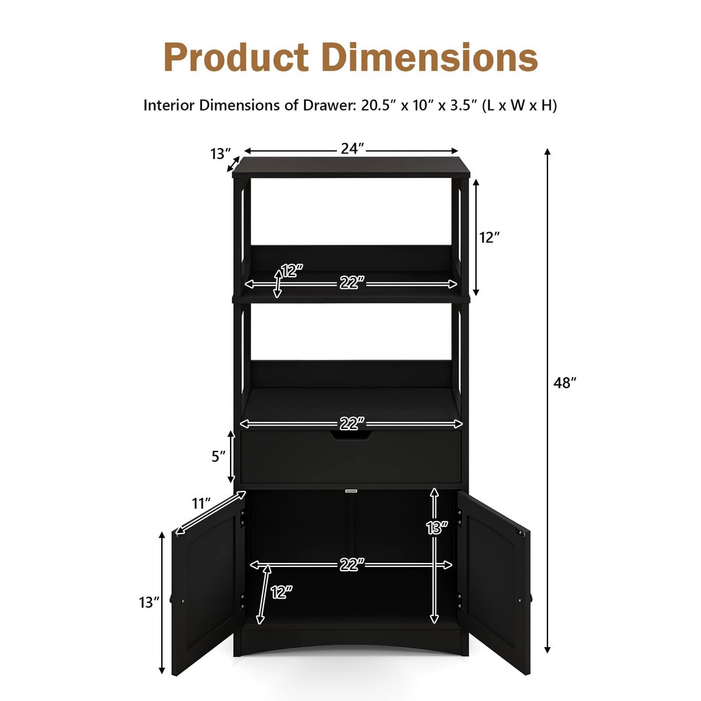 Description: Our storage cabinet cleverly utilizes vertical space, making it a perfect solution for those who need to maximize storage in small areas. With its open shelves, sliding drawer, and cabinet, you have flexible storage options for all your bath essentials and other items. The top shelves are ideal for displaying decorative items or holding frequently used products. The middle sliding drawer provides a convenient place to store smaller items, such as toiletries or accessories. The bottom cabinet offers concealed storage for larger items or things you want to keep out of sight. Our storage cabinet not only helps you keep your home organized but also brings an element of sophistication to your space. Its smart design, reliable construction, and timeless aesthetic make it a perfect choice for anyone seeking practicality and beauty in a storage solution. Features: Provides ample storage space with 2 layers, a drawer, and a door cupboard. Odorless paint makes the surface waterproof and moisture-resistant Anti-topping design for added security Made from premium materials for durability and sturdiness. Its elegant and simple design suits any home decor style. Assembly is easy with detailed instructions and a high-quality hardware set. Used in a wide range of applications, including bathrooms, kitchens, living rooms, studies, and entryways. Specification: Color: White (As Picture Show) Main Material: MDF+PB Product Dimension: 24 x 13 x 48 inches (L x W x H) Net Weight: 40 lbs Weight Capacity: 20 lbs (Each Drawer) 35 lbs (Each Layer) Package Includes: 1 x Storage Cabinet 1 x Instruction Sturdy Construction: Crafted from premium engineered wood and MDF, this storage cabinet with doors and shelves boasts exceptional durability for long-lasting use. With a robust load-bearing capacity of up to 176 lbs, it is designed to withstand heavy items. The inclusion of plastic slide rails and anti-drop accessories further enhances its stability Ample Storage Space: Featuring two shelves, one drawer, and a base cupboard with two doors, this tall bathroom storage cabinet offers ample storage space for your essentials, kitchenware, and other items, helping you keep your home well-organized. With dimensions of 24"L x 13"W x 48”H, it provides plenty of room to accommodate your belongings Versatile Functionality: Designed with a rational and versatile layout, this multifunctional furniture piece can be used as a kitchen cabinet, cupboard, microwave cabinet, or accent entryway bar storage table. Its versatility makes it suitable for various areas in your home, including the kitchen, living room, or bathroom Distinctive Style: With its simple yet modern design, this elegant cabinet complements any home decor effortlessly. Its aesthetic appeal adds a touch of charm to your living space. Additionally, the top board of the cabinet offers a perfect spot to di splay decorative items or vibrant flowers, enhancing the overall ambiance of your room Effortless Assembly & Maintenance: The large kitchen pantry is easy to assemble, and all the necessary accessories are provided for your convenience. Simply follow the clear and user-friendly manual to assemble it quickly. Moreover, the pantry's surface can be easily cleaned with a damp cloth, ensuring hassle-free maintenance and upkeep
