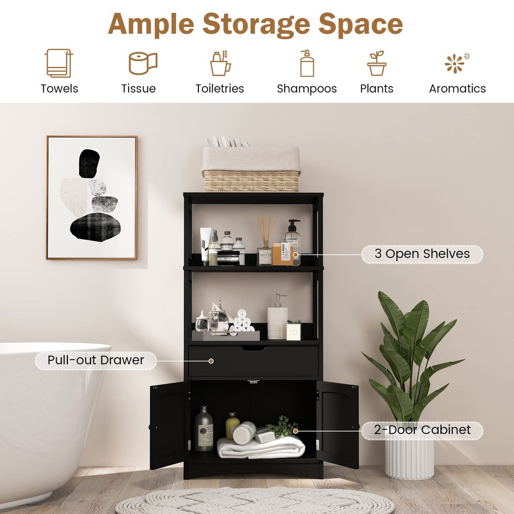 This bathroom cabinet is a game-changer for small spaces! The open shelves are perfect for quick access to daily essentials, while the drawer keeps smaller items neatly organized. The bottom cabinet offers hidden storage, keeping everything tidy yet within reach. Sturdy, stylish, and super functional—it’s exactly what my cluttered bathroom needed!