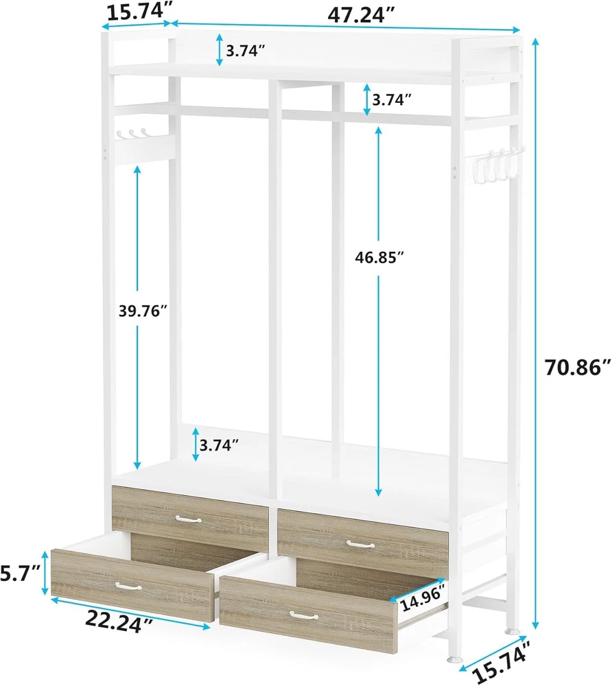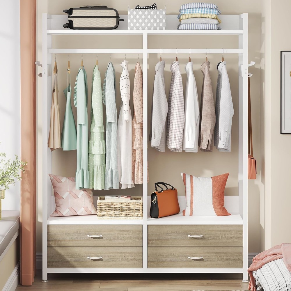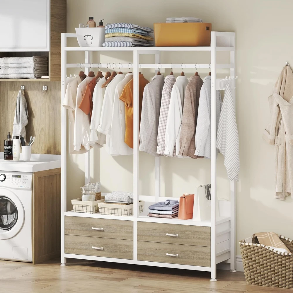 Color White Walnut Assembly Required Yes Item dimensions L x W x H 16 x 47 x 71 inches Product Care Instructions Wipe with Dry Cloth GOOGBYE CHAOS: This closet rack with drawers offers spacious space with different functional areas for your clothing and stuff. This garment rack has a 47’’ rod for hanging clothes. The top and bottom shelves, 4 drawers, and 8 hooks are perfect for holding suitcases, baskets, shoes, and bags in good order. UNIQUE 4-DRAWER DESIGN: The open wardrobe closet has 4 spacious drawers for concealed storage. Drawers design means the full storage potential in the same storage space. You can pile up the dumping things but still look tidy after you close the catch-all drawers. STRONG BEARING CAPACITY: This heavy-duty closet organizer has a premium thickened metal frame. The wardrobe rack provides superb stability even holding tons of clothes and accessories. The safety is guaranteed with the anti-tip straps if you have kids who might use it as a climbing frame. RETRO INDUSTRIAL STYLE: The rustic wood of the clothes garment rack will warm up your space and the metal pipe design adds an industrial edge. This industrial-style clothing rack with shelves offers a retro charm effortlessly into any decor.