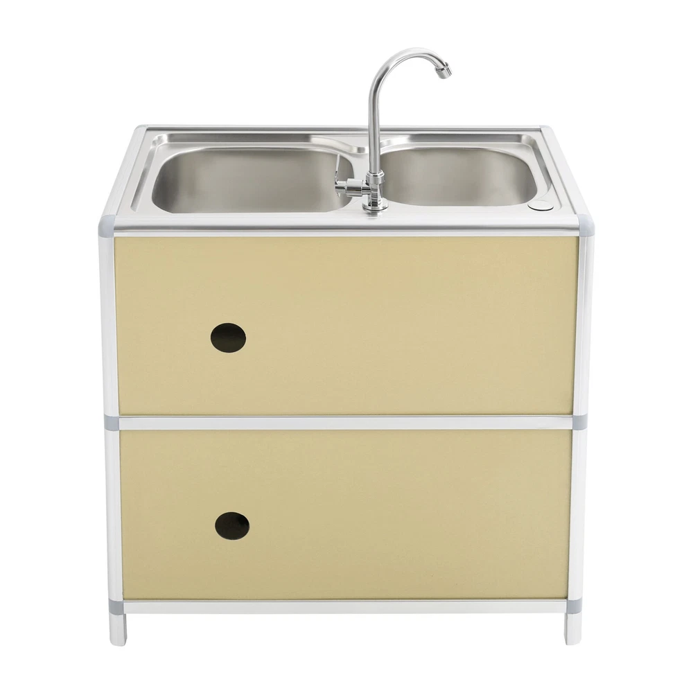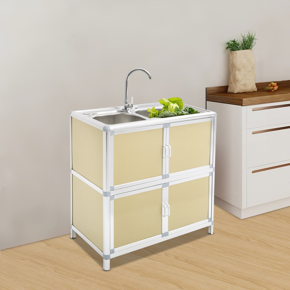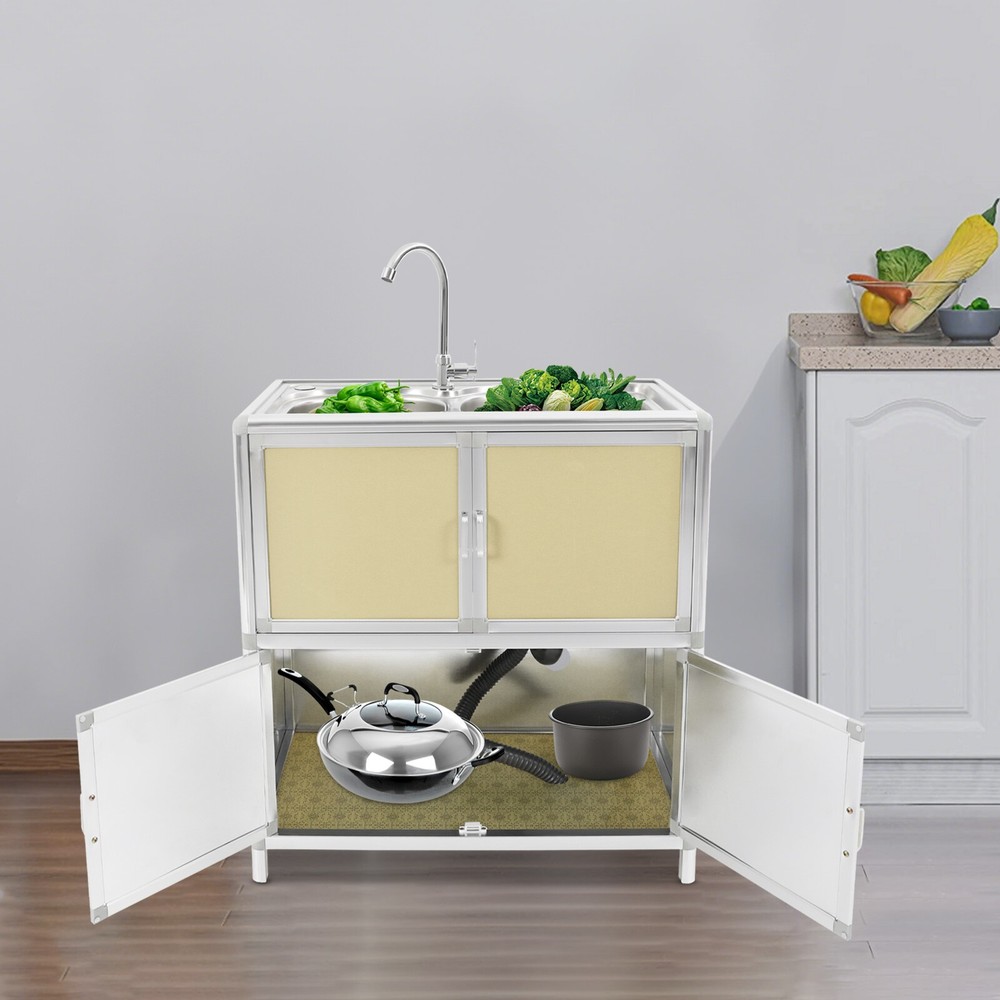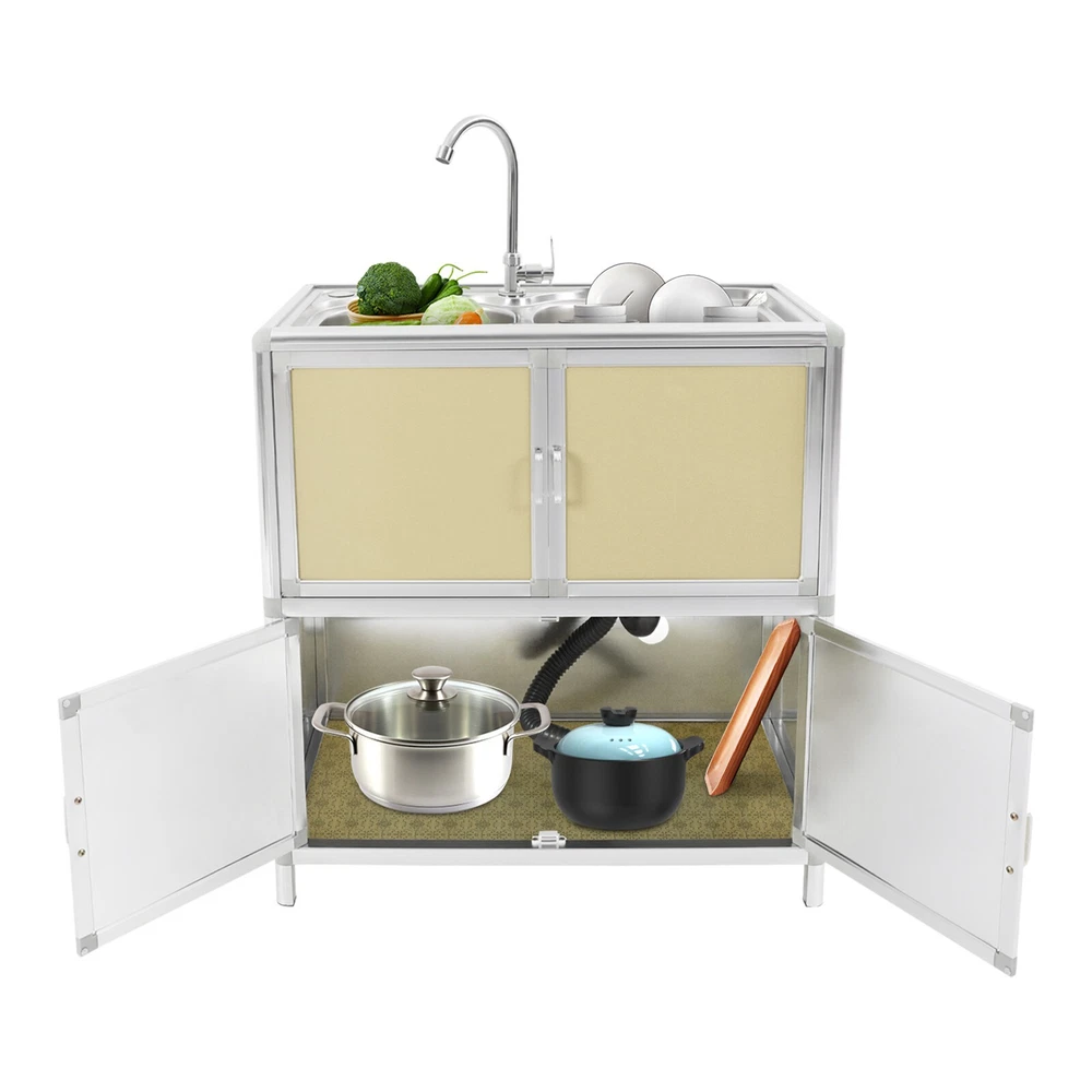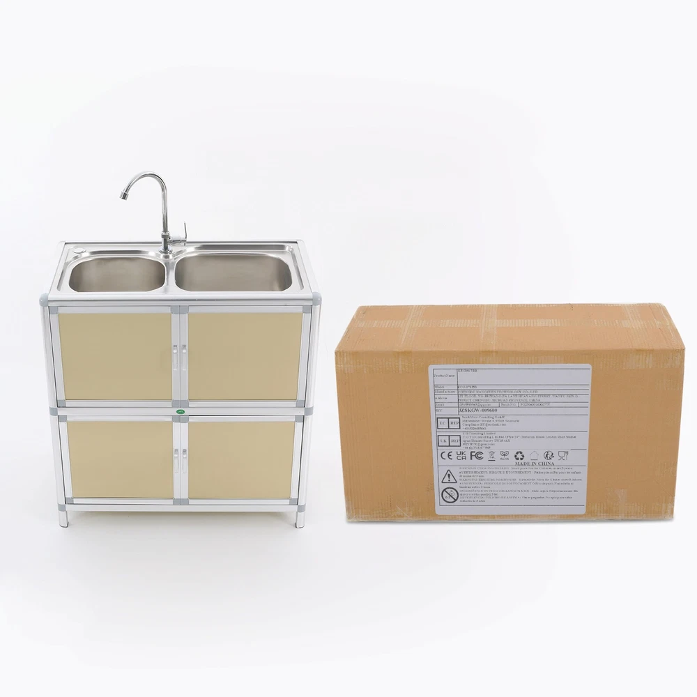 Specification Material: Aluminum Plastic Panel, 201 Stainless Steel, Aluminum Alloy, Plastic, Tempered Glass Color: Gold Style: Modern Assembly Required: Yes Mounting Type: Free Standing Faucet Rotation Angle: 360° Inlet Pipe Interface Specification: 1/2'' Inlet Pipe Length: 80cm/31.5in Drainpipe Length: 80cm/31.5in Door Panel Thickness: 2mm/0.08in Foot Height: 6cm/2.36in Each Door Height: 32cm/12.6in Cabinet Inner Max. Load Capacity: 10kg/22.05 lbs Product Size(Faucet Excluded): 75*42*80cm/29.53*16.54*31.5in Package Size: 81.5*49*27cm/32.09*19.29*10.63in Gross Weight: 15kg/33.07 lbs Net Weight: 13kg/28.66 lbs Package Included 1* Kitchen Sink with Cabinet 1* Faucet 1* Inlet Pipe Other Accessories for Assembly Modern Kitchen Sink Freestanding Sink with Cabinet/Faucet for Home Kitchen New Description This kitchen sink with a cabinet has a clean and practical design that combines modern aesthetics with functionality. Its overall visual effect is fresh and suitable for various home styles. The cabinet design helps organize daily cleaning supplies and makes your kitchen tidier. The 201 stainless steel sinks are safe to use with excellent corrosion resistance and easy cleaning. It will be your right hand for daily kitchen tasks. Key Features Made to Last: The 201 stainless steel basins are non-toxic and rustproof for safe, reliable, and healthy to use, the aluminum plastic panels are waterproof , heat-resistant , insect-proof , corrosion-resistant , and not easily deformed for high durability, and the aluminum alloy frame is anti-oxidation and high-strength to enhance the structure's stability. All these allow this product to accompany you for years. Integrated Cabinet Design: This product integrates sink and cabinet design, making it not only meet daily cleaning needs but also provide extra storage space for storing detergents, cleaning supplies, or kitchen essentials, keeping your space organized and clutter-free . It is a worthy space-saving solution for small kitchens or tight corners. Excellent Drainage: The double-layer sewer structure refuses to block. The filter basket can effectively prevent food residue and other blockages in the drainage pipe, and is easy to collect and clean. Large drainage holes and thoughtful drainage design can quickly drain water from the sink; S-bend pipes can also prevent odors. User Friendly: The raised edges around the sinks avoid water splashing from wetting the floor, and the sink overflow holes prevent water from overflowing and avoid damage to the home environment. The round corners reduce sharp corners and lower the risk of you and your family getting injured while playing or doing household chores in the kitchen. Convenient Faucet: This product is equipped with a single cold water faucet with a convenient handle and a 360° rotatable design , which provides smooth water flow, makes it ideal for the double-basin sink , and facilitates various cleaning operations such as washing vegetables, dishes, and hands. Modern Appearance: The overall design of the product is simple and elegant, with a metal frame and light gold cabinet that are fresh and beautiful, making it suitable for various home styles and adding a sense of fashion to the kitchen or laundry room. Effortless Cleaning: It has a smooth surface and a simple structure, so you only need to wipe the dust or residue with a towel(not included). The rounded corner design of the sink will not hide dirt, making it convenient for you to rinse the sink directly with water. Ideal Gift: With good performance and a modern appearance, you can give it as an ideal housewarming gift to your family or friends, providing convenience for their lives. Buy with Confidence: We stand behind all our guests and look forward to assisting you with your purchase. It is our pleasure to answer your confusion and questions. The end of the story between us is not "we sell and you buy". Details Practical Handles: The handles on the cabinet doors allow you to open and close the doors easily for convenient access to items. Sturdy Support Feet : They keep the product stand stable and prevent it from sliding or shaking. Hard Plastic Connectors: They boast high hardness and ensure the product's stability for a prolonged service life. Application It is suitable for the kitchen, bathroom, garden, patio, courtyard, restaurant, laundry, basement, garage, workstation, dessert shop, cafeteria, bar, cleaning room, balcony, and so on. Specification Material: Aluminum Plastic Panel, 201 Stainless Steel, Aluminum Alloy, Plastic, Tempered Glass Color: Gold Style: Modern Assembly Required: Yes Mounting Type: Free Standing Faucet Rotation Angle: 360° Inlet Pipe Interface Specification: 1/2'' Inlet Pipe Length: 80cm/31.5in Drainpipe Length: 80cm/31.5in Door Panel Thickness: 2mm/0.08in Foot Height: 6cm/2.36in Each Door Height: 32cm/12.6in Cabinet Inner Max. Load Capacity: 10kg/22.05 lbs Product Size(Faucet Excluded): 75*42*80cm/29.53*16.54*31.5in Package Size: 81.5*49*27cm/32.09*19.29*10.63in Gross Weight: 15kg/33.07 lbs Net Weight: 13kg/28.66 lbs Package Included 1* Kitchen Sink with Cabinet 1* Faucet 1* Inlet Pipe Other Accessories for Assembly Notes Please measure the length and width of the space and check the product's size to make sure it fits your needs before purchasing. Please try to avoid using hard objects such as shovels or steel wire balls to avoid scratching the surface of the stainless steel. It is recommended to use a soft cloth or sponge as much as possible for wiping . Please allow the slight color difference caused by the shooting light and 1-3cm error due to manual measurement, and make sure you do not mind before ordering. Payment Delivery details Terms of sales About us Contact us Payment We accept ebay payment 。 Fees such as import duties, taxes are not included in the item price or shipping costs. These charges are the buyer's responsibility. Delivery details Shipping: 2-9 working days to: USA Terms of sales We maintain h
