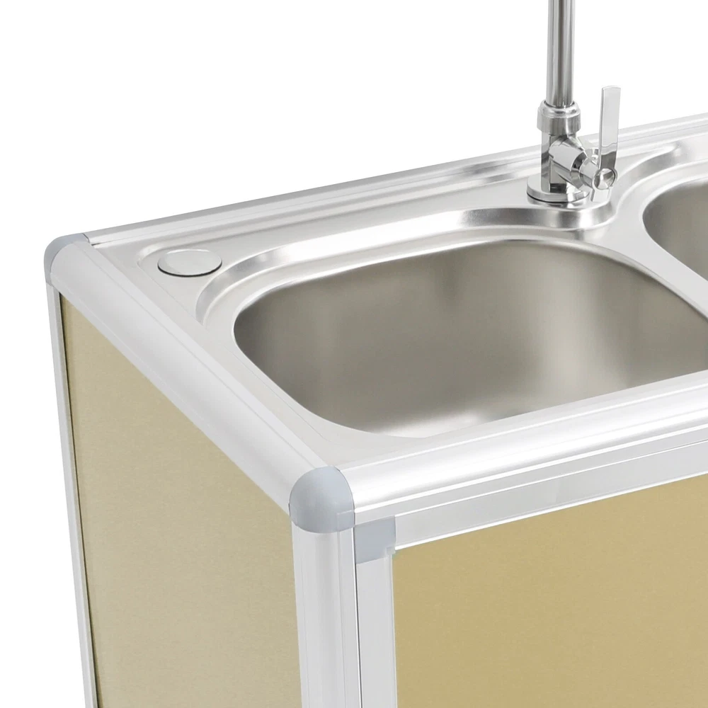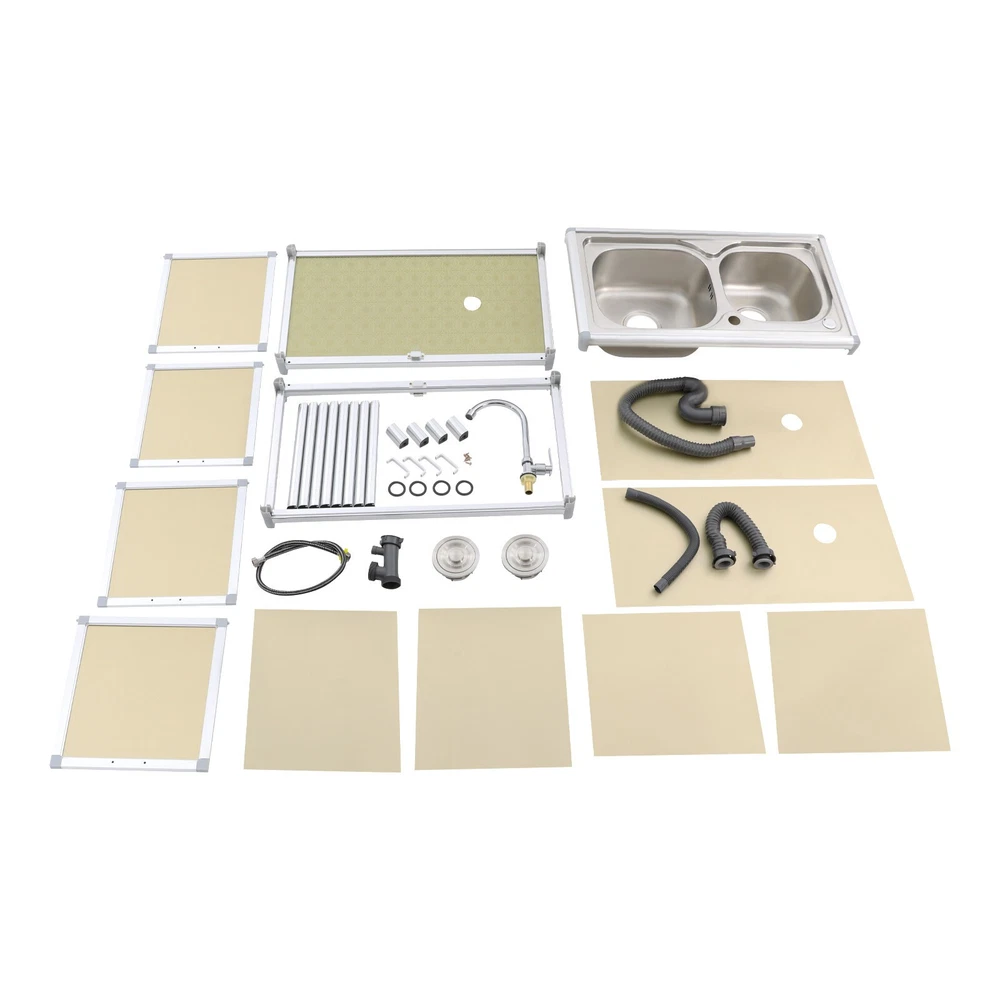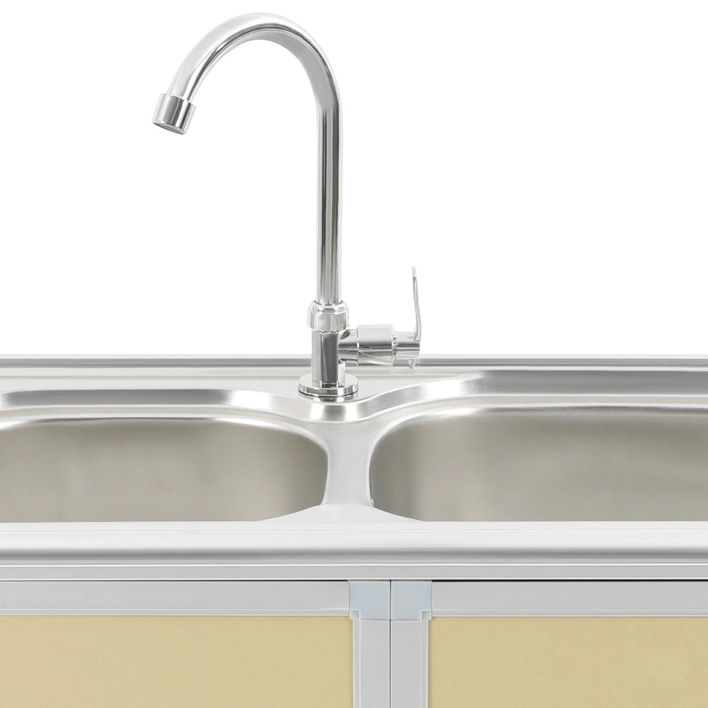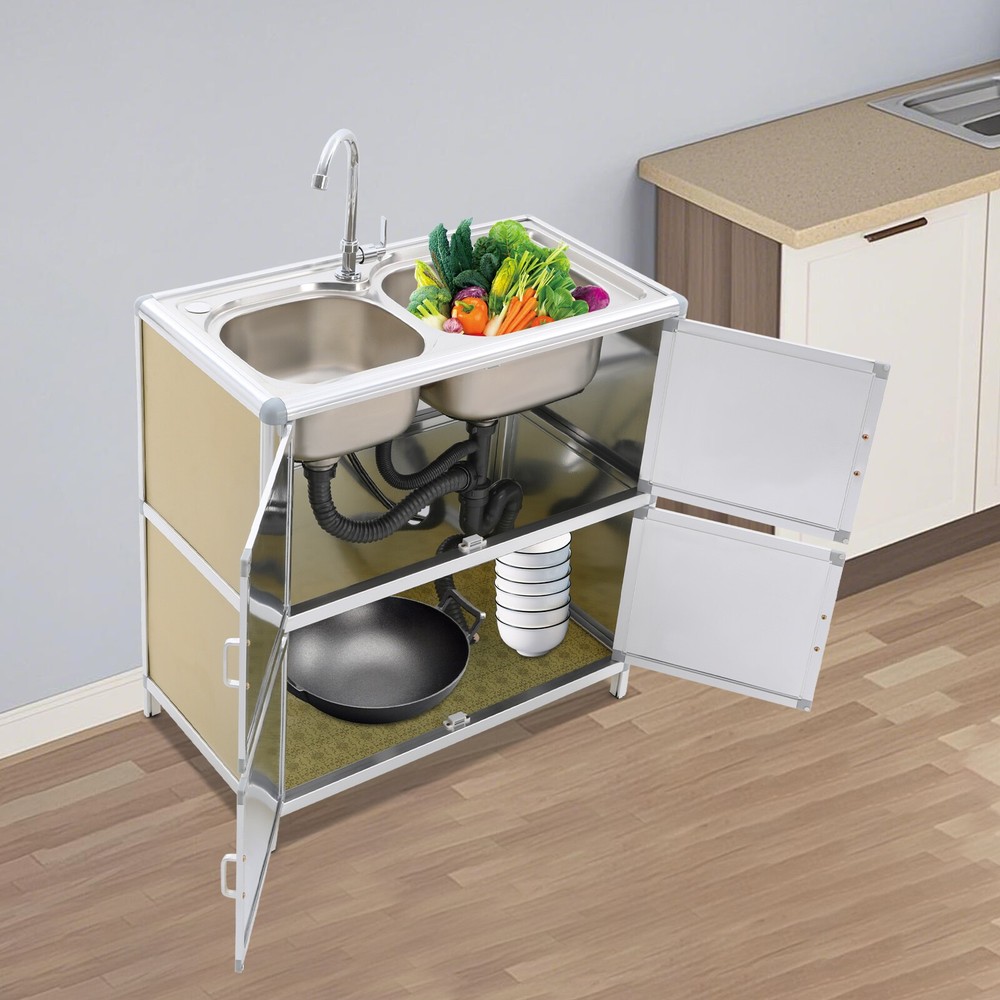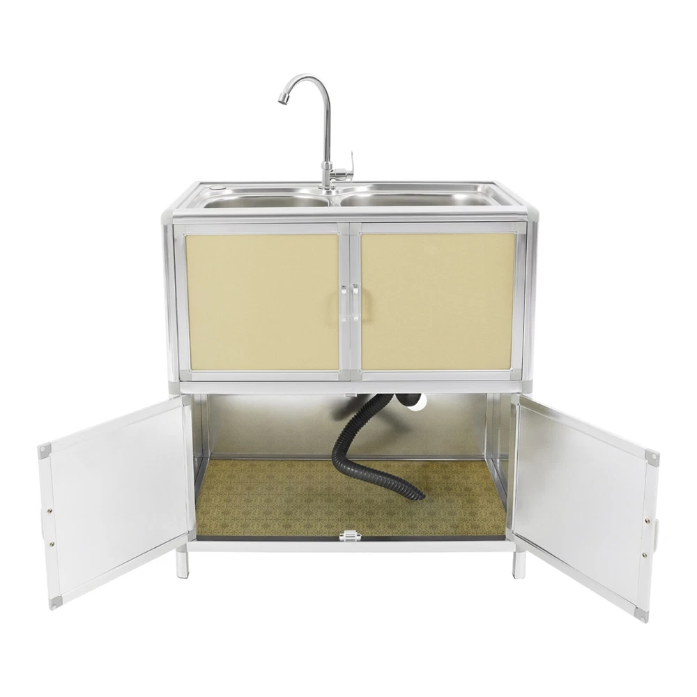 Specification Material: Aluminum Plastic Panel, 201 Stainless Steel, Aluminum Alloy, Plastic, Tempered Glass Color: Gold Style: Modern Assembly Required: Yes Mounting Type: Free Standing Faucet Rotation Angle: 360° Inlet Pipe Interface Specification: 1/2'' Inlet Pipe Length: 80cm/31.5in Drainpipe Length: 80cm/31.5in Door Panel Thickness: 2mm/0.08in Foot Height: 6cm/2.36in Each Door Height: 32cm/12.6in Cabinet Inner Max. Load Capacity: 10kg/22.05 lbs Product Size(Faucet Excluded): 75*42*80cm/29.53*16.54*31.5in Package Size: 81.5*49*27cm/32.09*19.29*10.63in Gross Weight: 15kg/33.07 lbs Net Weight: 13kg/28.66 lbs Package Included 1* Kitchen Sink with Cabinet 1* Faucet 1* Inlet Pipe Other Accessories for Assembly Modern Kitchen Sink Freestanding Sink with Cabinet/Faucet for Home Kitchen New Description This kitchen sink with a cabinet has a clean and practical design that combines modern aesthetics with functionality. Its overall visual effect is fresh and suitable for various home styles. The cabinet design helps organize daily cleaning supplies and makes your kitchen tidier. The 201 stainless steel sinks are safe to use with excellent corrosion resistance and easy cleaning. It will be your right hand for daily kitchen tasks. Key Features Made to Last: The 201 stainless steel basins are non-toxic and rustproof for safe, reliable, and healthy to use, the aluminum plastic panels are waterproof , heat-resistant , insect-proof , corrosion-resistant , and not easily deformed for high durability, and the aluminum alloy frame is anti-oxidation and high-strength to enhance the structure's stability. All these allow this product to accompany you for years. Integrated Cabinet Design: This product integrates sink and cabinet design, making it not only meet daily cleaning needs but also provide extra storage space for storing detergents, cleaning supplies, or kitchen essentials, keeping your space organized and clutter-free . It is a worthy space-saving solution for small kitchens or tight corners. Excellent Drainage: The double-layer sewer structure refuses to block. The filter basket can effectively prevent food residue and other blockages in the drainage pipe, and is easy to collect and clean. Large drainage holes and thoughtful drainage design can quickly drain water from the sink; S-bend pipes can also prevent odors. User Friendly: The raised edges around the sinks avoid water splashing from wetting the floor, and the sink overflow holes prevent water from overflowing and avoid damage to the home environment. The round corners reduce sharp corners and lower the risk of you and your family getting injured while playing or doing household chores in the kitchen. Convenient Faucet: This product is equipped with a single cold water faucet with a convenient handle and a 360° rotatable design , which provides smooth water flow, makes it ideal for the double-basin sink , and facilitates various cleaning operations such as washing vegetables, dishes, and hands. Modern Appearance: The overall design of the product is simple and elegant, with a metal frame and light gold cabinet that are fresh and beautiful, making it suitable for various home styles and adding a sense of fashion to the kitchen or laundry room. Effortless Cleaning: It has a smooth surface and a simple structure, so you only need to wipe the dust or residue with a towel(not included). The rounded corner design of the sink will not hide dirt, making it convenient for you to rinse the sink directly with water. Ideal Gift: With good performance and a modern appearance, you can give it as an ideal housewarming gift to your family or friends, providing convenience for their lives. Buy with Confidence: We stand behind all our guests and look forward to assisting you with your purchase. It is our pleasure to answer your confusion and questions. The end of the story between us is not "we sell and you buy". Details Practical Handles: The handles on the cabinet doors allow you to open and close the doors easily for convenient access to items. Sturdy Support Feet : They keep the product stand stable and prevent it from sliding or shaking. Hard Plastic Connectors: They boast high hardness and ensure the product's stability for a prolonged service life. Application It is suitable for the kitchen, bathroom, garden, patio, courtyard, restaurant, laundry, basement, garage, workstation, dessert shop, cafeteria, bar, cleaning room, balcony, and so on. Specification Material: Aluminum Plastic Panel, 201 Stainless Steel, Aluminum Alloy, Plastic, Tempered Glass Color: Gold Style: Modern Assembly Required: Yes Mounting Type: Free Standing Faucet Rotation Angle: 360° Inlet Pipe Interface Specification: 1/2'' Inlet Pipe Length: 80cm/31.5in Drainpipe Length: 80cm/31.5in Door Panel Thickness: 2mm/0.08in Foot Height: 6cm/2.36in Each Door Height: 32cm/12.6in Cabinet Inner Max. Load Capacity: 10kg/22.05 lbs Product Size(Faucet Excluded): 75*42*80cm/29.53*16.54*31.5in Package Size: 81.5*49*27cm/32.09*19.29*10.63in Gross Weight: 15kg/33.07 lbs Net Weight: 13kg/28.66 lbs Package Included 1* Kitchen Sink with Cabinet 1* Faucet 1* Inlet Pipe Other Accessories for Assembly Notes Please measure the length and width of the space and check the product's size to make sure it fits your needs before purchasing. Please try to avoid using hard objects such as shovels or steel wire balls to avoid scratching the surface of the stainless steel. It is recommended to use a soft cloth or sponge as much as possible for wiping . Please allow the slight color difference caused by the shooting light and 1-3cm error due to manual measurement, and make sure you do not mind before ordering. Payment Delivery details Terms of sales About us Contact us Payment We accept ebay payment 。 Fees such as import duties, taxes are not included in the item price or shipping costs. These charges are the buyer's responsibility. Delivery details Shipping: 2-9 working days to: USA Terms of sales We maintain h