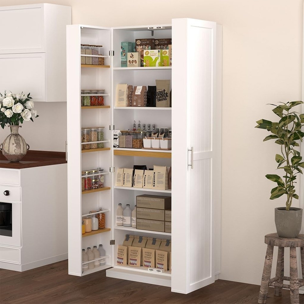 Product Description About this item • GENEROUS STORAGE CAPACITY: Boasting an upgraded large size (29.9"W x 15.74"D x 71.65"H), this cabinet offers ample space to organize kitchen essentials, from tableware to snacks, making it ideal for kitchens, living rooms, and more. • CUSTOMIZABLE INTERIOR: Equipped with three height-adjustable shelves, the pantry allows you to create a tailored storage solution for items of varying sizes, ensuring optimal organization and easy access. • CONVENIENT RETRACTABLE PANELS: Enjoy added functionality with built-in retractable panels inside the cabinet, providing temporary surface space for placing items while cooking or organizing. • DURABLE AND SAFE CONSTRUCTION: Crafted from high-quality MDF with an elegant smooth finish, this freestanding cabinet is not only visually appealing but also built to last. The widened, weighted base and anti-tipping device ensure stability and safety. • VERSATILE SPACE-SAVING DESIGN: This pantry cabinet's space-saving design makes it a practical storage solution for various settings, including homes and offices, offering both functionality and a touch of elegance. Specification Main Color: White Main Material: MDF Product Dimensions:29.9"×15.74"×71.65" Product Weight:119.5lbs Package Size:74"×17.1"×7.48" Weight:128lbs On Aug 10, 2025 at 23:06:32 PDT, seller added the following information: