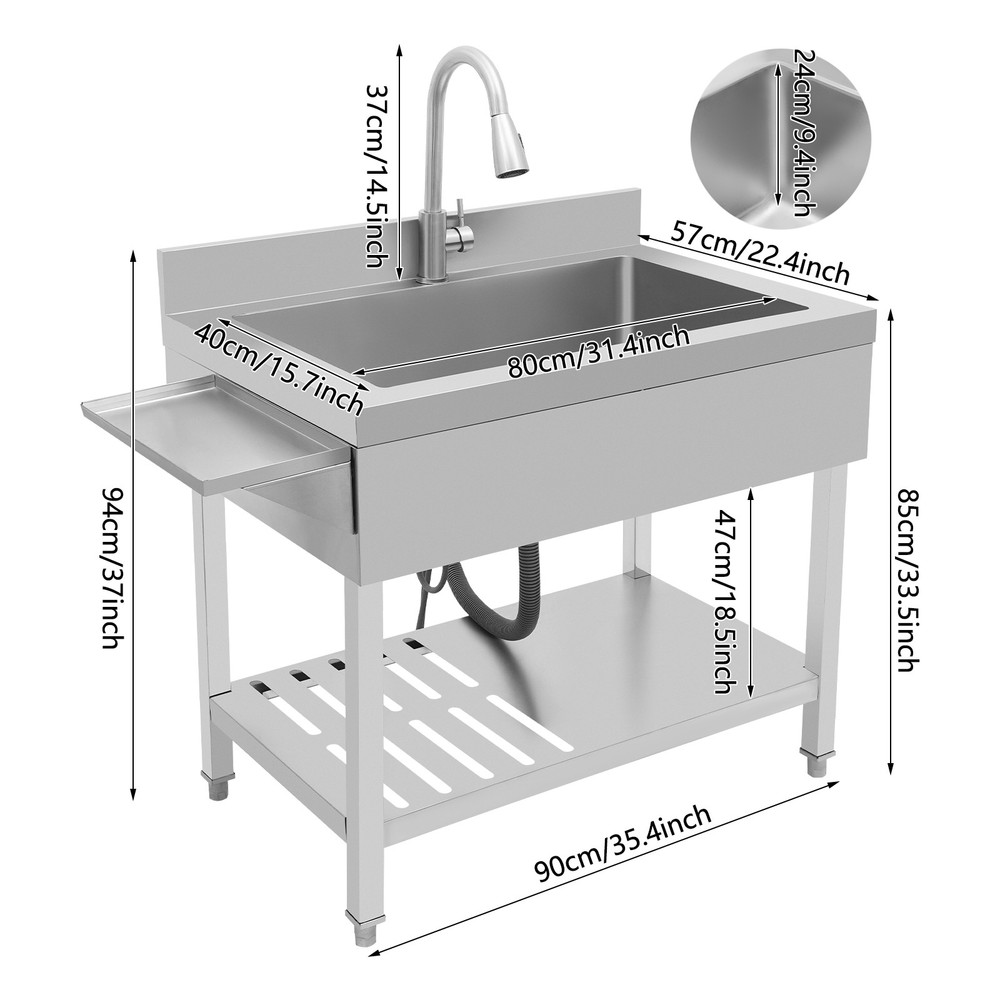 Specifications Color: Silver Material: Stainless Steel Process: Drawing, Welding Mount Type: Free Standing Assembly Required: Yes Faucet Outlet Type: 2 Types Adjustable Feet Range: 1-3cm/0.39-1.18in Faucet Pull-out Length: 60cm/23.62in Max. Load Bearing Capacity: 150kg/330.69lbs Inlet Connection Diameter: 2cm/0.79in Inlet Pipe Length: 60cm/23.62in Outlet Pipe Length: 80cm/31.5in Product Overall Size: 89.92*56.9*93.98cm/35.4*22.4*37in Faucet Height: 36.83cm/14.5in Sink Inner Size: 79.76*39.88*23.88cm/31.4*15.7*9.4in Tier Height: 46.99cm/18.5in Package Size: 95*63*40cm/37.4*24.8*15.75in Gross Weight: 24kg/52.91lbs Net Weight: 22.8kg/50.27lbs Package Included 1* Stainless Steel Sink 1* Faucet 2* Inlet Pipes 1* Outlet Pipe 1* Gravity Ball Other Needed Accessories Freestanding Sink Unit Single Bowl Kitchen Sink Unit w/ Pull-Out Fauce Silver Application The product is suitable for use in kitchens, bathrooms, farms, backyards, garages, laundries, homes, restaurants, bars, hotels, cafes, milk tea stores, school cafeterias, dessert stores, cafeterias, and other places for cleaning food, fruits, vegetables, utensils, and so on. Specifications Color: Silver Material: Stainless Steel Process: Drawing, Welding Mount Type: Free Standing Assembly Required: Yes Faucet Outlet Type: 2 Types Adjustable Feet Range: 1-3cm/0.39-1.18in Faucet Pull-out Length: 60cm/23.62in Max. Load Bearing Capacity: 150kg/330.69lbs Inlet Connection Diameter: 2cm/0.79in Inlet Pipe Length: 60cm/23.62in Outlet Pipe Length: 80cm/31.5in Product Overall Size: 89.92*56.9*93.98cm/35.4*22.4*37in Faucet Height: 36.83cm/14.5in Sink Inner Size: 79.76*39.88*23.88cm/31.4*15.7*9.4in Tier Height: 46.99cm/18.5in Package Size: 95*63*40cm/37.4*24.8*15.75in Gross Weight: 24kg/52.91lbs Net Weight: 22.8kg/50.27lbs Package Included 1* Stainless Steel Sink 1* Faucet 2* Inlet Pipes 1* Outlet Pipe 1* Gravity Ball Other Needed Accessories Notes Please check the size carefully before ordering. Please use the product within its maximum load-bearing capacity to ensure safe use. Please allow the slight color difference caused by the shooting light and 1-3cm error due to manual measurement, and make sure you do not mind before you order. Payment Delivery details Terms of sales About us Contact us Payment We accept ebay payment 。 Fees such as import duties, taxes are not included in the item price or shipping costs. These charges are the buyer's responsibility. Delivery details Shipping: 2-9 working days to: USA Terms of sales We maintain high standards of excellence and strive for hundred percent customer satisfaction. Feedback is very important to us. We hope that you contact us immediately before you give neutral or negative feedback, so that we can address your concerns. It is impossible to address issues if we do not know about them! About us Your satis faction is our ultimate goal. We work hard to earn your trust and future business. Our certified technicians have tested each item before shipping. The unit comes with 1 year limited warranty on all manufacturing defects. a) If you receive a defective item, you may return it or ask for a discount. Please contact us within 14 days after you receive the package. b) What you returned must be intact and in its original packaging as re? u. Customer is responsible for shipping costs of the returned item. c) We will cover the cost of shipping back t with the shipping rate indicated in the registration page. We will send you a new unit or refund the full payment you paid. Thank you. Contact us Business Hour Business Hour: Monday To Friday: 8:30 AM to 5:00 PM (Beijing China time) Due to time zones, our reply to your questions may not be immediately. But within above working time, we will reply your email within 24 hours. If it's non-workdays, please kindly be patient and wait till Monday. Please contact us with ebay message. Please feel free to contact us if you have any questions. Monday To Friday: 8:30 AM to 5:00 PM (Beijing China time) Due to time zones, our reply to your questions may not be immediately. But within above working time, we will reply your email within 24 hours. If it's non-workdays, please kindly be patient and wait till Monday. Please contact us with ebay message. Please feel free to contact us if you have any questions.