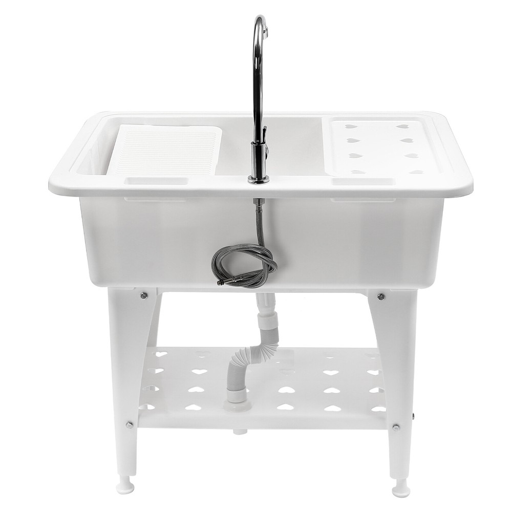 White Utility Sink Laundry Tub Freestanding Sink Wash Station w/ Faucet Home Description Made of high-quality PP, this laundry sink is sturdy and durable, with strong load-bearing capacity and stability. The versatile white color appearance and smooth lines can fit well with various home decor styles. The non-drilling and hand-screwing design makes installation easier, and its large sink size provides you with enough cleaning space. With this product, you can do laundry while standing, avoiding the strain of bending over for long periods. Key Features Selected Material: The premium PP with the injection molding process makes this product environmentally friendly, rustproof, and acid and alkali-resistant , ensuring a long service life. Ergonomic Design: The 29.92" overall height(not including the faucet) reduces the frequency of bending and the burden on your waist. The water-stopping edge around the sink prevents water from splashing onto the floor and keeps the floor dry to avoid slipping. High Stability: Thickened material(thickness: 2.8mm), four supporting lage, stable rectangular structure, strong screw fixation, and reinforcing rib make its weight capacity up to 220.46 lbs, and the 1.18in adjustable feet on the bottom of the sink can adapt well to uneven ground, making the product more stable and safer to use. Large Size: The large sink size (32.28*22.44*9.84 in) allows you to clean large amounts of clothes and wash pet cats and dogs inside. Its large capacity (29.06gal) makes it a convenient water storage sink when plugging the drain stopper. Effortless Installation: Its simple structure, standard threaded connector, convenient wing nuts, and complete installation accessories allow you to easily complete the installation in a short time without additional tools. Washing Assistant: A 360° rotatable high faucet (height: 13.39 in) with a comfortable handle allows you to easily adjust the water flow, and achieve dead-end cleaning. In addition, a removable washboard and a drain board can adapt to your different needs, and the surface of the washboard is designed with an inverted triangle to better remove stains. The bottom of the sink is designed with a concave center to drain water quickly. Hollow-out Design: The lower shelf and the drain board are multiple hollows, helping quickly filter the residual water on the washing items, so it is not easy to breed bacteria . Easy to Clean: Due to the smooth surface, simple structure, and open design, you can easily wipe off the dirt on it with a soft cloth. Ideal Gift: This product is stylish and high-quality and can be used as an ideal housewarming, birthday, and holiday gift for parents, friends, and loved ones. Good Customer Service: We stand behind all our guests and look forward to assisting you with your purchase. It is our pleasure to answer your confusion and questions. The end of the story between us is not "we sell and you buy". Details Soap Grooves: Three soap grooves with holes can help place the soap and dry it, providing convenience for washing clothes. Stretchable Drain Pipe: It can be bent into the desired shape according to the installation needs, which is convenient for drainage. Raised Bottom: It facilitates cleaning but also increases the storage space. Smooth Edges: The rounded and smooth edges not only add to the aesthetics of the product but also improve the safety of use. Application It is suitable for cleaning clothes, pets, pots and pans, fruits, vegetables, meat, etc. in laundry rooms, bathrooms, utility rooms, garages, basements, kitchens, balconies, patios, gardens, and so on. It not only can be used as a laundry sink but also can be used as a storage rack, pet bathtub, baby bathtub, and so on. Specification Material: PP Color: White Process: Injection Molding Assembly Required: Yes Faucet Opening: Single Hole Installation Method: Freestanding Style: Modern Shape: Rectangular Faucet Adjustable Angle: 360° Maximum Bearing Capacity: 100kg/ 220.46 lbs Laundry Sink Capacity: 110L/ 29.06 gal Water Inlet Hose Length: 1 m/ 3.28ft Drain Pipe Length: 0.8m/ 2.62ft Faucet Height: 34cm/ 13.39 in Drain Board Size(L*W): 44.5*26cm/ 17.52*10.24 in Laundry Board Size(L*W): 48*23.5 cm/ 18.9*9.25 in Sink Size: 82*57*25 cm/ 32.28*22.44*9.84 in Bottom Shelf Size(L*W): 63*37.5 cm/ 24.8*14.76 in Bottom Shelf Height from the Ground: 18 cm/ 7.09 in Bottom Leg Height: 52 cm/ 20.47 in Adjustable Foot Height: 3cm/ 1.18in Product Height (Including Faucet): 110 cm/ 43.31 in Product Height (Not Including Faucet): 76 cm/ 29.92 in Thickness: 2.8mm/ 0.11in Gross Weight: 11kg/ 24.25 lbs Package Size: 83*57.5*31.5 cm/ 32.68*22.64*12.4 in Package Included 1* Laundry Sink 1* Faucet 1* Drain Board 1* Laundry Board 1* Drain Stopper 1* Water Inlet Hose 1* Drain Pipe All Accessories for Installation Notes Please allow the slight color difference caused by the shooting light and the 1-3 cm error due to manual measurement, and make sure you do not mind before ordering. Payment Delivery details Terms of sales About us Contact us Payment We accept ebay payment 。 Fees such as import duties, taxes are not included in the item price or shipping costs. These charges are the buyer's responsibility. Delivery details Shipping: 2-9 working days to: USA Terms of sales We maintain high standards of excellence and strive for hundred percent customer satisfaction. Feedback is very important to us. We hope that you contact us immediately before you give neutral or negative feedback, so that we can address your concerns. It is impossible to address issues if we do not know about them! About us Your satis faction is our ultimate goal. We work hard to earn your trust and future business. Our certified technicians have tested each item before shipping. The unit comes with 1 year limited warranty on all manufacturing defects. a) If you receive a defective item, you may return it or ask for a discount. Please contact us within 14 days after you receive the package. b) What yo