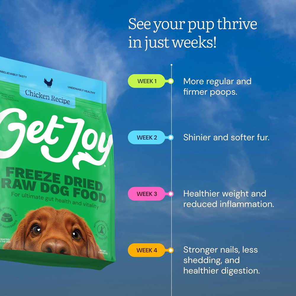 Store New Arrivals Add to Favorite View Feedback Contact Freeze Dried Raw Chicken Dog Food, High Protein Grain Free Meal, Topper & Treat, Gut Health Support with Probiotics, Small to Large Breed, 32Oz Bag Description Age Range Description All Life Stages Number of Items 1 Color Brown Age Range (Description) All Life Stages Package Dimensions 12.6 x 9.41 x 3.78 inches; 2.07 Pounds Specific Uses For Product Digestive Health Item Weight 2.07 pounds Department unisex-adult Target Audience Keyword Dogs, dogs Flavor Name Fresh Freeze Dried-Chicken Directions Rehydrate with water according to serving size recommendations on the bag. Flavor Fresh Freeze Dried-Chicken Size 2 Pound (Pack of 1) Item Form Pellet Specific Uses for Product Digestive Health Item Package Dimensions L x W x H 12.6 x 9.41 x 3.78 inches Breed Recommendation All Breed Sizes FREEZE DRIED RAW DOG FOOD CHICKEN RECIPE: Grain free raw dog food made with 100% USDA chicken, organ meats, and superfoods for balanced nutrition and freeze dried freshness for big flavor and taste your dog craves. DOG FOOD WITH BELLY BIOTICS: Prebiotics, probiotics, and postbiotics work together to support gut health, digestion, immunity, and overall dog wellness. DIGESTIBLE HIGH PROTEIN DOG FOOD: Freeze dried raw dog food with leading 97% nutrient retention for better nutrient absorption and digestion, supporting muscles and sustained energy. DOG FOOD TOPPER OR COMPLETE MEAL: Use as a freeze dried dog food full meal, topper to boost their bowl or even a treat. Free from grains, fillers, preservatives, or artificial additives. RAW DOG FOOD FOR ALL BREEDS & AGES: Developed by a PhD animal nutritionist and recommended by vets, with the right balance of protein, fat, carbs, and fiber for puppies, adults, and seniors. Product description The video showcases the product in use. The video guides you through product setup. The video compares multiple products. The video shows the product being unpacked. How to Rehydrate Freeze Dried Raw Dog Food Merchant Video ABOUT US We offer the best prices around on high quality products. Our E-store includes media such as books, movies, music and games while offering electronics, toys, sporting apparel, clothing, tools, general home, garden items and more. SHIPPING We are always working hard to ensure your package arrives as soon as possible. Please understand that some factors like weather, high postal traffic, and the performance of shipping companies are outside of our control. We offer free shipping to the lower 48 states and ship within 2 business days of payment, usually sooner. We do not accept P.O. Boxes. Please provide a physical address. RETURNS We offer a 30-Day Return Policy on items which you are not completely satisfied with. You have the option for a full-refund or an exchange of the item. No returns are available on items shipped outside of the USA. PAYMENT We accept PayPal. CONTACT US This page content is yet to come Please ad us to your favorite seller and visit again later Thank You CUSTOMER SATISFACTION We try our very best to make sure every customer is completely satisfied. If there's a problem, message us! We're happy to help.