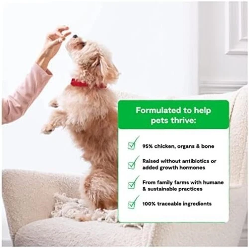 Freeze Dried Raw Dog Food, Humanely Raised Meat Recipe with Non-GMO Superfoods and No Artificial Flavors or Preservatives Ounce Pack of 1, Harvest Chicken Recipe HARVEST CHICKEN RECIPE: Our humanely raised chickens are naturally raised on family farms with gentle handling, space, and the ability to engage in their natural behaviors. Our chickens are fed a healthy vegetarian diet without antibiotics or growth hormones. Chicken is a great source of protein and healthy fats. MORE WAYS TO FEED: Boost their kibbles with the ultimate meaty taste that can't be beat by other wet mixers or toppers. Mix it into meals as either dry nuggets or use its absorbency to rehydrate it with a little water for soft, moist bites. FULL COVERAGE NUTRITION: Treat any breed to nature’s best-- a blend that uses bits of meat and vegetables to supply vital health benefits through protein and probiotic fiber, all in a small resealable travel pouch container for easy scoop and serve. FROM FARM TO BOWL: Dogs crave meat by wild primal instinct, so our recipe makes it the 1st ingredient. Then we skip the wheat, corn, and potato in favor of fresh superfoods like pumpkin and blueberries for extra wellness and an honest balanced diet. 100% TRANSPARENCY: As a part of our commitment to transparent sourcing practices, we provide owners with the ability to trace the origin of every ingredient using the lot number on the bag, because where pet foods come from shouldn’t be a mystery. FREEZE DRIED RAW: Gently freeze-dried, never cooked, easy-to-feed pure raw nutrition. Antibiotic, hormone, and steroid-free.