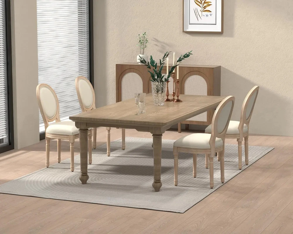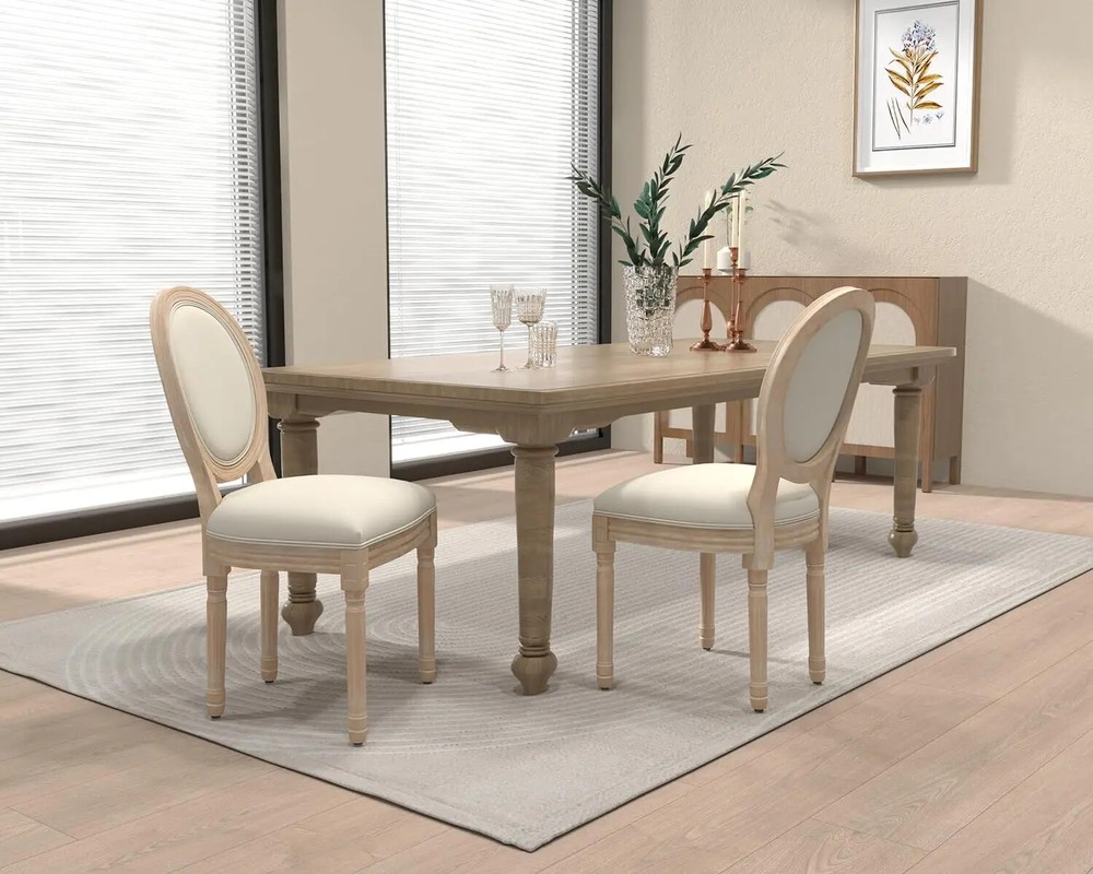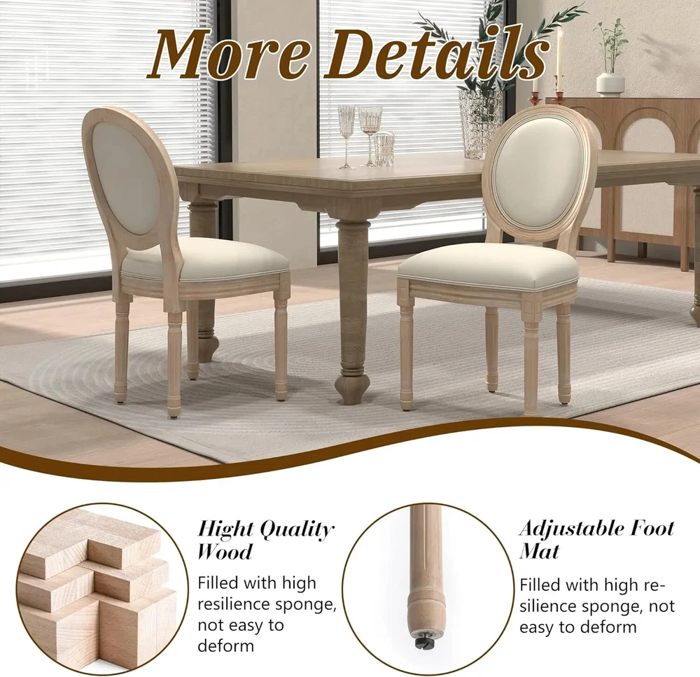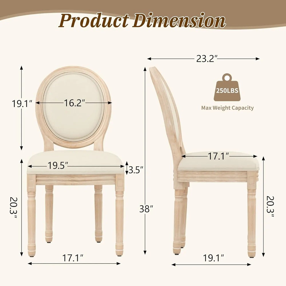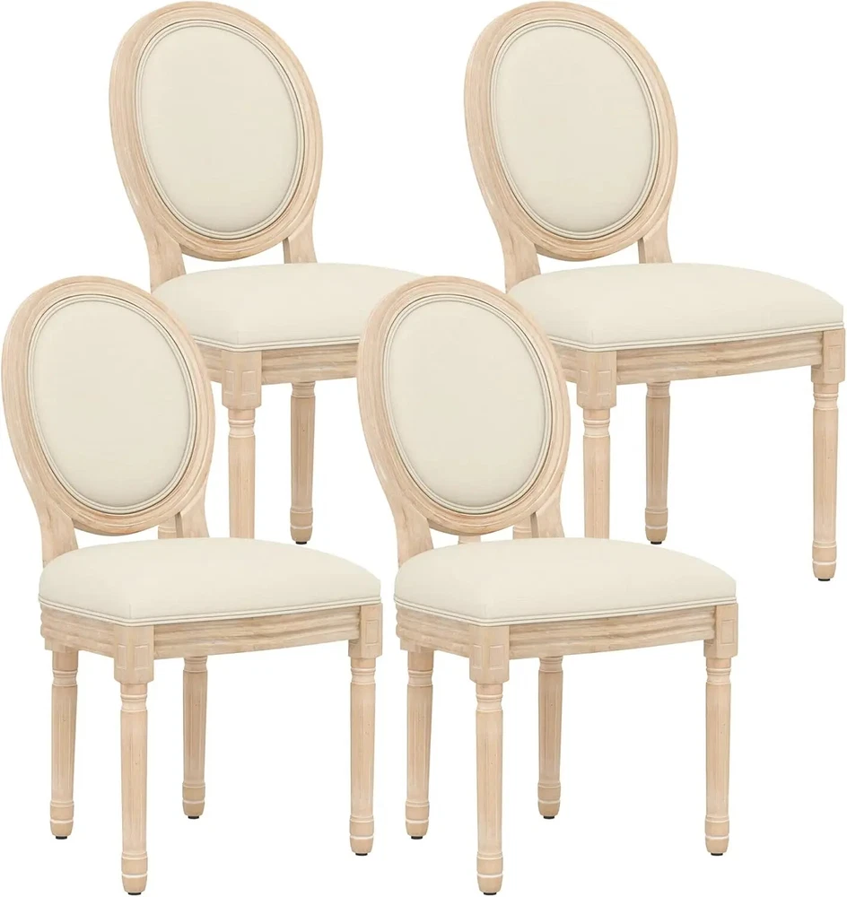 French Dining Chairs Set of 4, Upholstered Vintage Farmhouse Chair with Round Backrest, Mid Century Fabric Chairs with Solid Rubberwood Legs for Dining Room Kitchen Restaurant, Beige Color Beige+sponge Back Size Set of 4 Shape L-Shape Item Depth 22.4 inches Style Modern Assembly Required Yes About this item Chic French Style: Our set of 4 vintage French dining chairs, designed with an elegant and rustic style, equipped with upholstered dining chairs and exquisite wooden frames, elegance and nobility are everywhere, providing you with unparalleled comfort. The beautiful oak color collides with the soft fabric, creating a different French charm for your dining environment. Superior Construction & Sturdy Wood Frame:Solid wooden frame and rubber-wood legs make this Mid Century dining room chair sturdy and durable,Wooden legs with white footpads for more stability and protect your floor. Weight capacity: 250 LBS. [Suitable Size & Widely use]:Sized 22.4''DX19.5''WX38"H. French dining chairs are suitable for any home decoration, from the country farmhouse to the middle of the century to modern times. The fabric dining chair can be used in dining room, kitchen, living room, bedroom, dining room, dressing room, study and so on as dining chair, reading chair or tea corner chair. Comfy Seating Experience: The linen cushion and upholsytery round back make you feel extremely comfortable when sitting.This exquisite side chair adds features around the table, even anywhere.