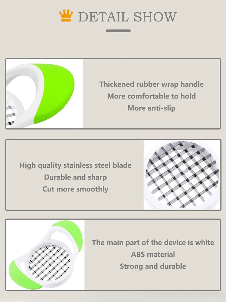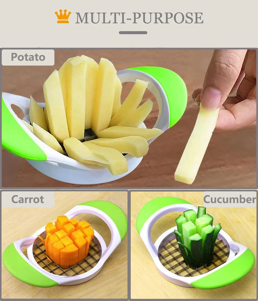 🎖️【Be Worth Having】This device is specially designed to make French fries and is perfect for everyday use in home life. In addition to the french fry cutter, it also comes with a potato peeler and a white cleaning brush, which is more cost-effective. Almost the same functions, for less money, get a three-piece set, what are you waiting for? Having them will bring more convenience and fun to your life. Small tool, big changes. As long as you use it, you will know its advantages 🎖️【Saves Space & Easy To Store】 The overall length of this potato Chopper is 7.09''(18cm), its overall width is 4.13''(10.5cm) and the circular inside diameter of the cutter section is approximately 3.54''(9cm); The length of the peeler is 5.51''(14cm) and its width is 2.75"(7cm); The total length of cleaning brush is 4.3"(11cm), the size of the bristle is approximately 1"(2.5cm) X 0.8''(2cm). Small size, can be stored in any spare place in your kitchen 🎖️【Beautiful Appearance & More Advantages】The lines of the fuselage are smooth and shiny; A good color match; The handle is wrapped with frosted textured TPR material, non-slip while giving you a comfortable grip; The white main part of the device is made of ABS material, which is strong and durable; The blade is made of high quality food grade thickened stainless steel material with double-sided cutting edge, which does not rust and is sharper, and has a longer service life. In short, let you look at it happy and use it comfortable 🎖️【Easy To Use & Cutting Efficient】 Are you getting tired of pulling out the cutting board and knife to try and cut perfectly shaped fries? With this device, you can perfectly prepare delicious French fries in just a few steps by following the instructions shown on the left. Simple operation. Save effort, save your time. It will be easy to prepare a delicious meal of French fries for family or friends. Warm tip: For better use, please slowly and firmly press down when cutting potatoes 🎖️【Multi-purpose & Easy To Clean】 This handheld French fries cutter is designed for Making fries, it can also be used to cut other fruits and vegetables such as cucumbers, onions, to meet your daily needs. Compared with other equipment with similar functions and complex structures, the more complex the structure, the more likely it is to cause food residues. This one has a simple structure, no other parts, a one-piece design, and almost no dead corners, so it is easier to clean (Clean with water and equipped brush, or in the dishwasher) 🎖️【Quality & After-sales Guarantee】 International standard production process, every French fry Maker has passed strict quality inspection and testing before being delivery. 24-hour online after-sales service, as long as you have any questions about the product, please feel free to contact us and give you a satisfactory solution(Refund or replacement). This is our promise to you. Your satisfaction is our concern