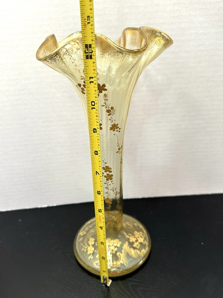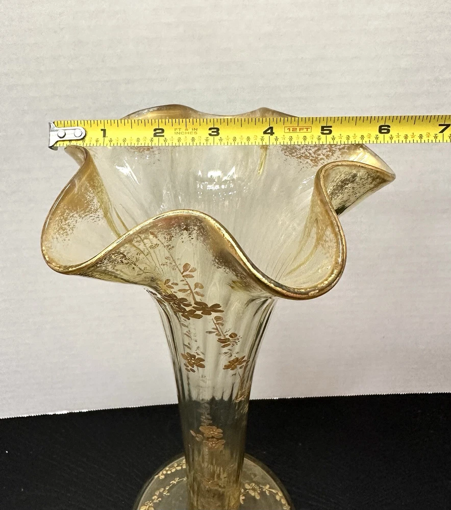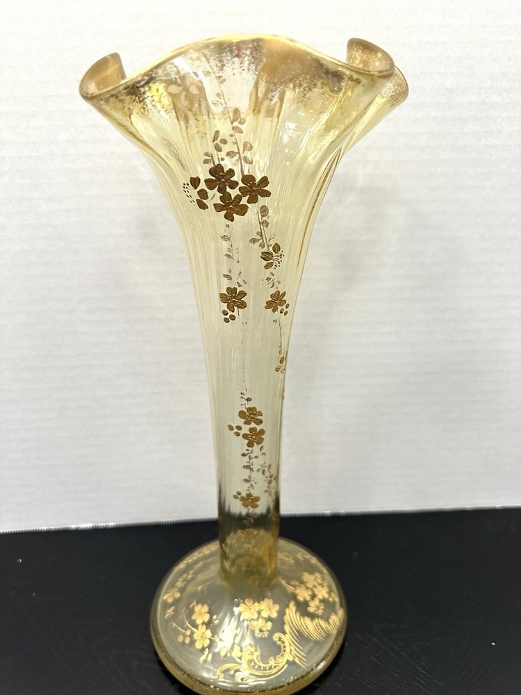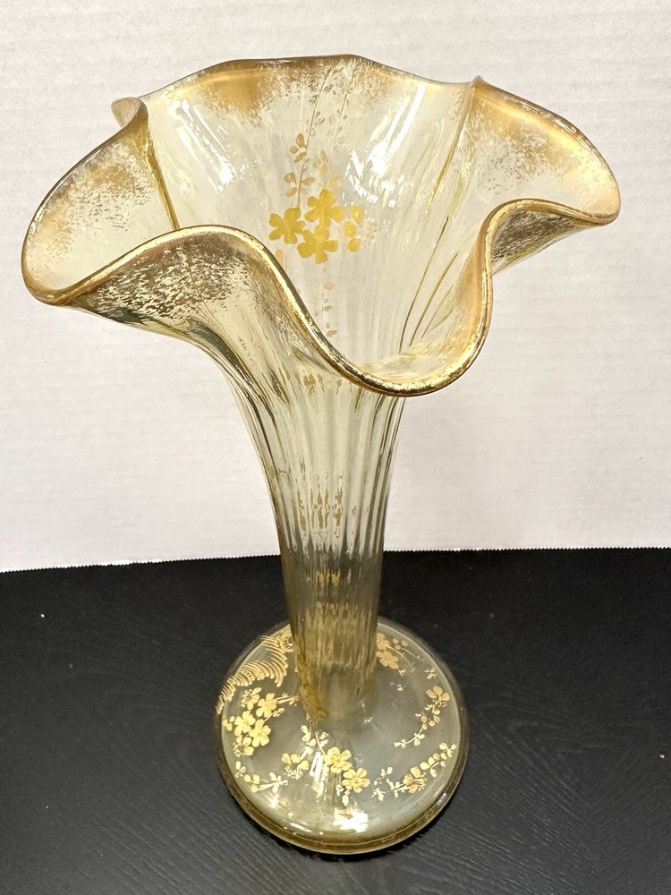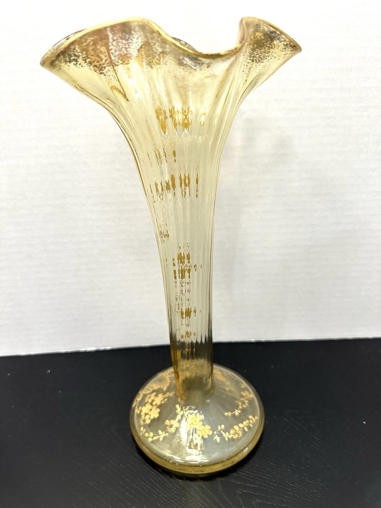 Rare Find Antique Glass Vase Gold Enamel Raised Art Ribbed With Flared Top This is a beautiful vase! This is a French Leglas vase Look at all the pictures of the art work.