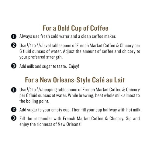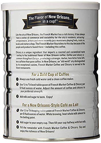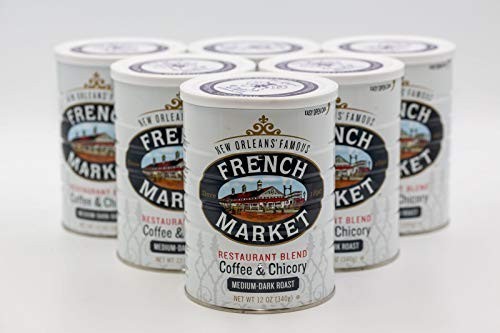 French Market Coffee ,Chicory Restaurant Blend Medium-Dark Roast Ground Coffee, 12oz Can ,Pack of 6. Item description from the seller: Our blends are bold, rich and handcrafted by master roasters in small batches, carefully sourced from the highest quality Arabica beans for a flavor as soulful ,as the city we call home. Enjoy this quintessential New Orleans coffee. We've been perfecting it for over 125 years. Original Coffee , Chicory: Delicious blend of exotic coffee beans dark roasted, with the finest imported French chicory adding magic, robust flavor, with no bitter aftertaste and less acid than regular coffee. Medium-Dark Roast Ground Coffee: Strong drip, remarkably smooth sip; 100percent Arabica coffee beans blended, with imported French chicory for a caramelized sweetness and smooth finish. A Cup of Craft Coffee the Vibe of New Orleans: Bold, rich coffee beans handcrafted by master roasters in small batches, carefully sourced from the highest quality Arabica Beans for a flavor as soulful as the city we call home. A Better Tomorrow: We help provide social, economic and environmental enhancements for farmers and the communities we work with thanks to our Sustainable Cup Project seedling program.