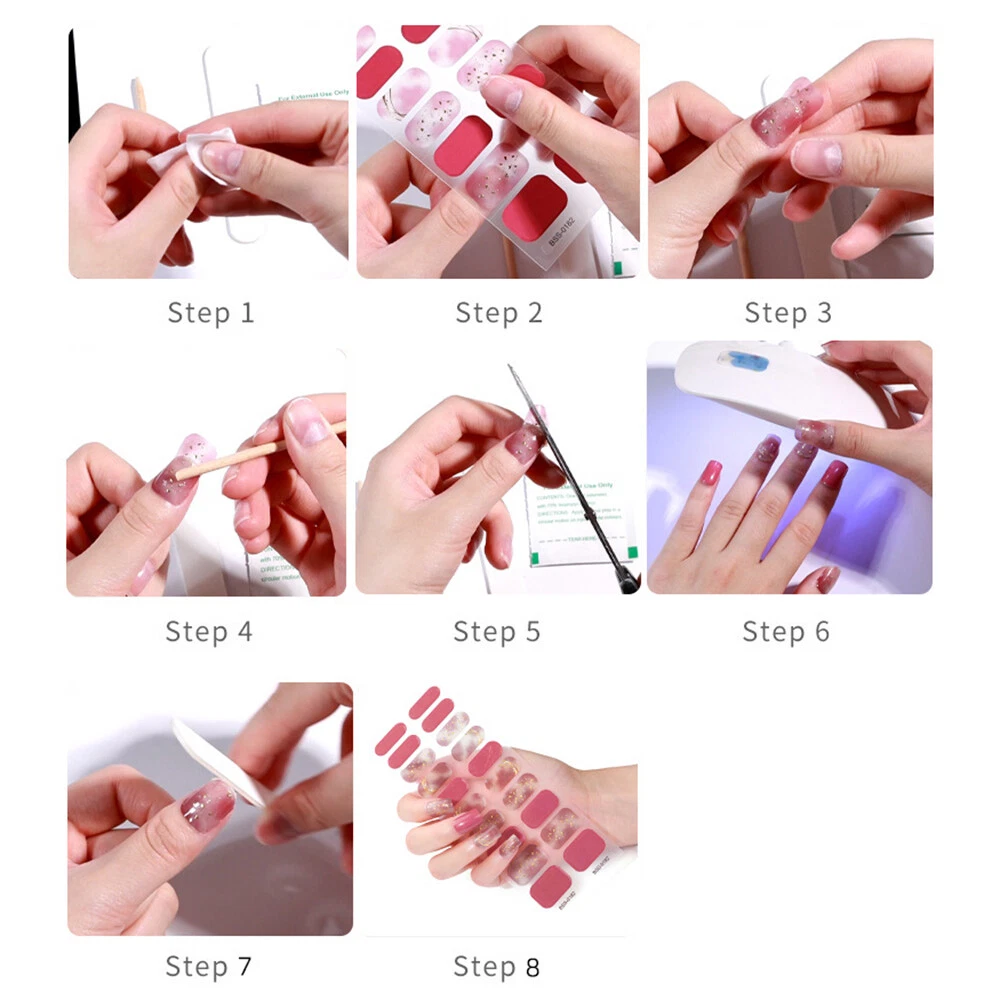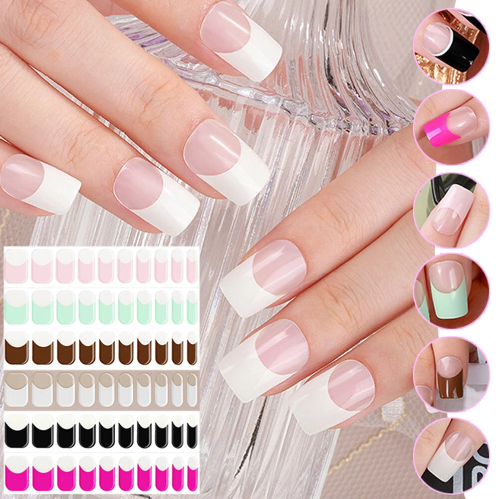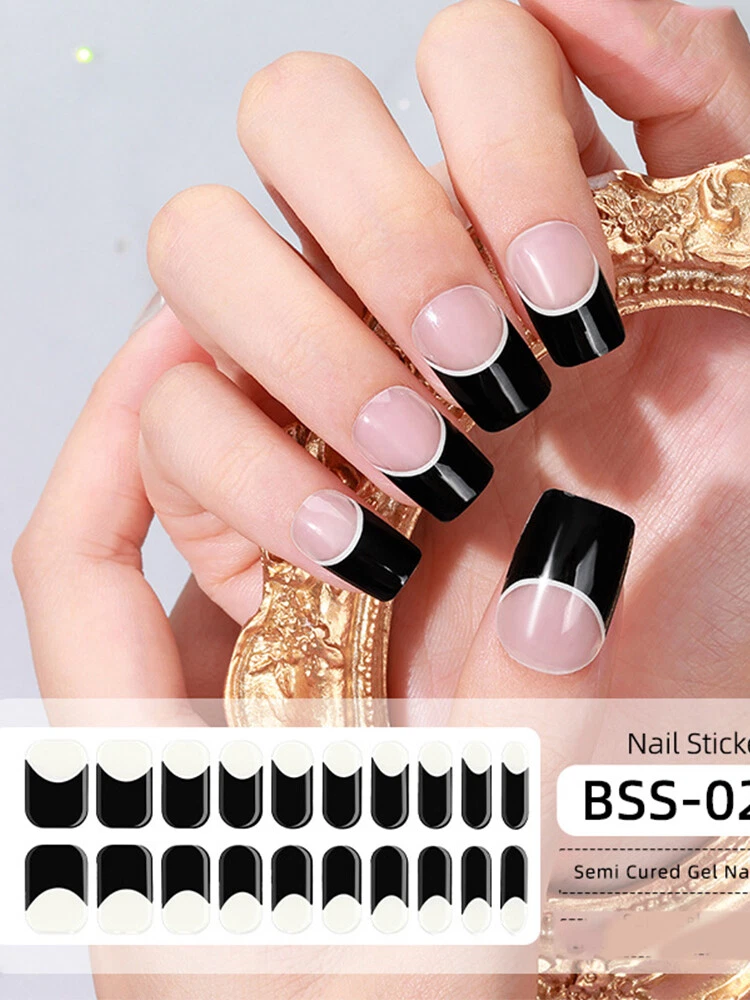 French Patch Full Cover Wraps Gel Nail Sticker UV Lamp Semi-Cured DIY Manicure Specification: Color:as the picture shows QTY:20 Tips/Sheet Color:As Show Package Include: 20 Tips/Sheet Nail Stickers 1 PC Alcohol Wipes 1 PC Nail File 1 PC Stick Features: What are semi-cured gel nail wraps stickers? 1.They are stickers made of real liquid gel and cured (or finalized) by 60%. 2.They are made of flexible and wearable material in order to fit most nail shapes and sizes. 3.After placing them on your nails and curing the remaining 40% with a UV lamp, the gel will completely harden, and the effect will be like applying colorful nail polish in a nail salon. 4.Semi-cured gel nail strips can also be dried naturally under the sun for 1-2 hours without UV light. HOW TO USE: 1. Smooth your nails with the nail file and clean your nails with cotton pads. 2. Choose the right size that fits your nails, peel off the protective films of the Gel Nail. 3. Place on the fingernails gently. 4. Use a small wood stick to press and flatten the edges of the nails. 5. Use scissors to cut off the excess gel nails, and then file the perfect shape with a nail file. 6. Cure the gel nails under UV/LED light. 7. Smooth the edges with a nail file. 8. Done! How To Remove: 1.Use the wood stick to lift gel nail wraps off your nails. 2.Clean your nails with cotton pads. ATTENTION: 1: Please use it immediately after opening it. 2: Please keep it in a film container after use, and use a sealing strip to avoid drying out. 3: Please keep it away from young children, and avoid eating by mistake. 4: Do not use it when your skin has a cut. 5: The colors may exist slight differences due to different screens. STORAGE: Please store in dark, cool and dry place to avoid hardening