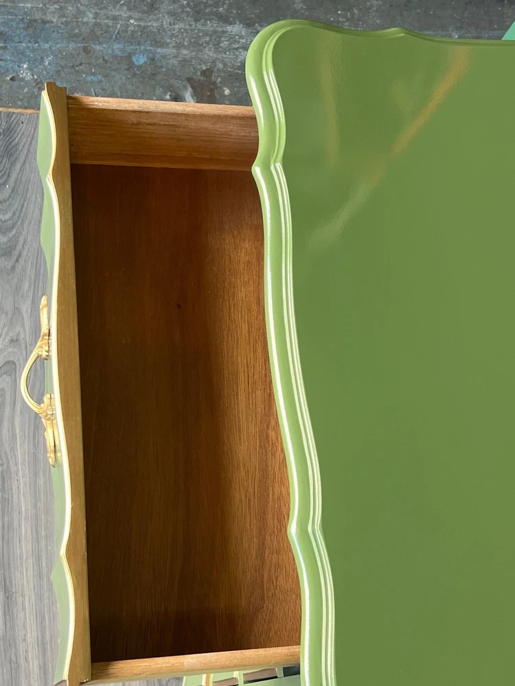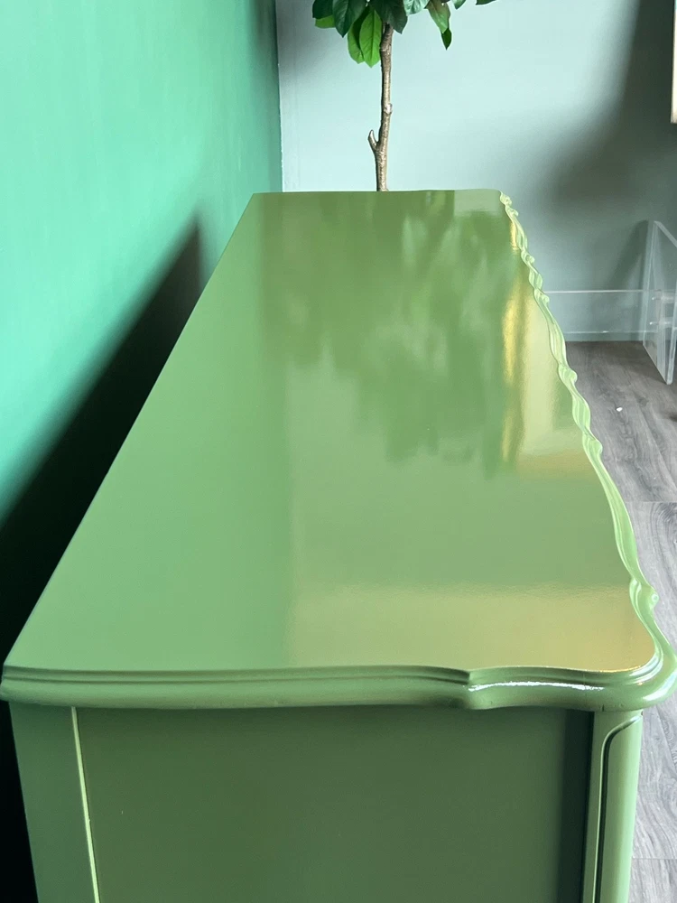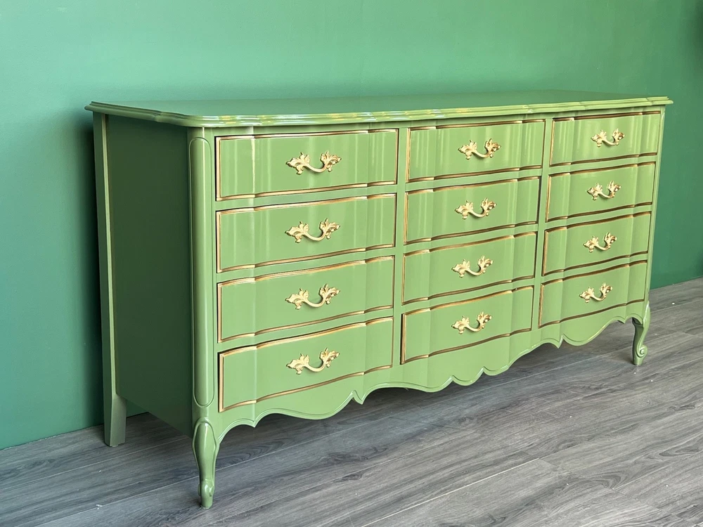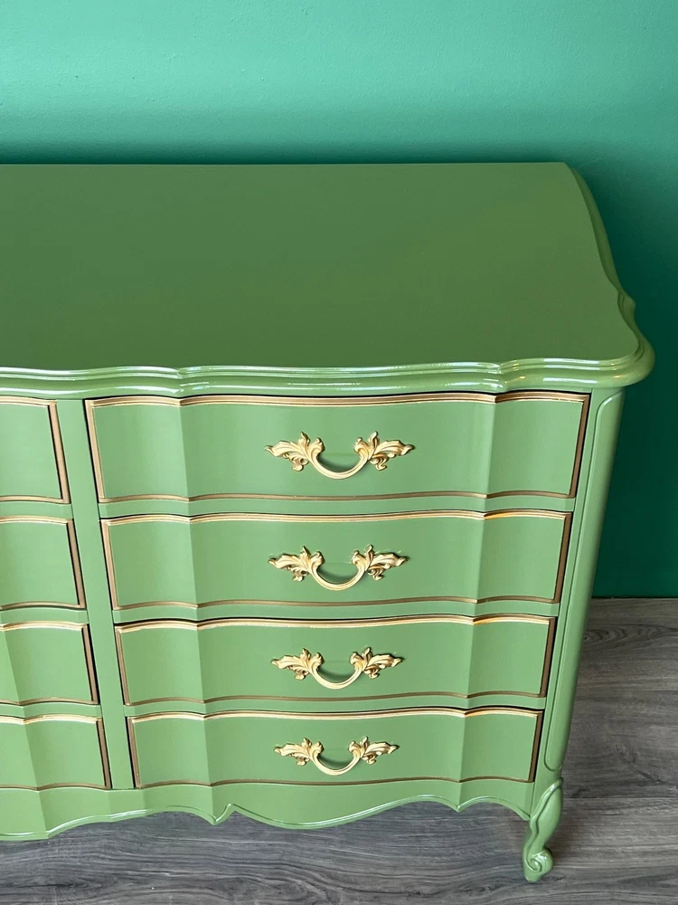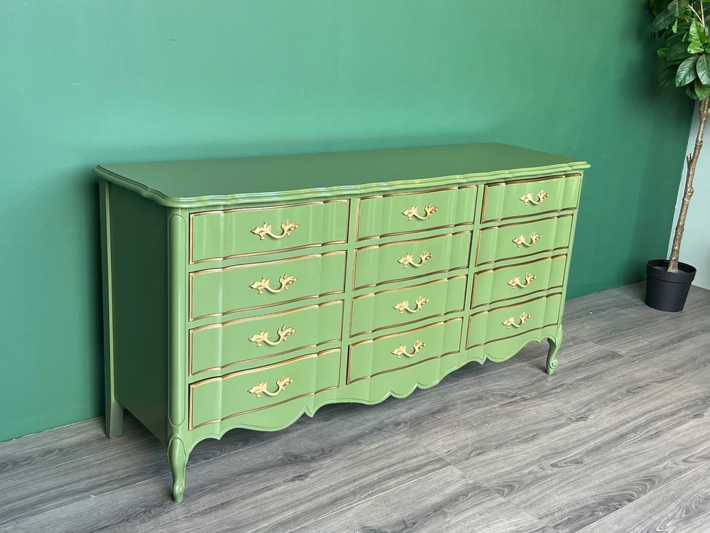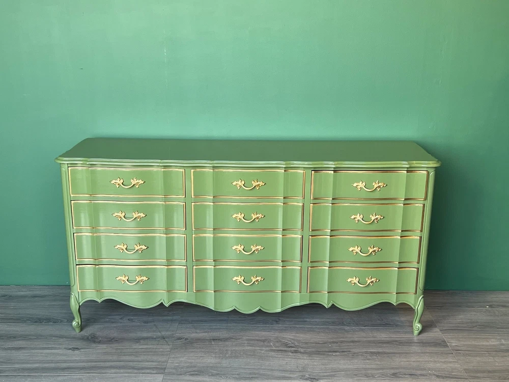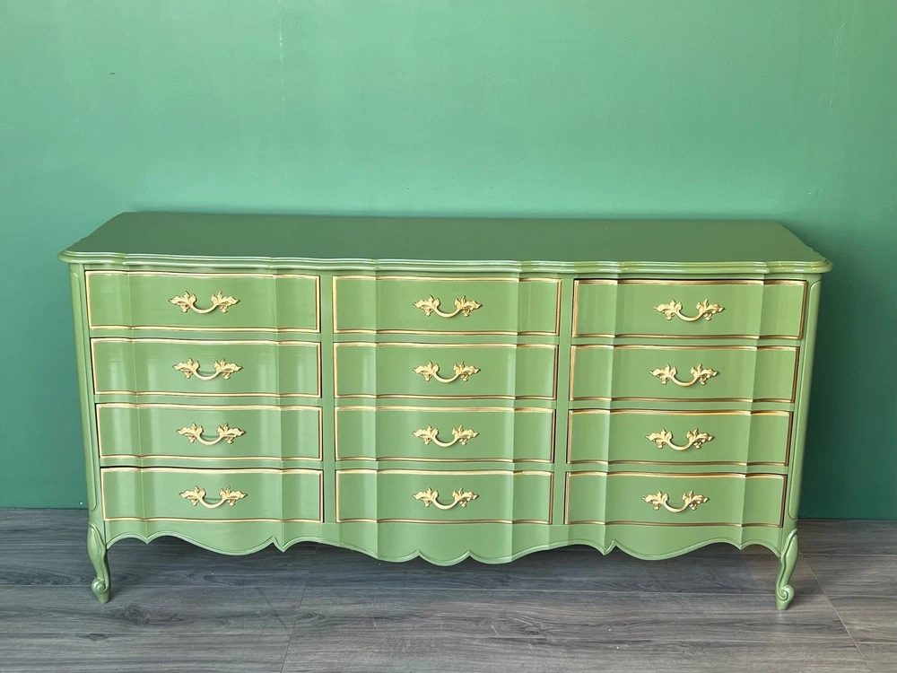 Vintage French Provincial Dresser by Dixie. This is a solid built dresser of twelve drawers with dovetail joints This dresser is newly refinished in a high gloss green lacquer with gold painted hardware Dimensions: 68”Width x 18”Depth x 34”Height See pictures and condition for reference SHIPPINDS IS NOT INCLUDED, SHIPPING WILL BE HANDLE SEPARATE IF YOU NEED ASSISTANCE WITH SHIPPING PLES LET US KNOW, THANK YOU