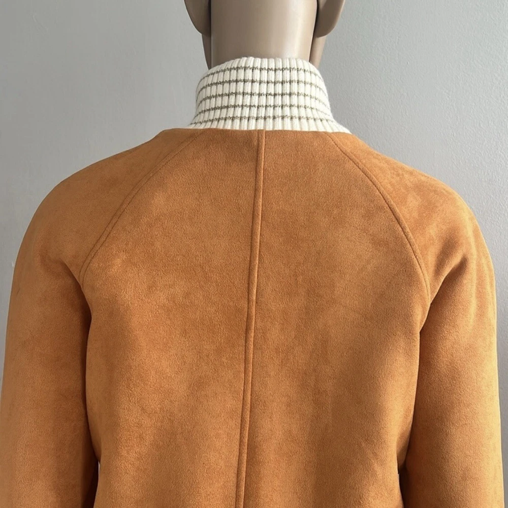 Shearling Suede Lambskin Camel Bomber Jacket Perfect condition! Size 36 USA Size 4 Approx measurements garment laying flat Pit to pit 19.5” Shoulder to hem 21” Sleeve measured from the pit 16.5” Main tag (that shows brand name) is missing. 70% lambswool 30% polyester Lining-100% polyester Made in France Color-Camel Front Full Zip closure Suede Pockets Faux fur lining Ribbed edges •No Returns No Holds No Trades
